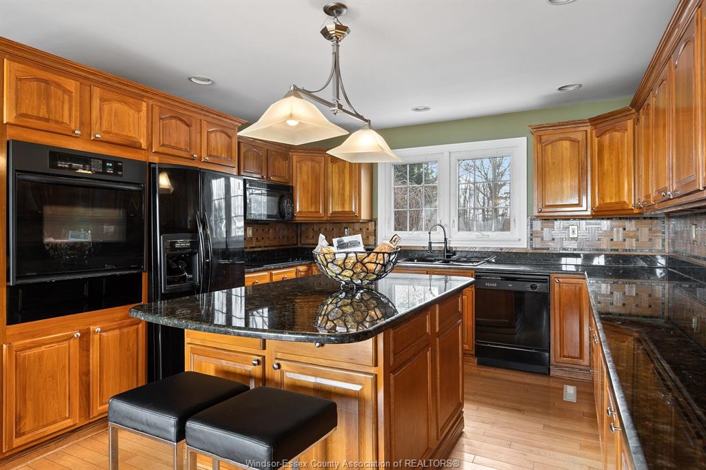 • Spacious cherry kitchen with granite countertops and an island.