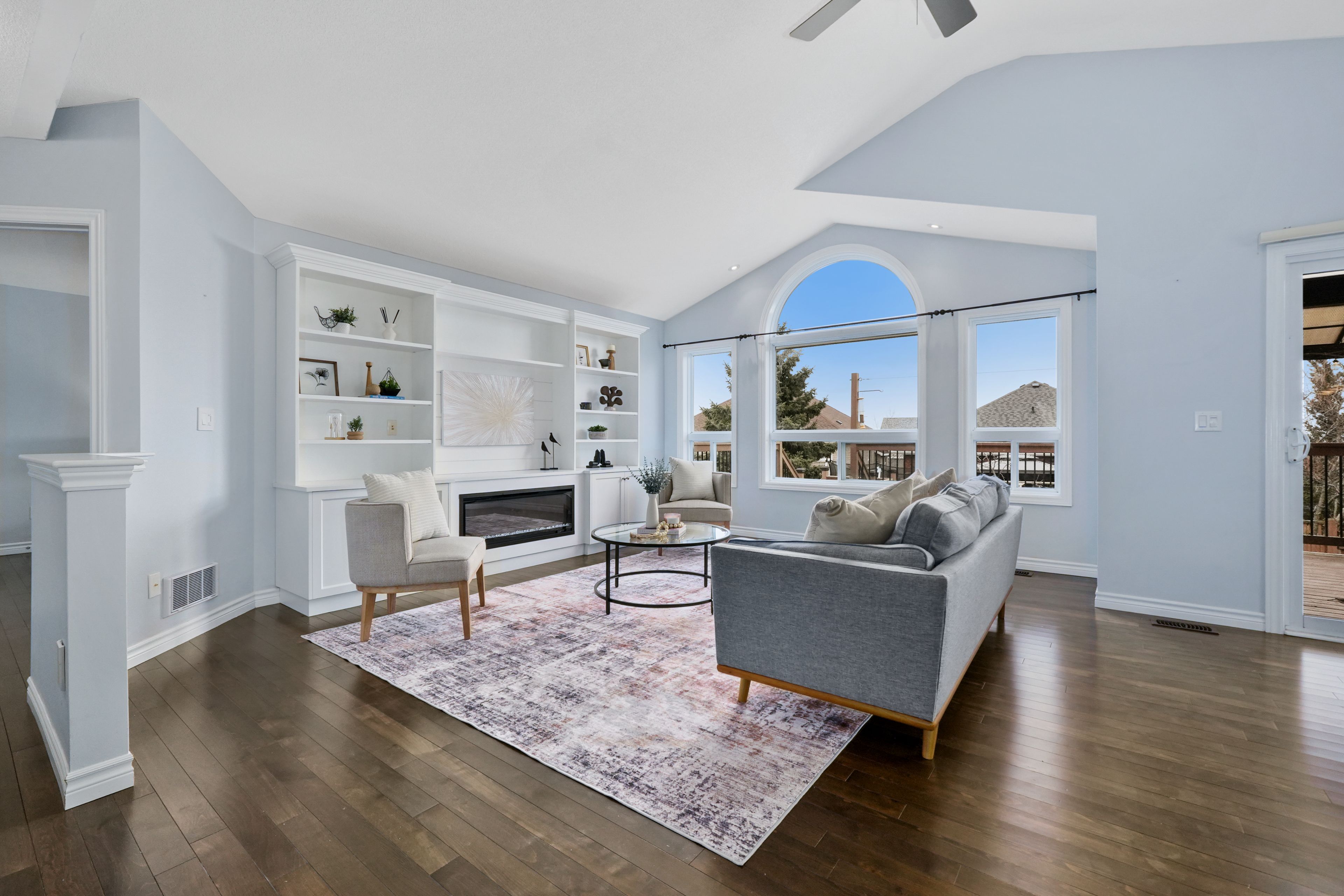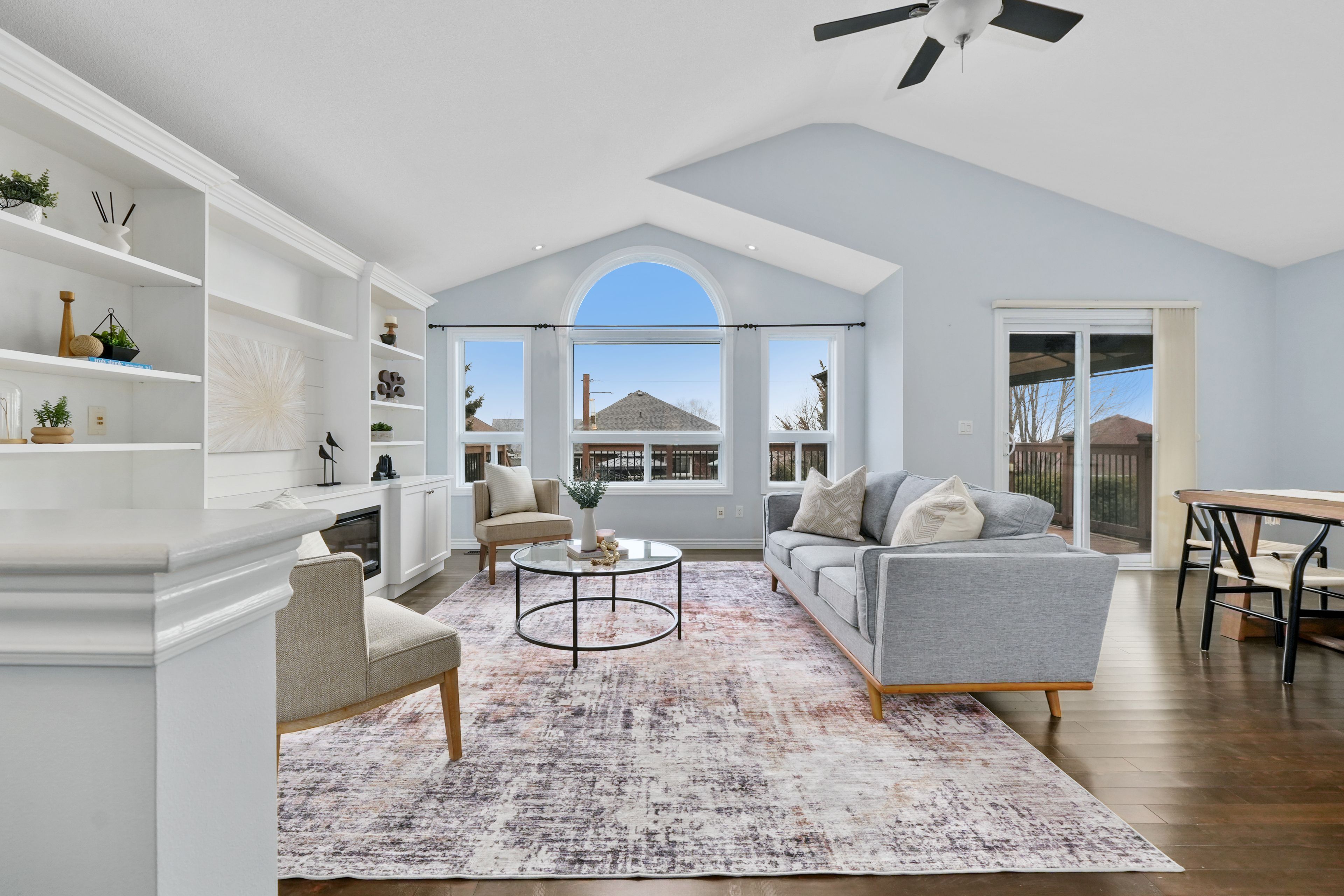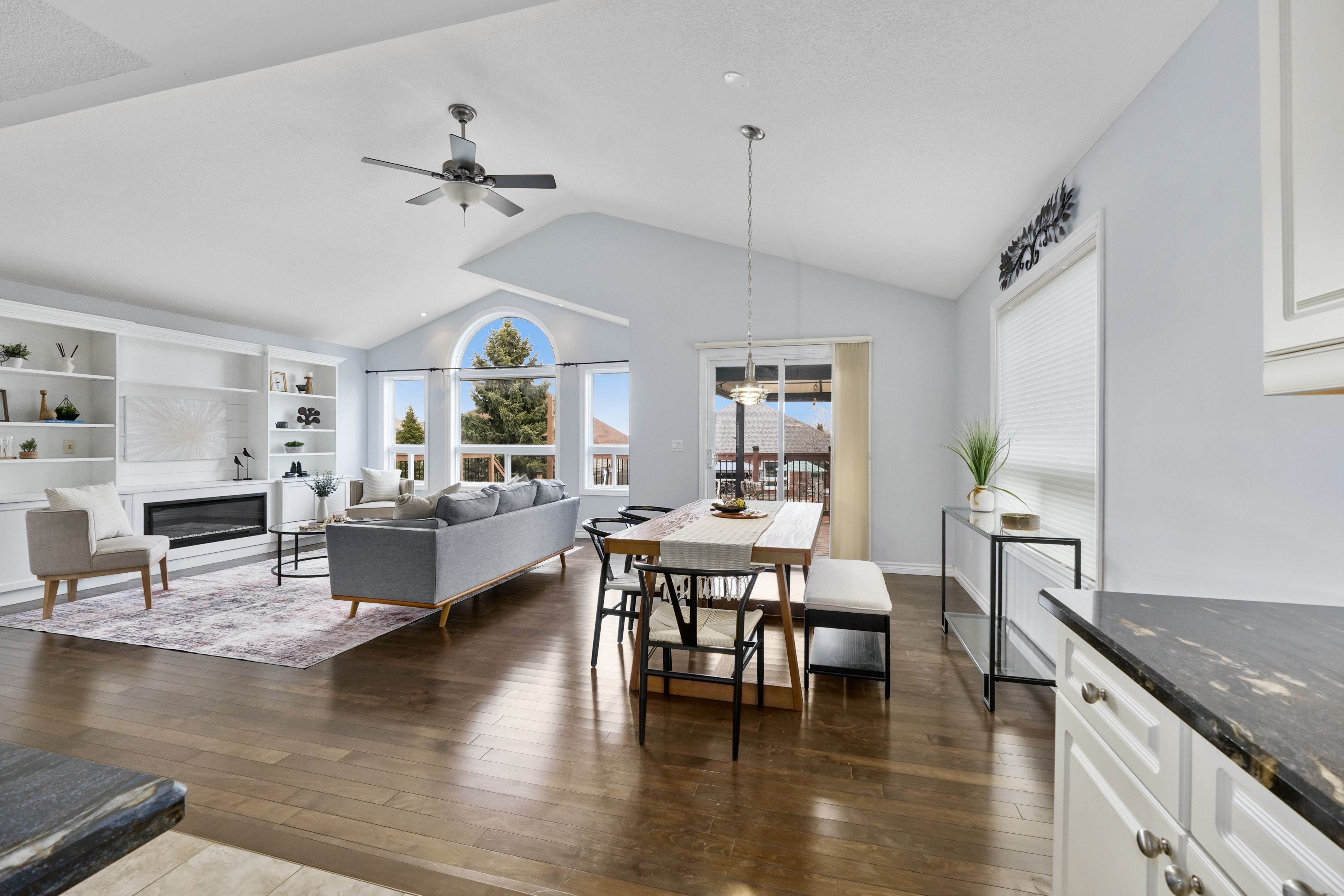 • Bright open-concept living space with cathedral ceiling and electric fireplace.