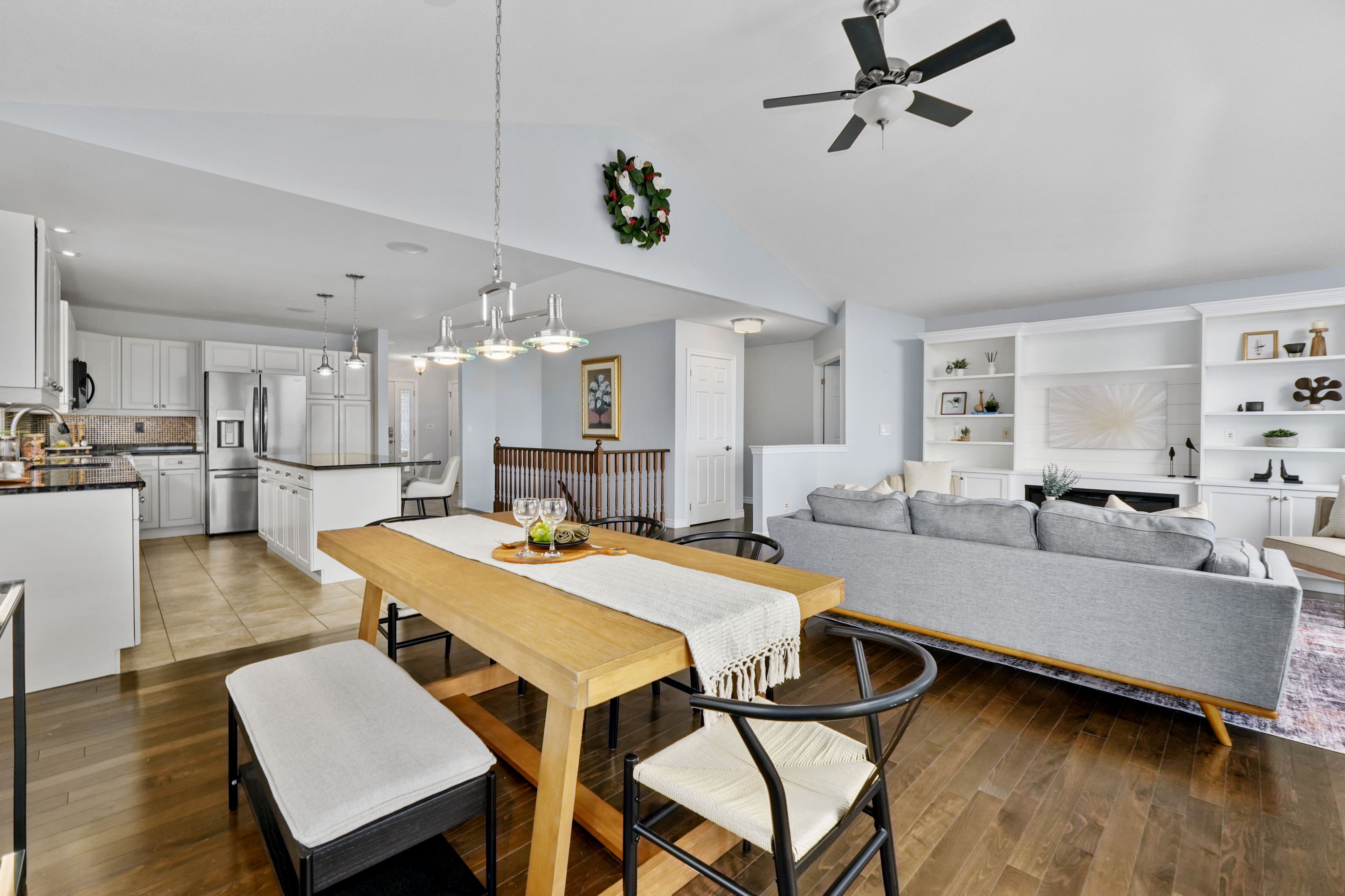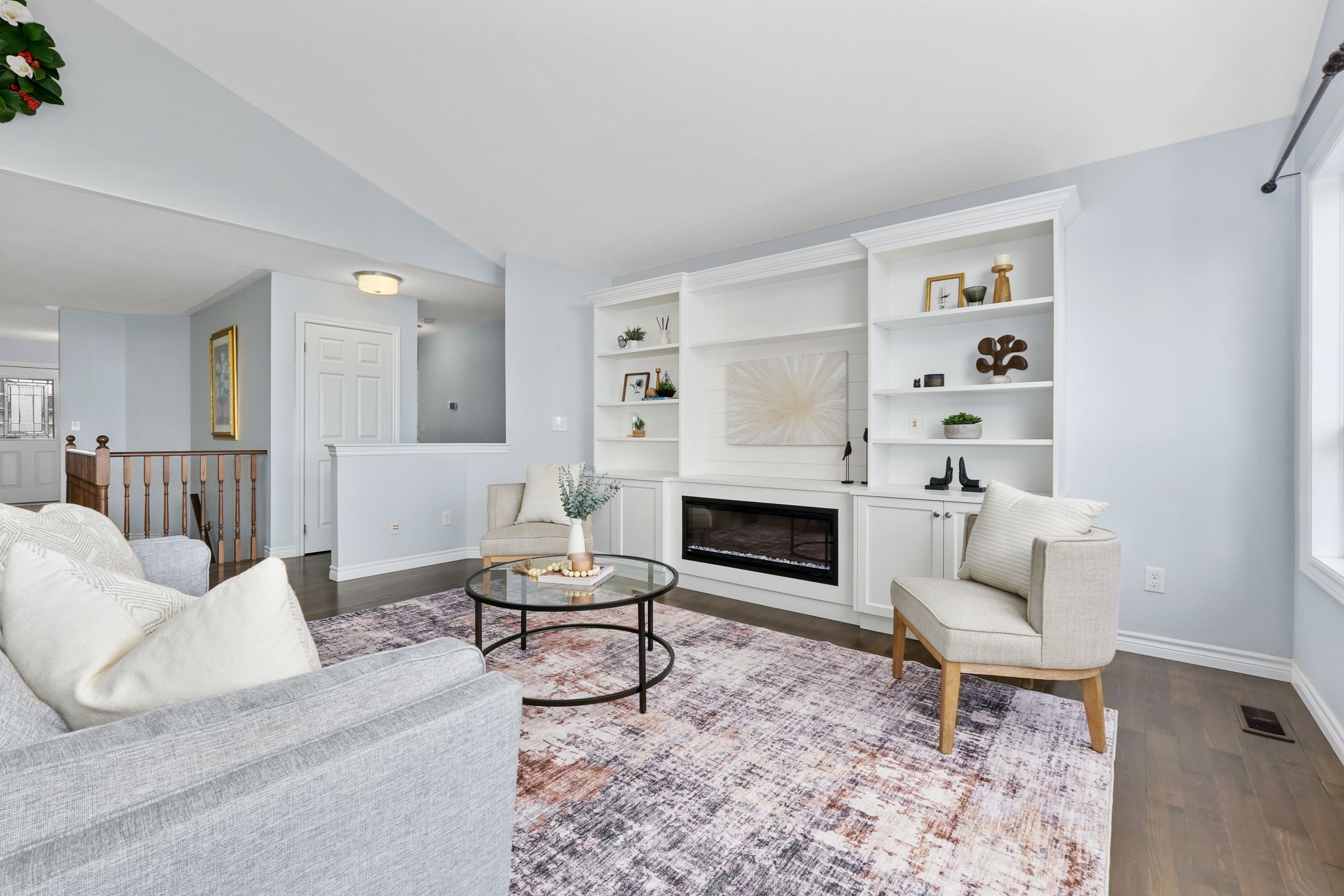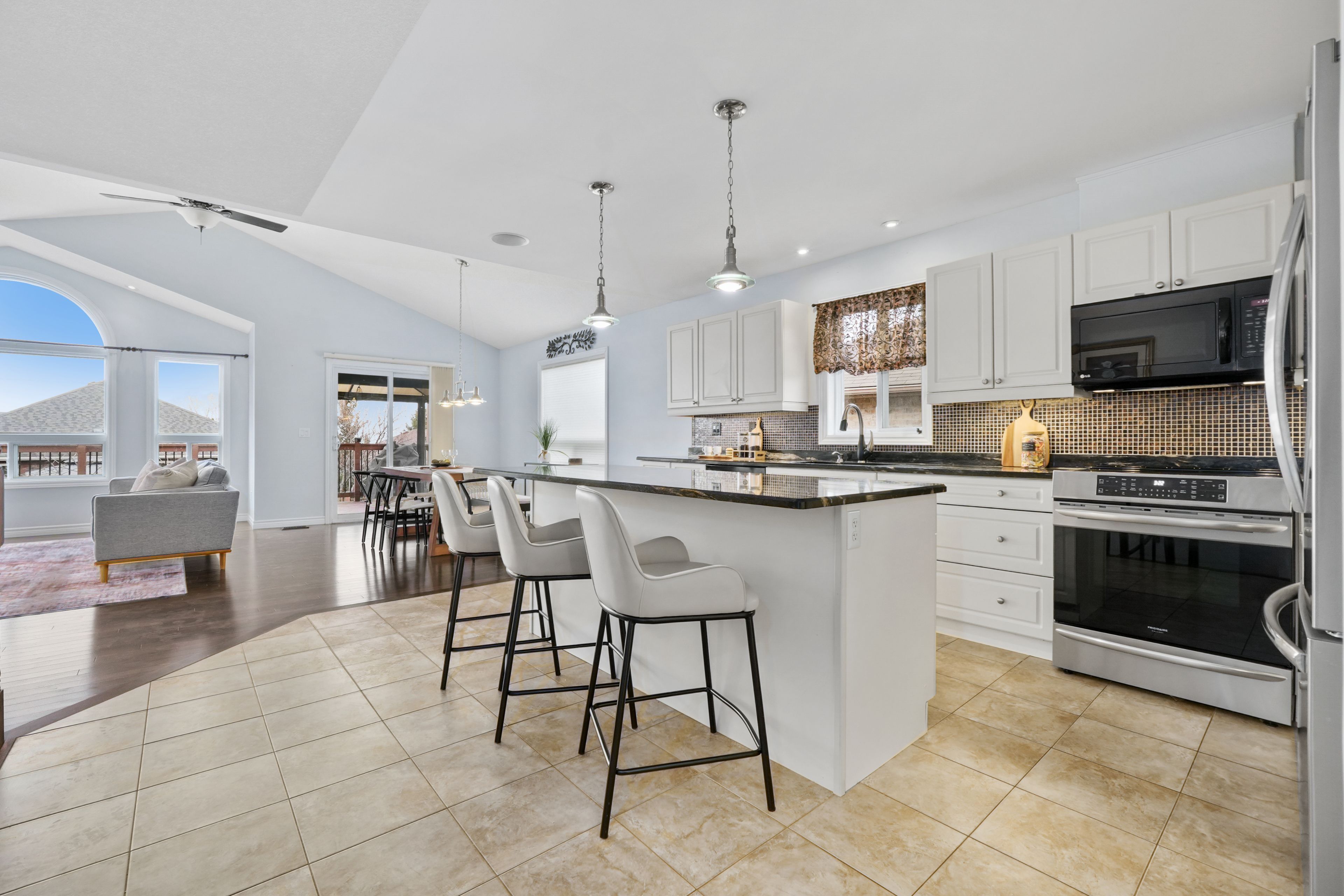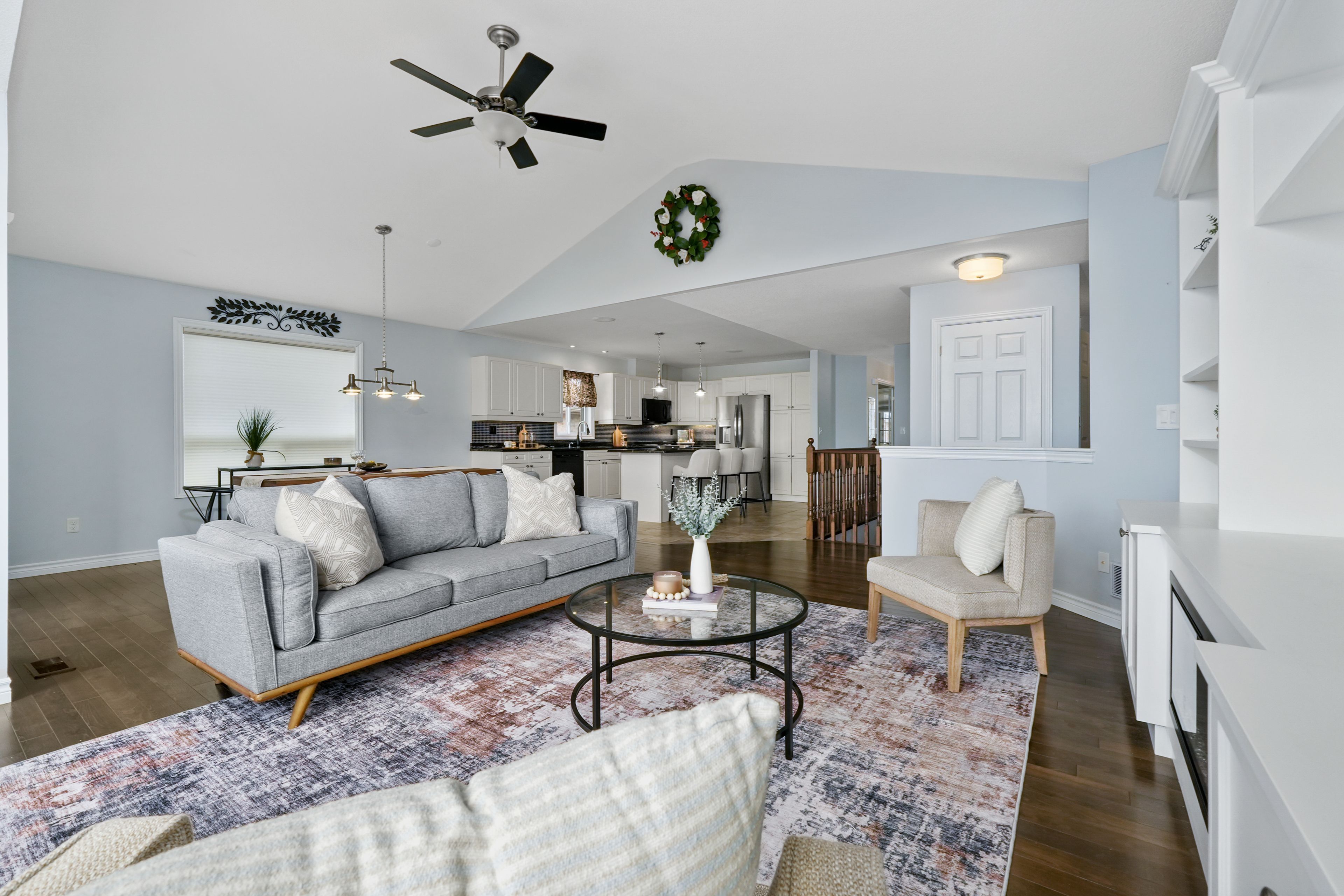 • Bright open-concept living space with cathedral ceiling and electric fireplace.