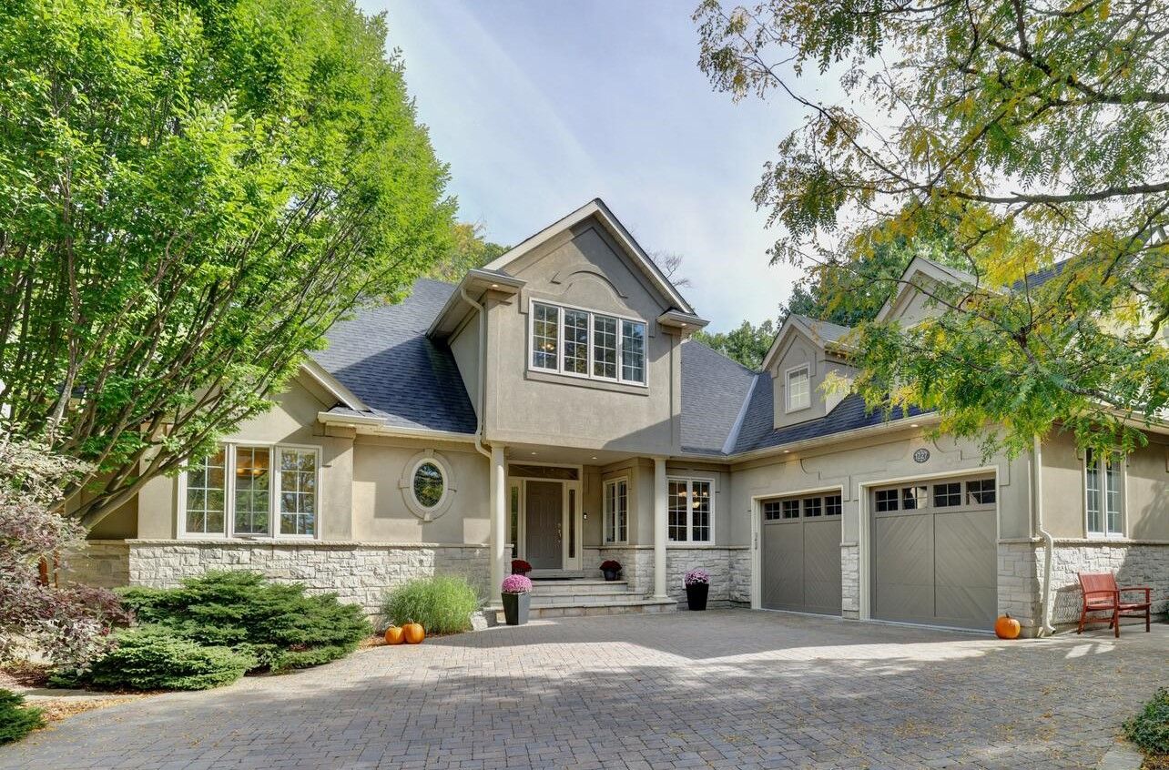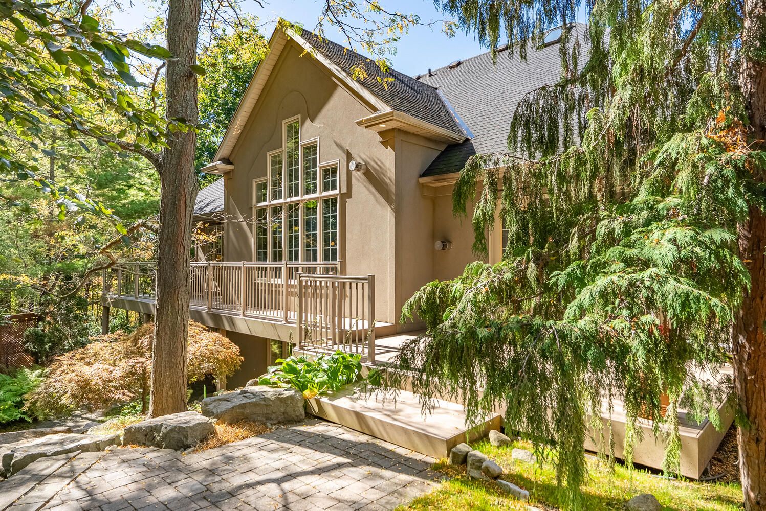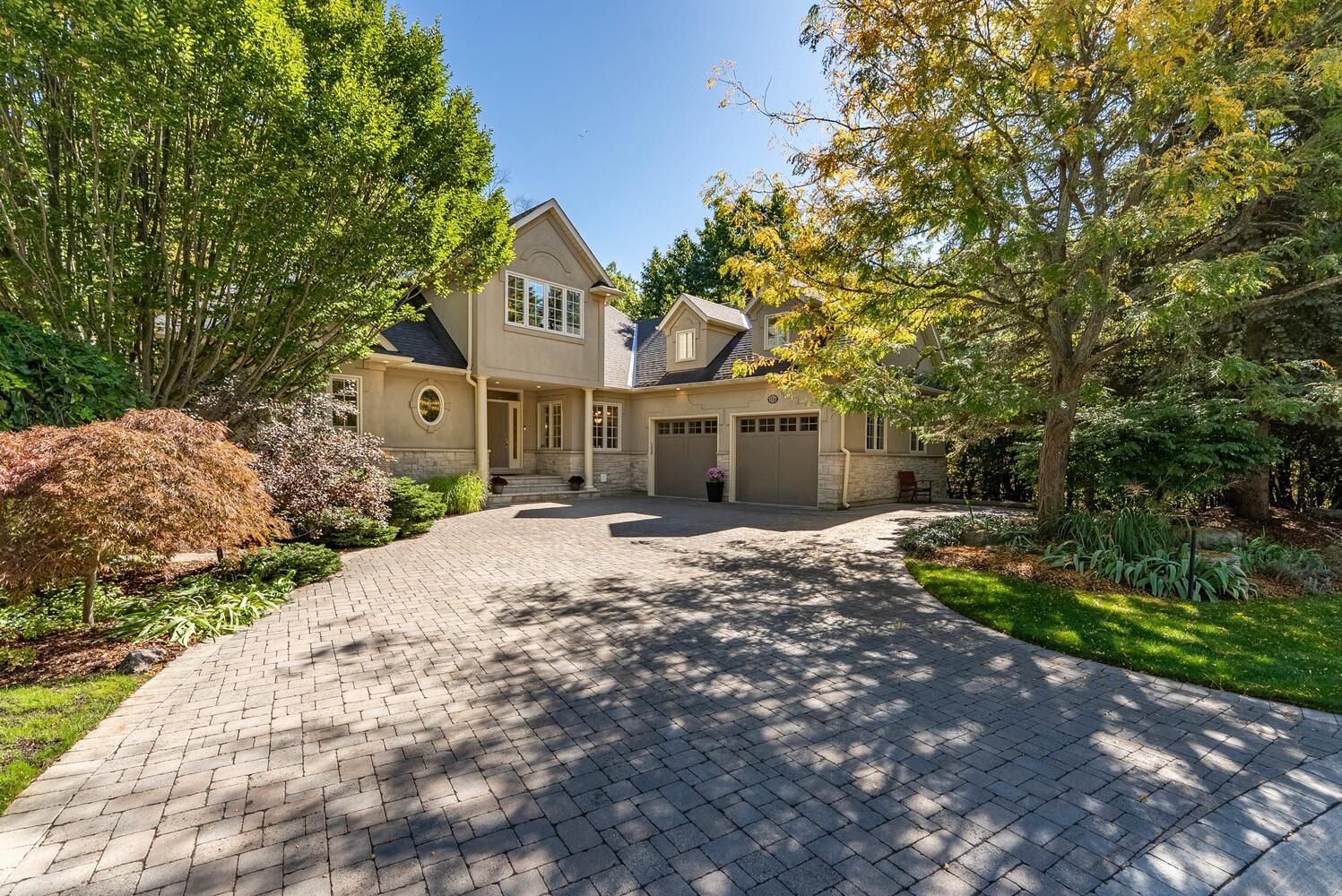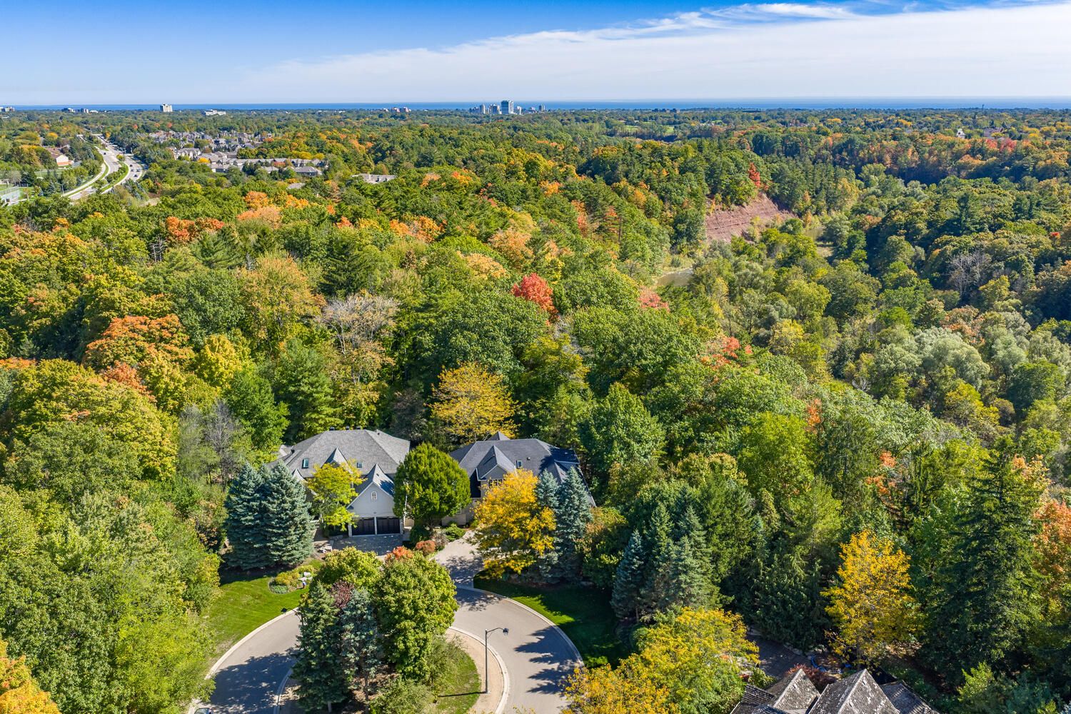 Architectural masterpiece in oakville - muskoka living on the ravine! Welcome to the exclusive enclave of riverbank way, where bespoke homes overlook lush wooded ravines & back onto sixteen mile creek conservation. At the very end of this quiet cul-de-sac, the trail ends & tranquil home life begins. This custom-built 6,160 sq. Ft. Residence blends elegance, functionality & luxury. Sun-filled interiors are framed by picturesque forest views through expansive custom windows w/transoms. Grand living room w/soaring 16' high open-beam ceilings & gas fp forms the heart of this home. Entertain in the dining room designed for 12 guests. Enjoy downsview kitchen featuring granite counters, marble backsplash, centre island w/2nd sink w/filtered water, gas stove, led pot lights, b/i speakers & walk-in pantry. The breakfast room opens to a composite deck with glass railings, perfect for morning coffee, or glass of wine. The main floor primary suite boasts 10' high vaulted ceilings, fp, w/o to the deck, w/i closet & spa-inspired bath w/5-jet jacuzzi, separate shower & stained-glass window. Convenient main floor laundry, inside garage entry & private staircase 2 ll complete this floor. Upstairs are 2 spacious bedrooms & a skylit bath. The walk-out lower level offers a separate entrance, billiards room, media room, office, 4th bedroom, large family room ideal for entertaining or multi-generational living. Granite rocks, multitier patios, lawn, stone benches in the amazing backyard. Dutch clean home. Updates: roof shingles (2018), 2nd floor hardwood (2018), finished lower-level rms (2018), furnace & ac (2023), epoxy garage flrs (2023). Lifestyle perks: miles of interconnected trails@ the doorstep, nearby lions valley with red cliffs, hospital, health science village, new regional courthouse, 16 mile sports complex, library, community centre, shopping, dining access hwy 407, qew&go train. The epitome of sophistication & elegance, set in oakville's most breathtaking natural landscape.