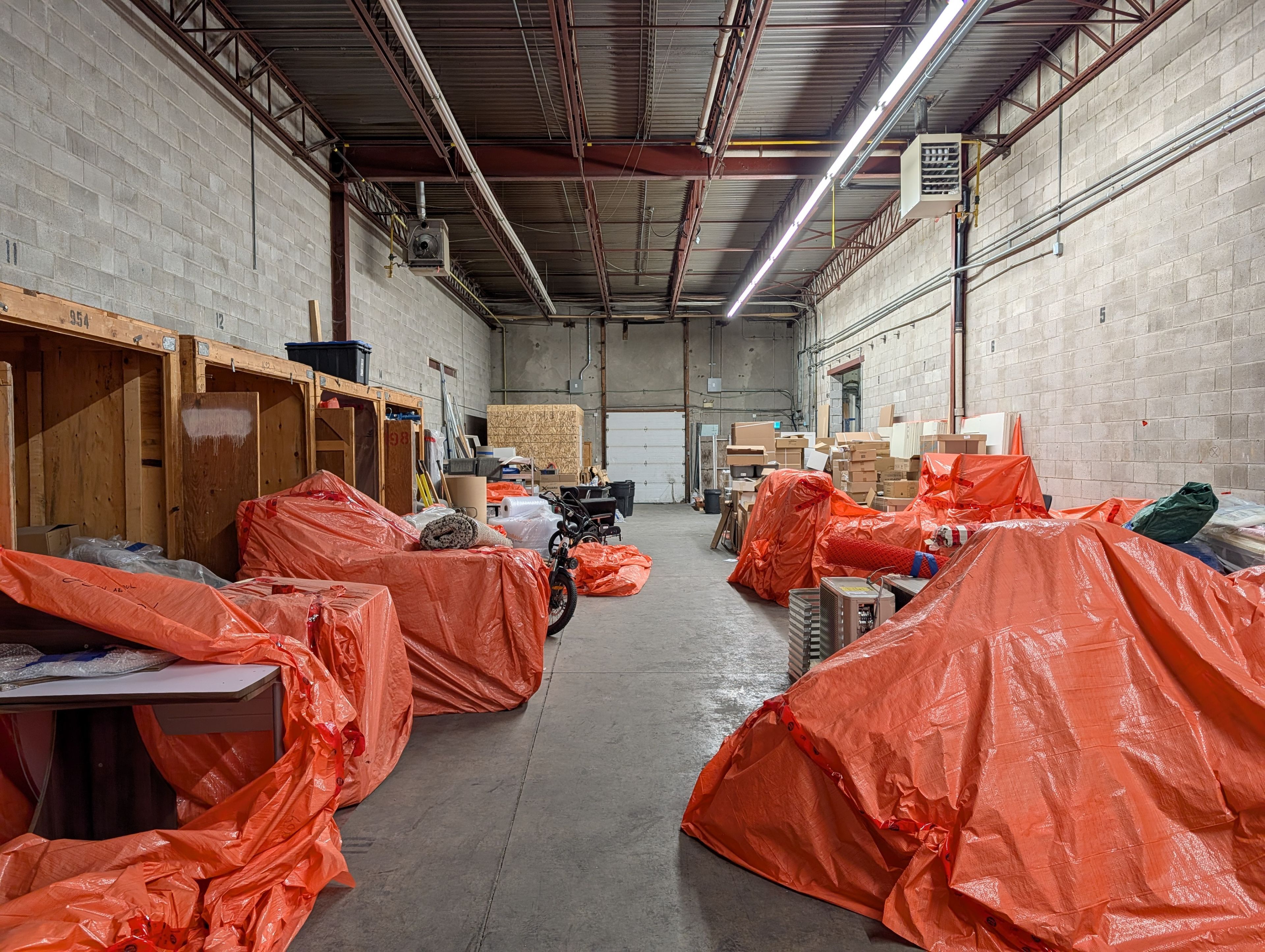 • Warehouse with 18-foot clear height and dock loading door for storage.