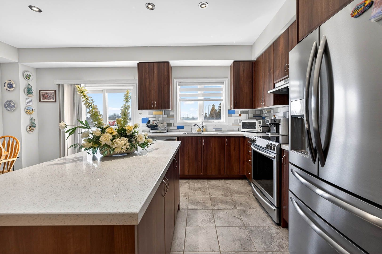 • Upgraded kitchen with quartz countertops and centre island for convenience.