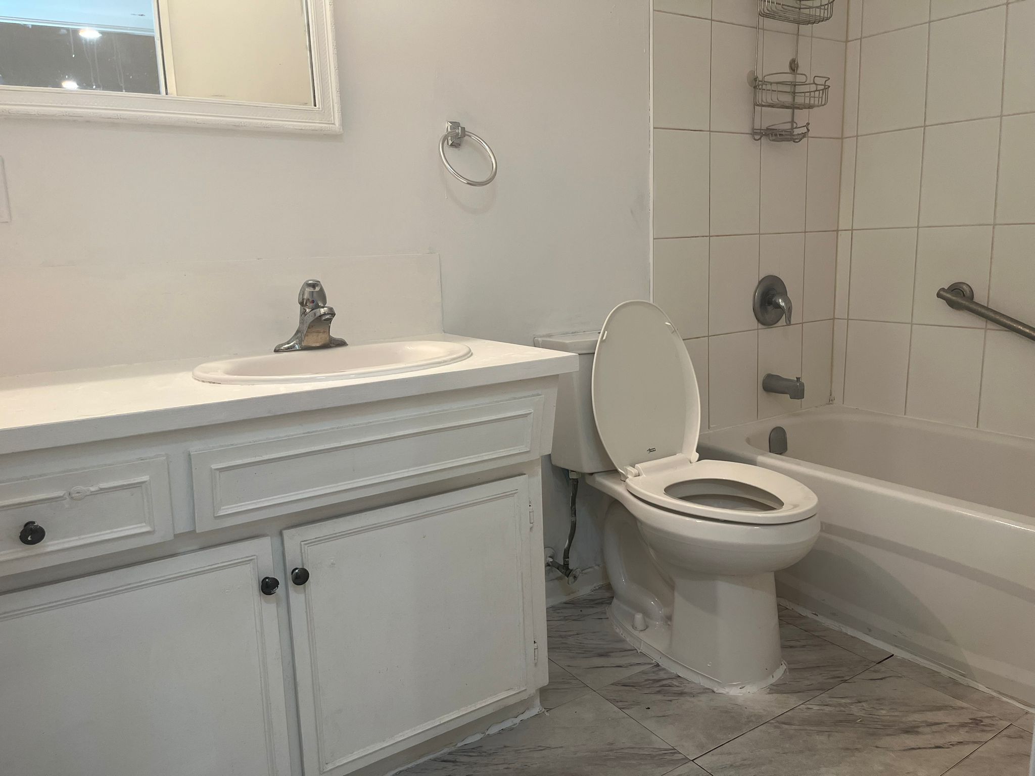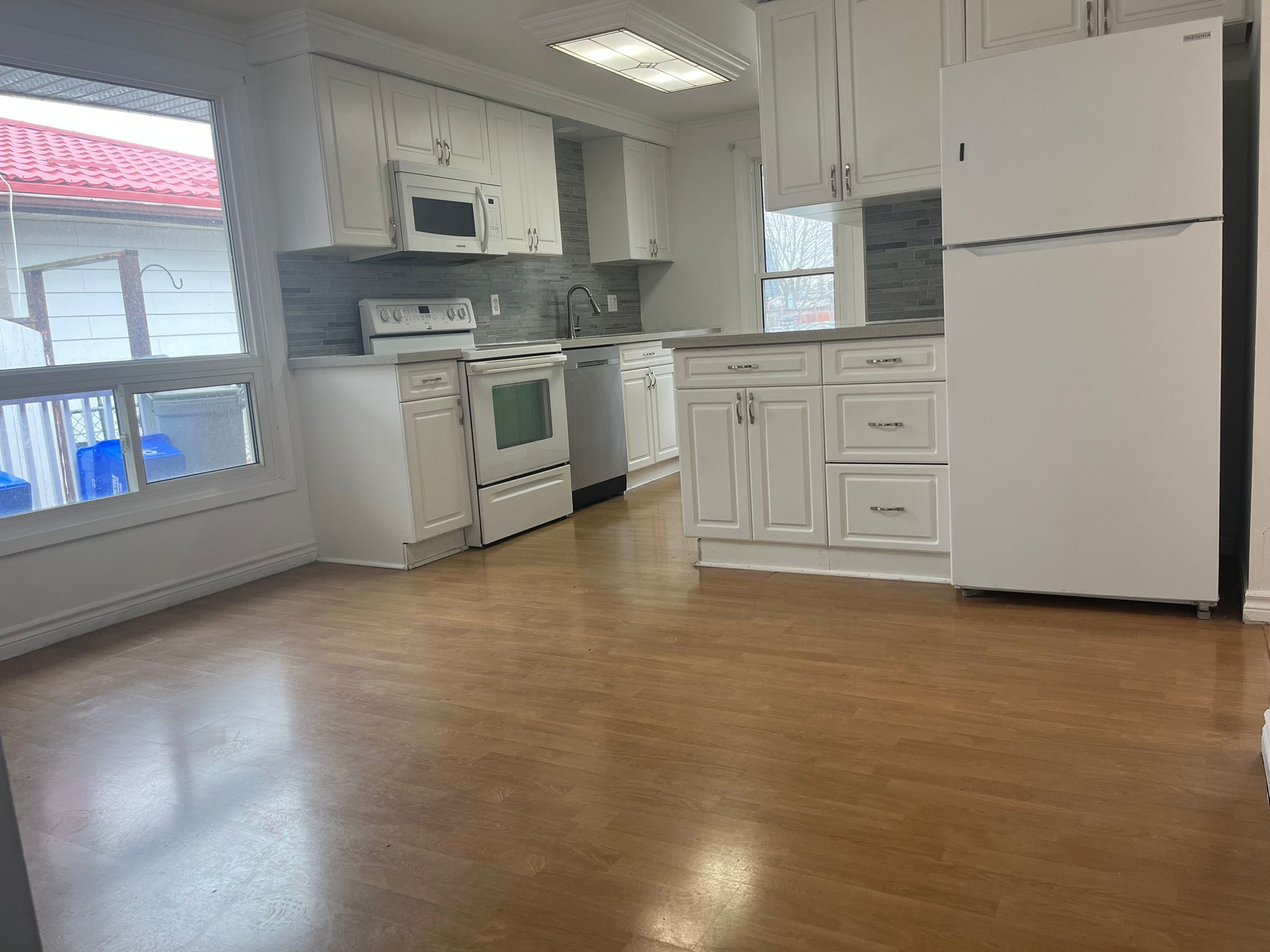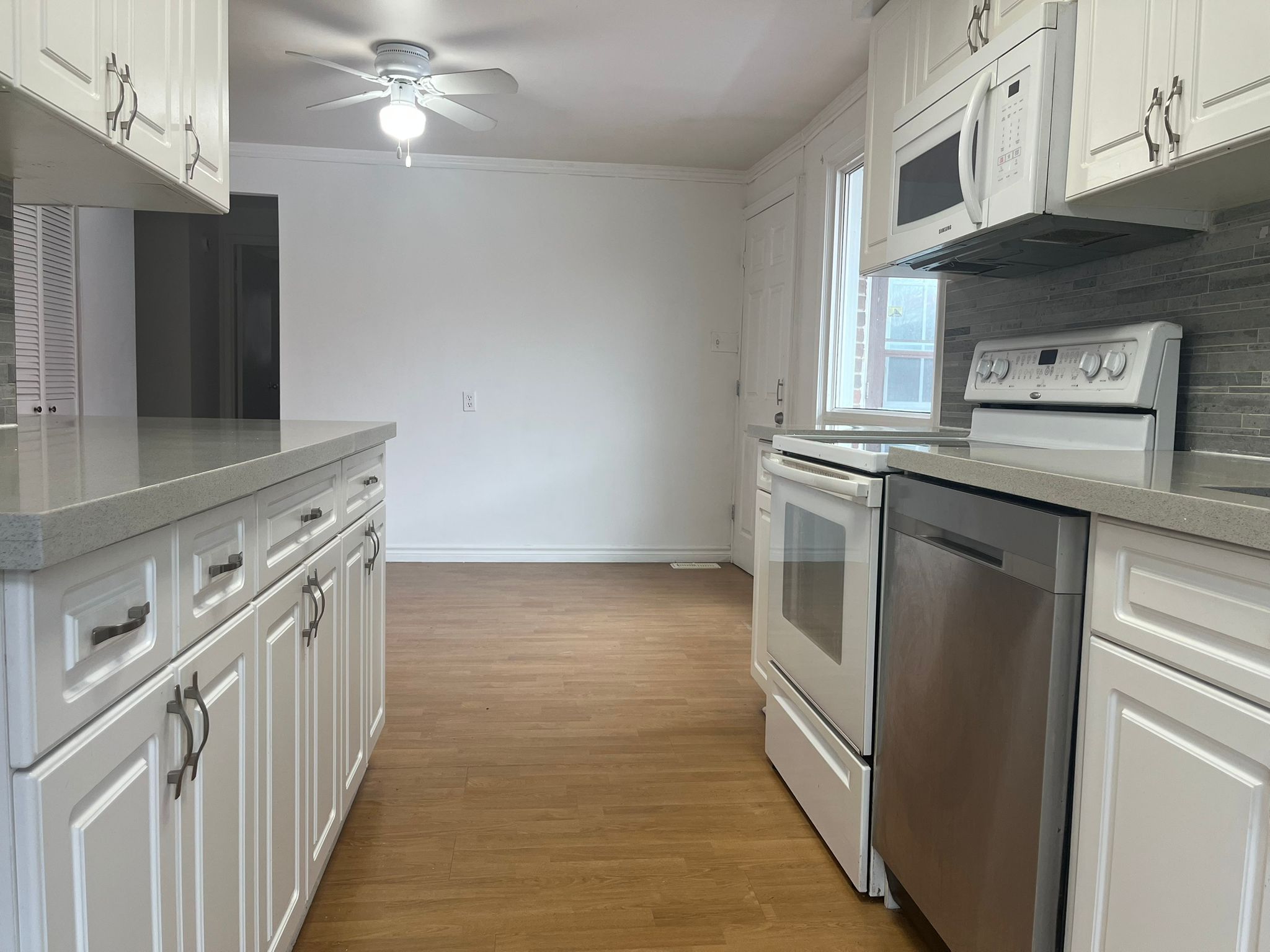 • Updated kitchen featuring quartz counters and modern white cabinetry.