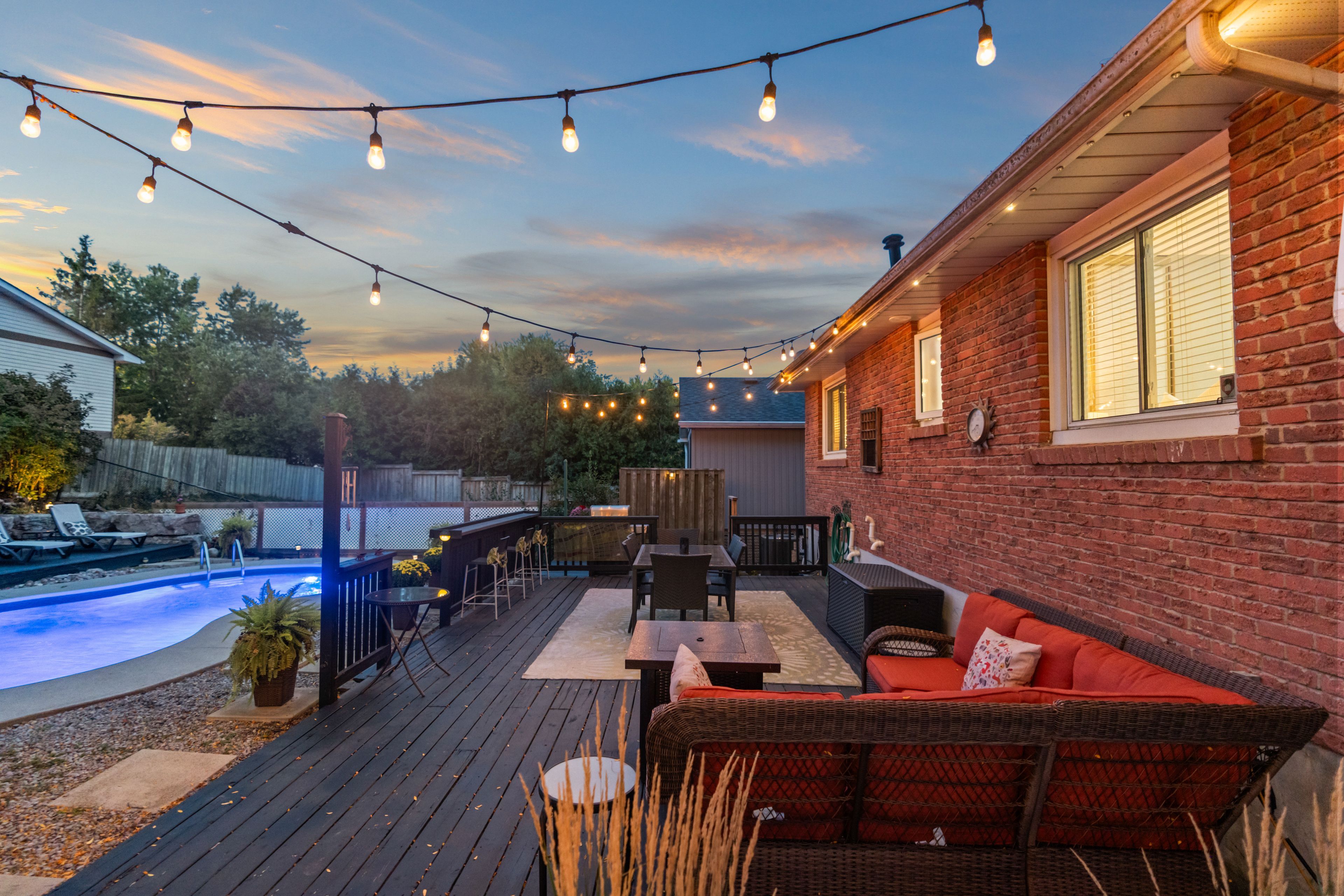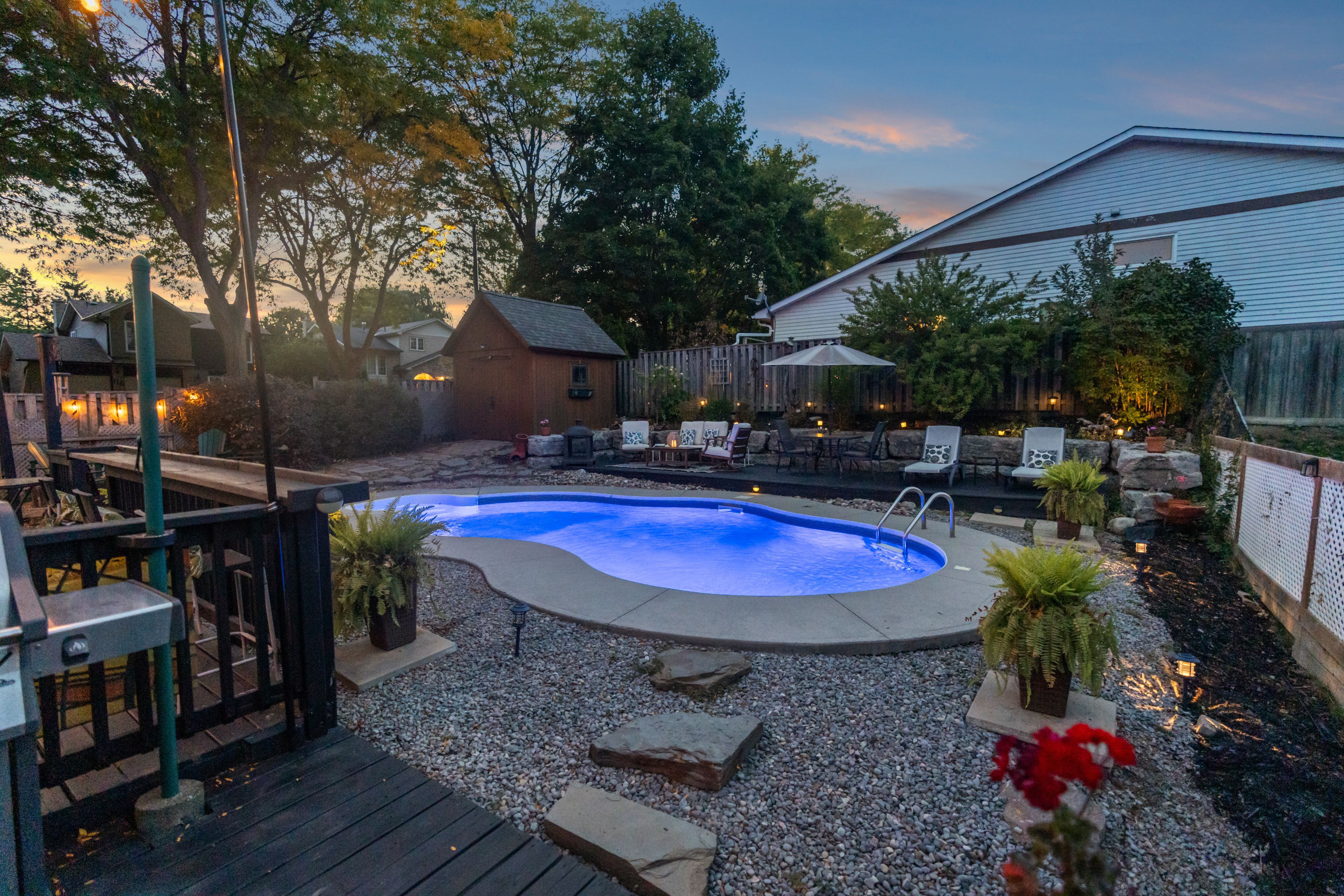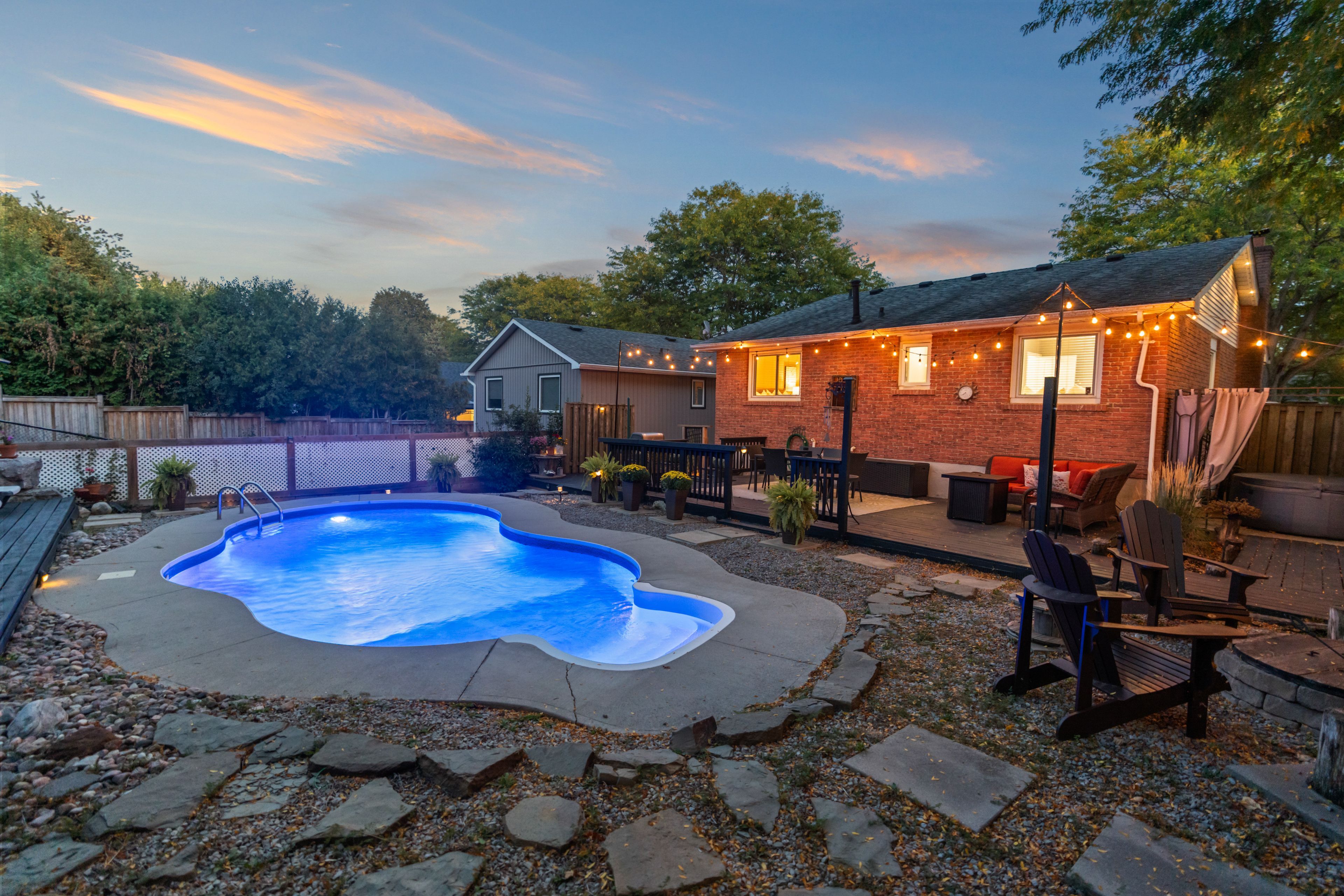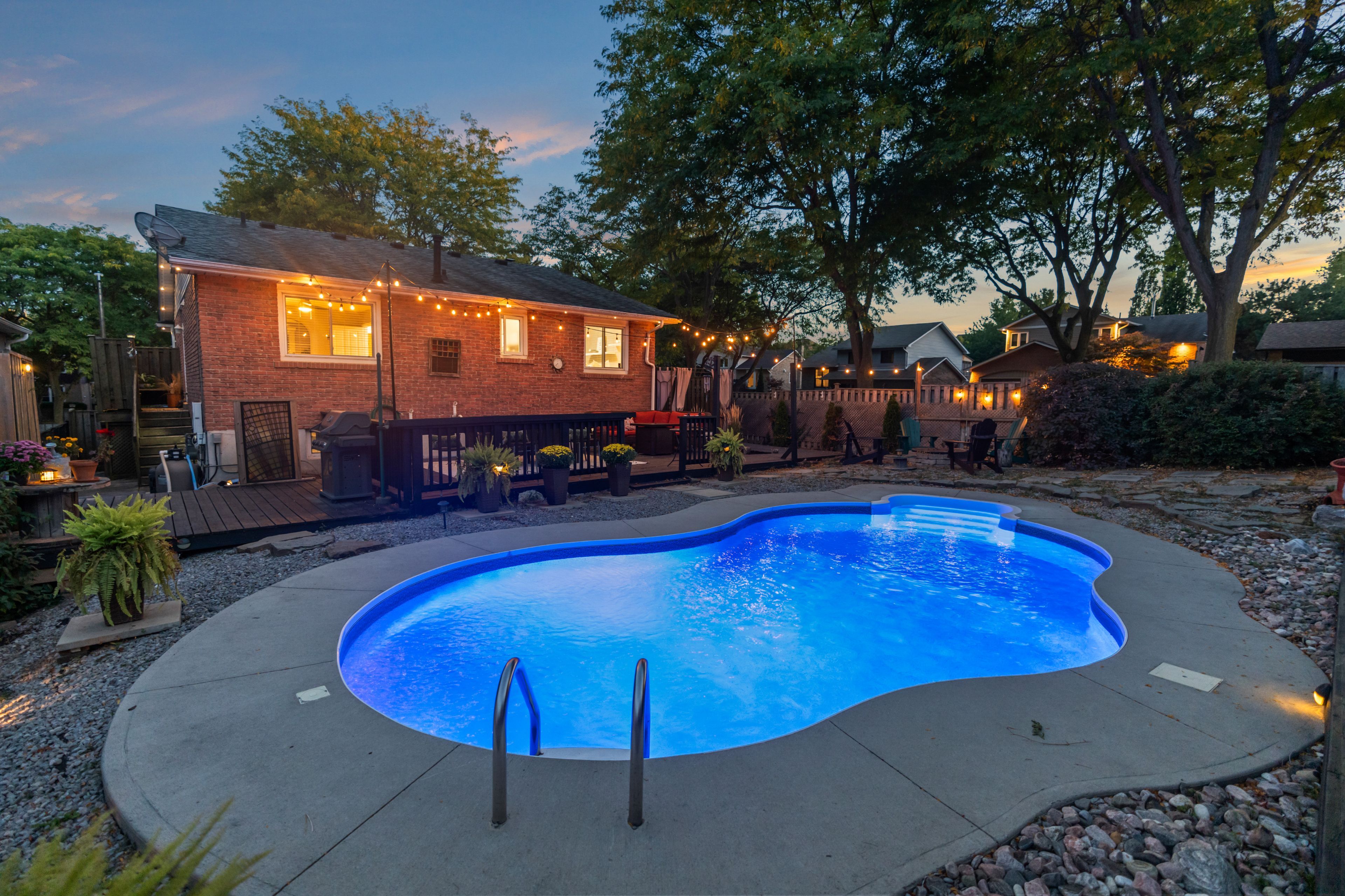 Location, location, location! This stunning three-bedroom raised bungalow is perfectly situated in whitby's sought-after lynde creek neighbourhood, offering style, comfort, and thoughtful upgrades throughout. The beautifully renovated kitchen showcases beechwood cabinetry, marble backsplash, quartz countertops, pantry with pullouts, and convenient pots-and-pans drawers, with a walkout to the deck for effortless entertaining. Gleaming hardwood floors flow across the main level, while the finished lower level features a welcoming recreation room with fireplace, a fourth bedroom, updated bath, large workshop, and direct garage access. Step outside and discover an entertainer's dream backyard - a private oasis designed for year-round enjoyment. The professionally landscaped yard boasts an inground heated (natural gas) saltwater pool, expansive decking with multiple seating areas, a natural gas bbq, cozy fire table, and a soft tub plug-and-play hot tub, creating the perfect retreat for relaxing or hosting family and friends. This home has been meticulously maintained with an array of impressive improvements: an owned tankless water heater (2019/20), the saltwater pool installed in 2019 by scovie pools with a new pump (2024) and heat exchanger (2025), gemstone programmable led exterior lights (2023), and a new central vacuum system (2024). Additional upgrades include a direct gas line for the bbq, professional attic remediation with certificate (2024) completed prior to a full bathroom renovation, refreshed front steps (2025), and a durable roof, furnace, and air conditioner (all 2016). With its exceptional features, modern comforts, and beautifully landscaped surroundings, this move-in-ready home truly offers a slice of heaven on earth.