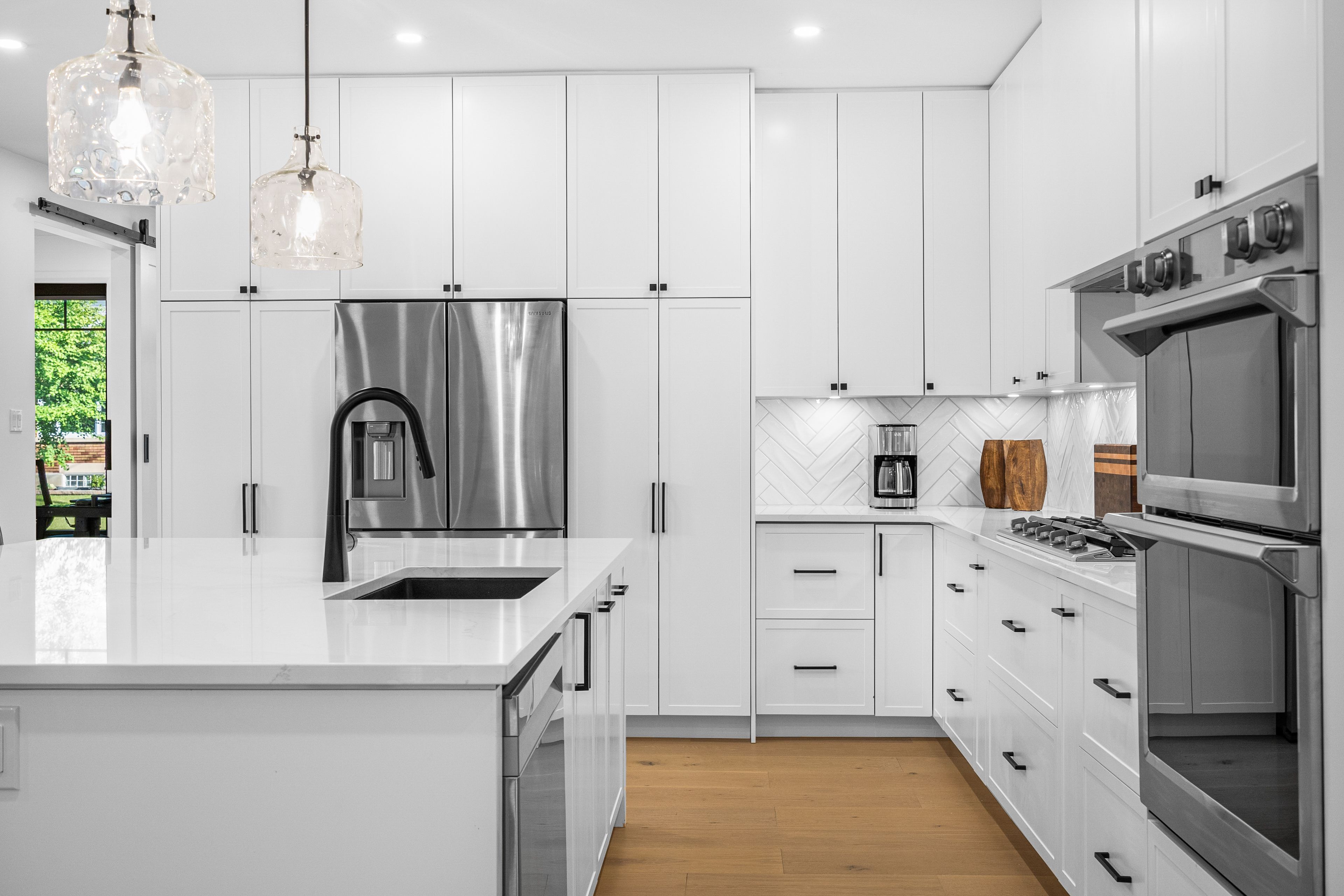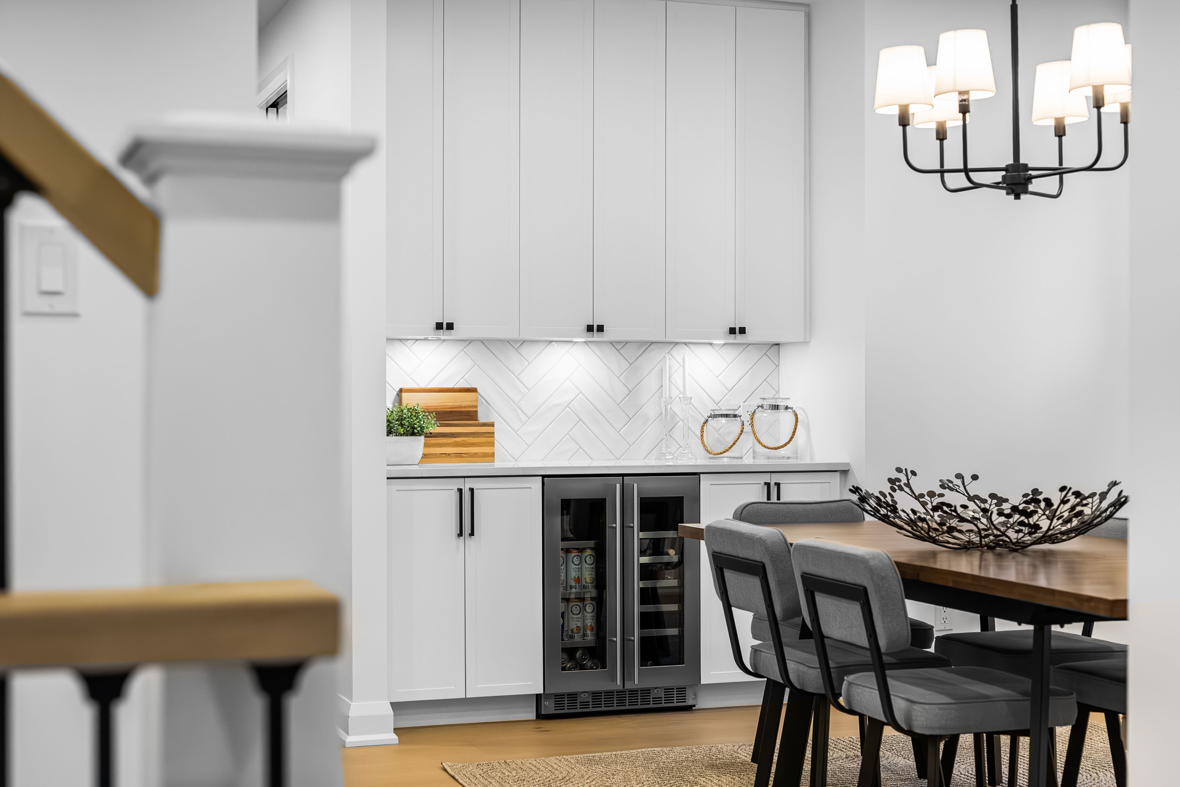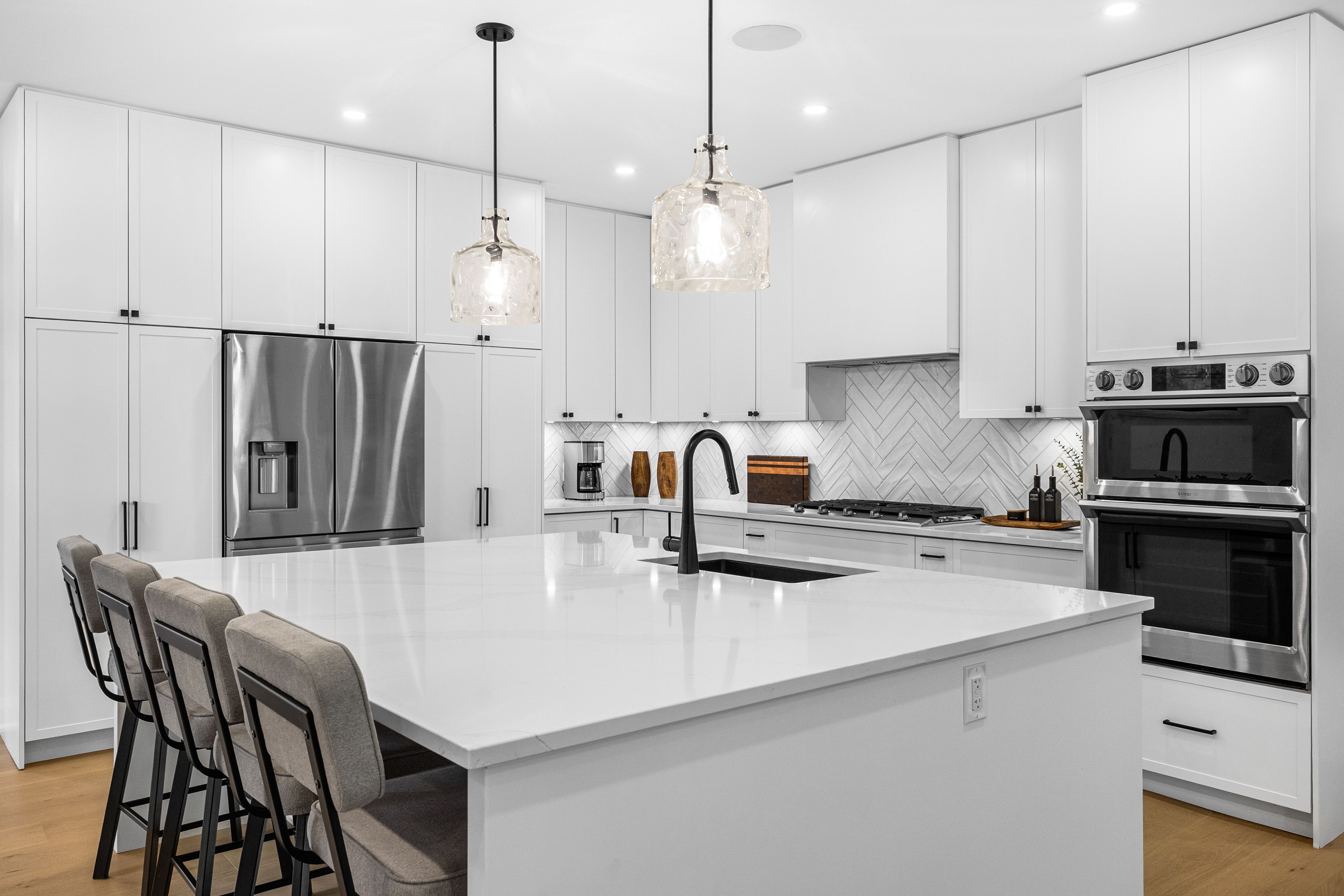 • Custom kitchen features premium appliances and stylish herringbone backsplash.