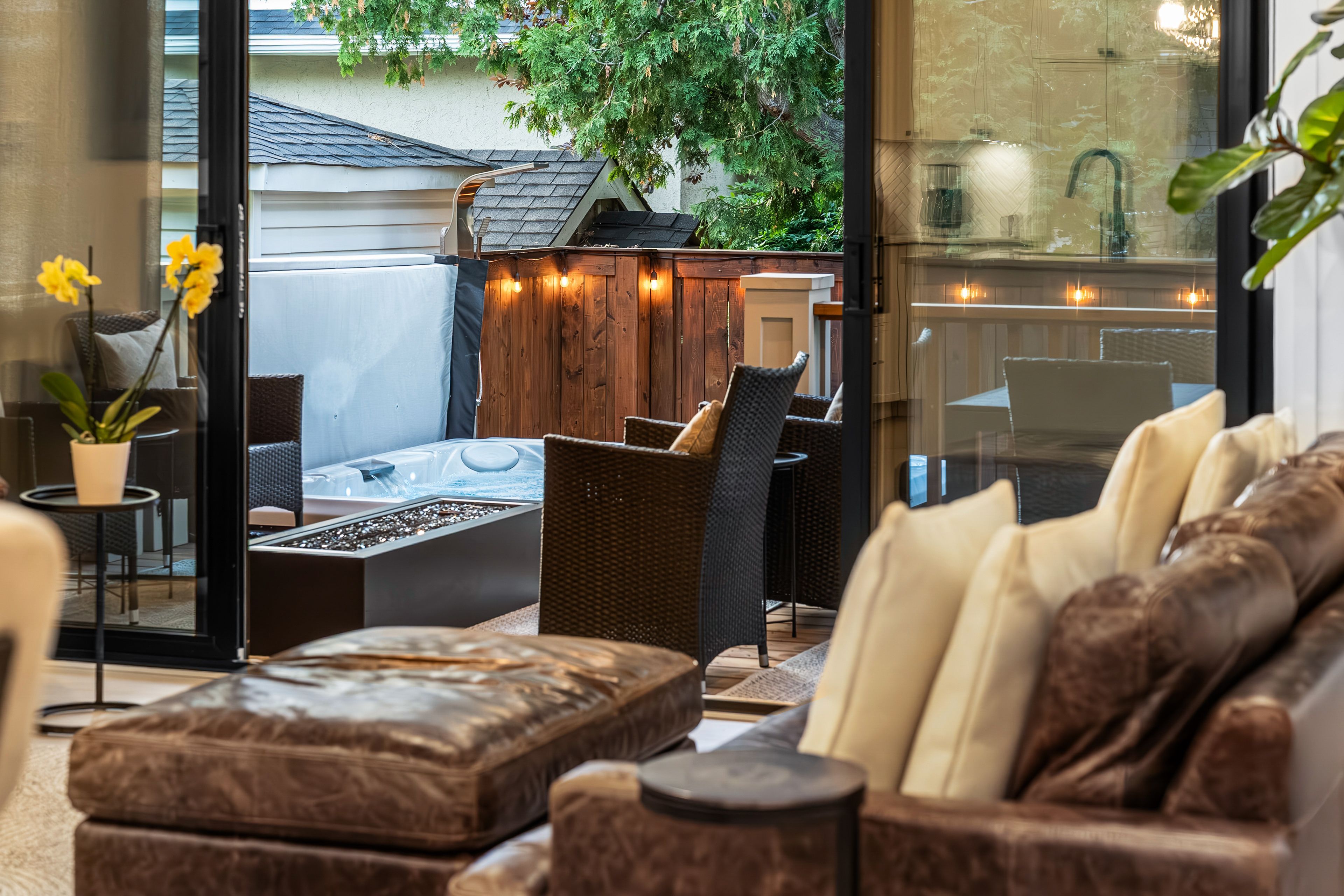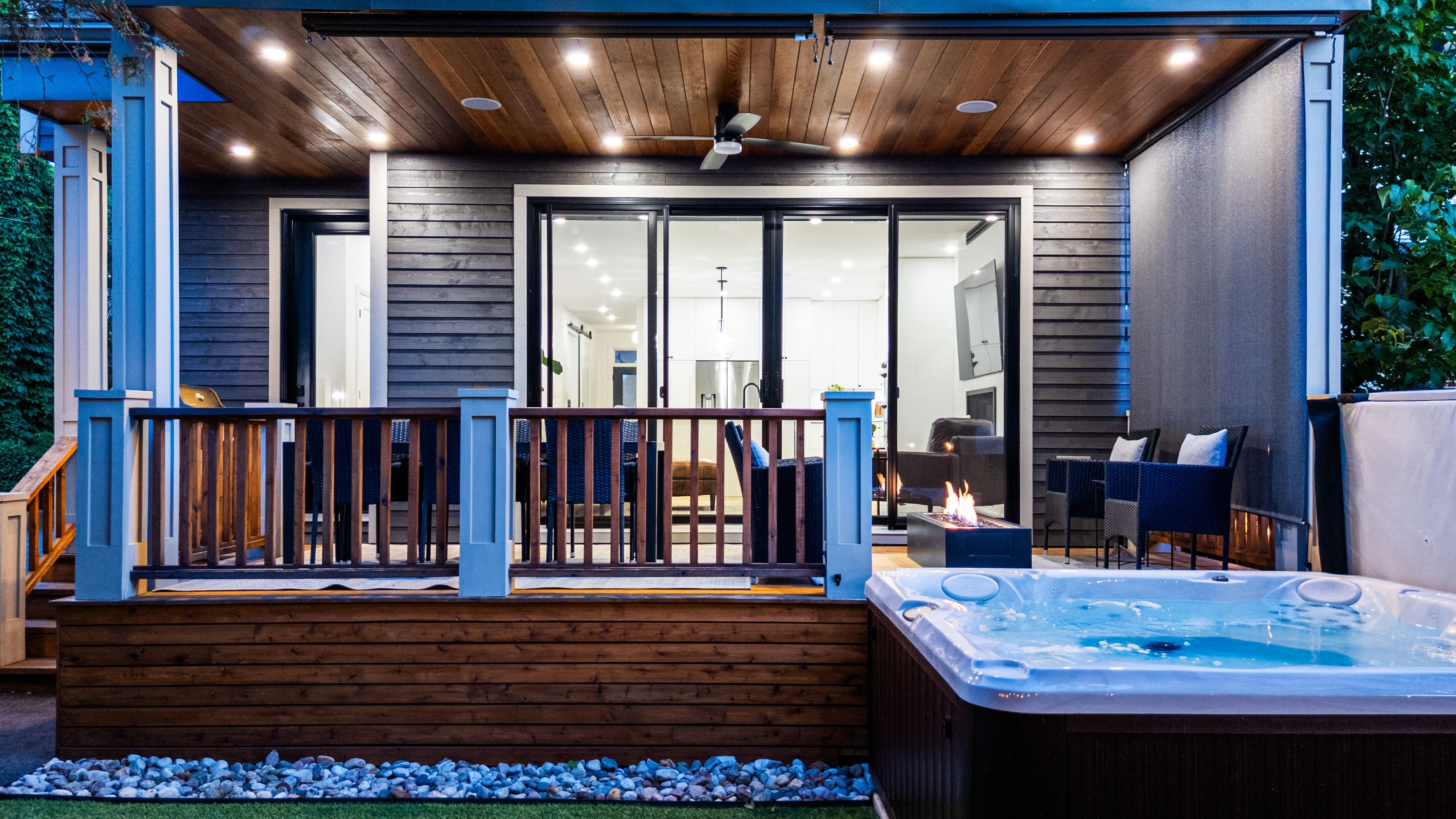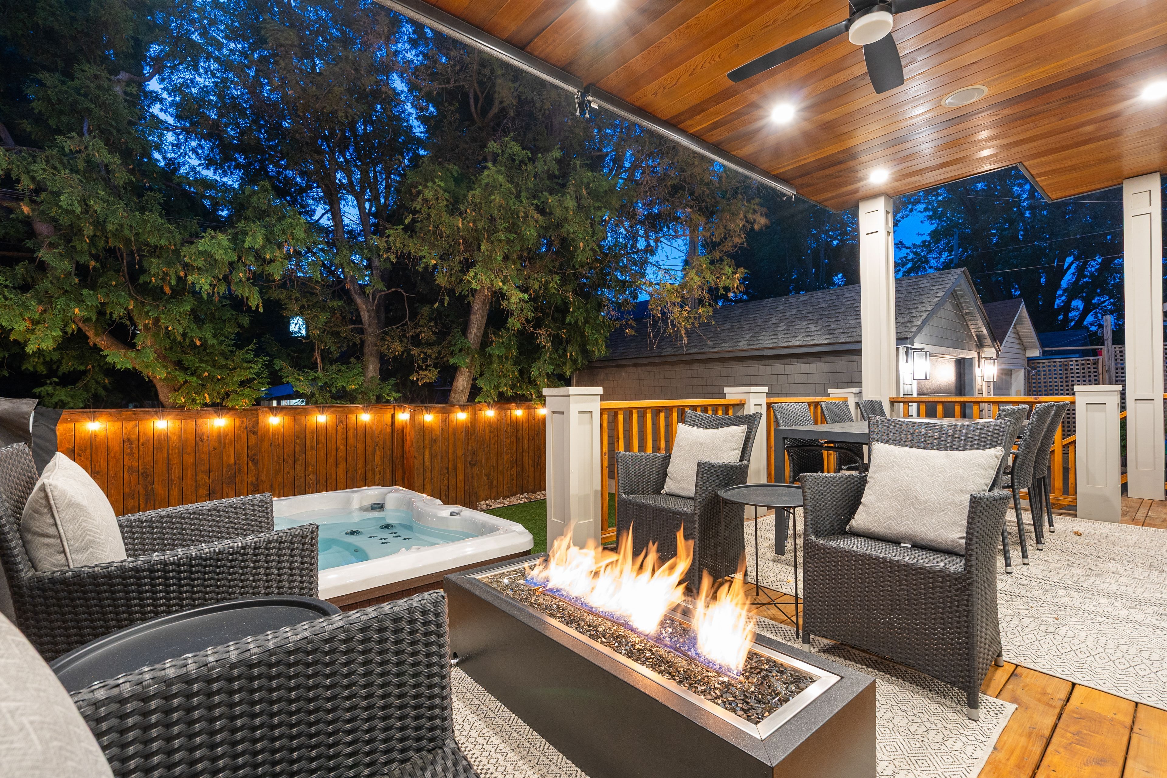 • Private backyard oasis with a covered deck and luxurious hot tub.