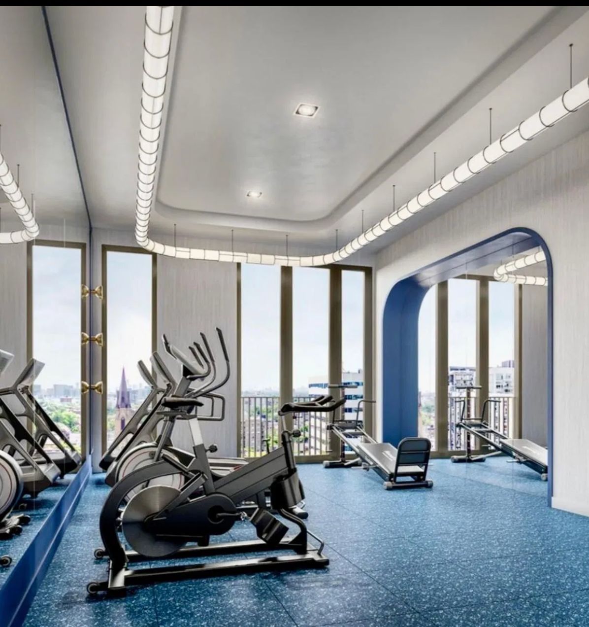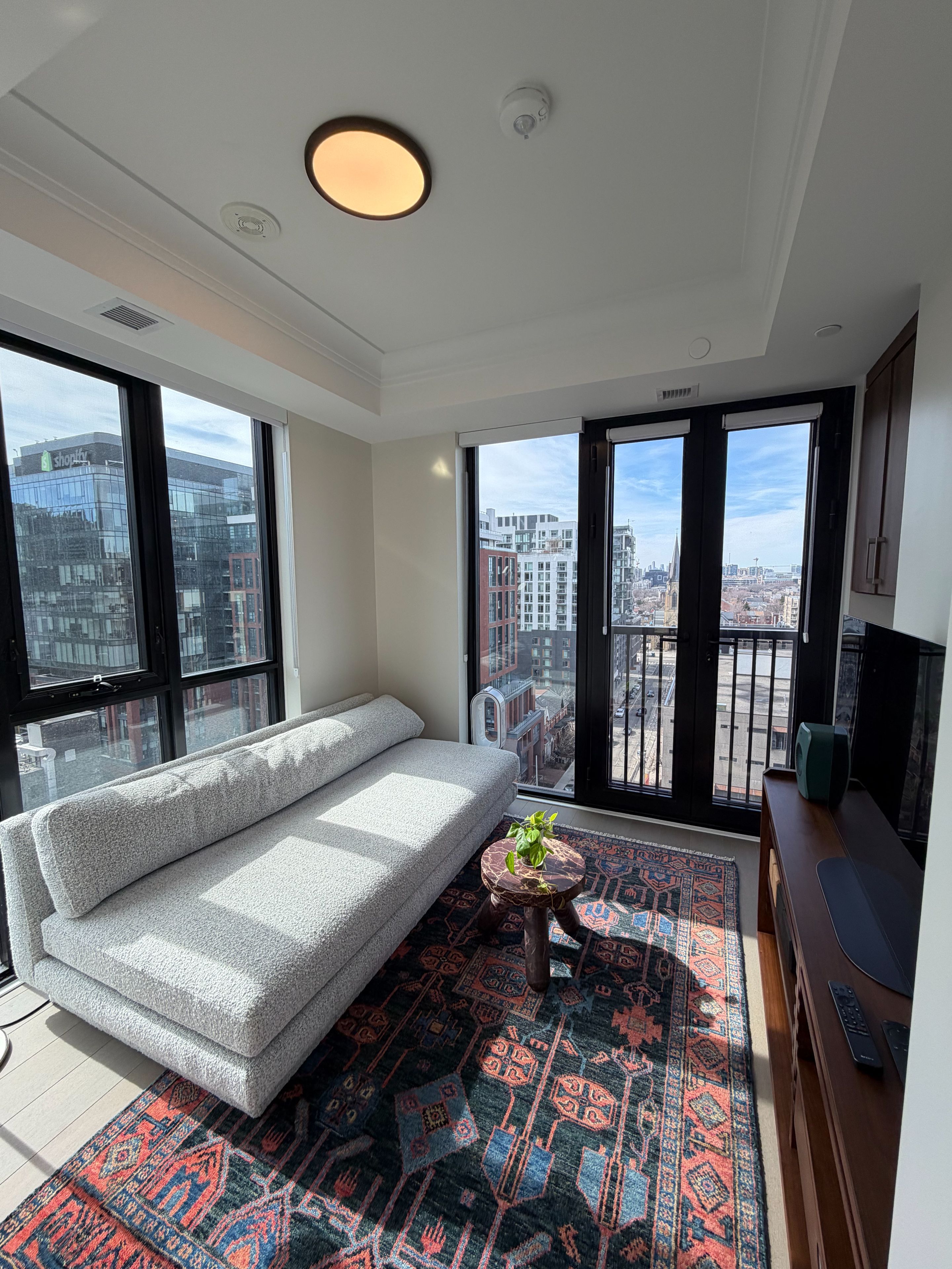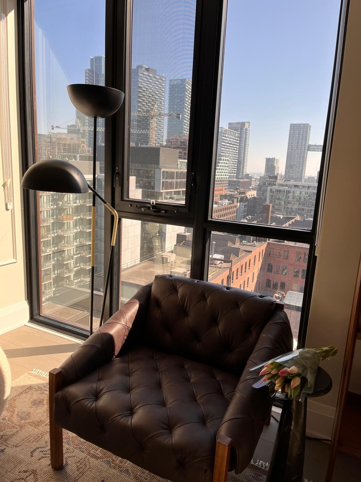 • Bright open-concept living area with captivating city views from Juliette balconies.