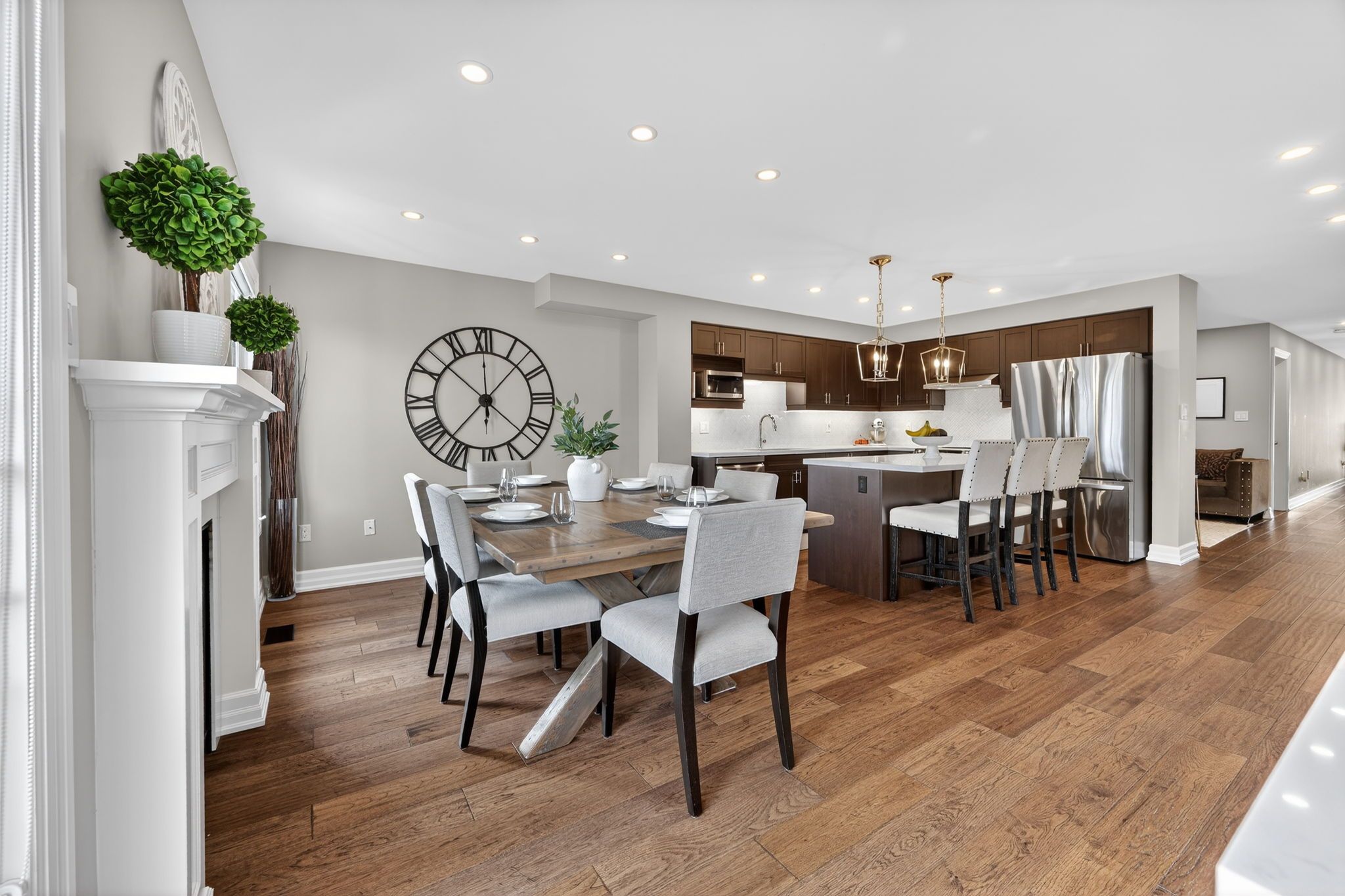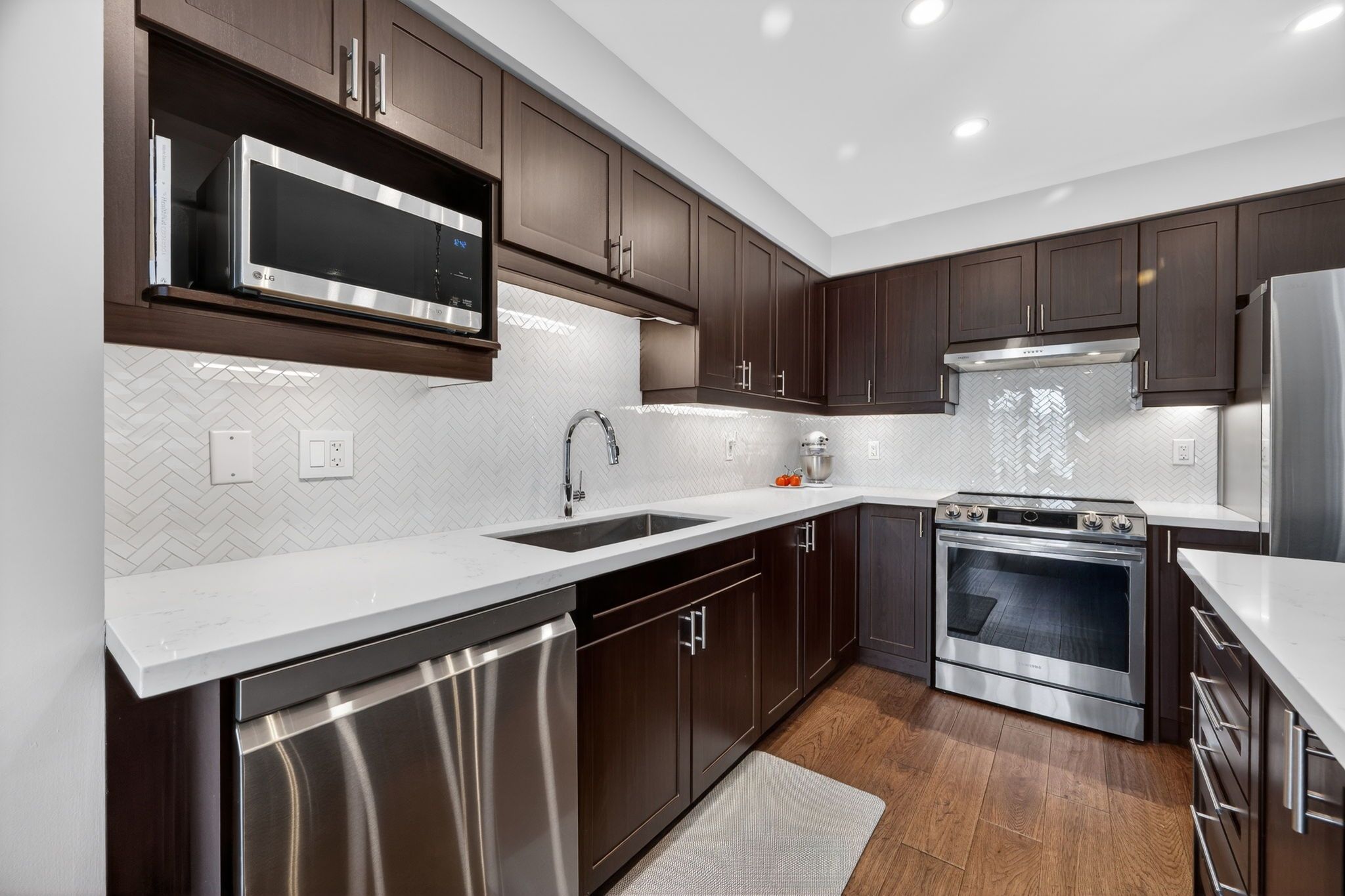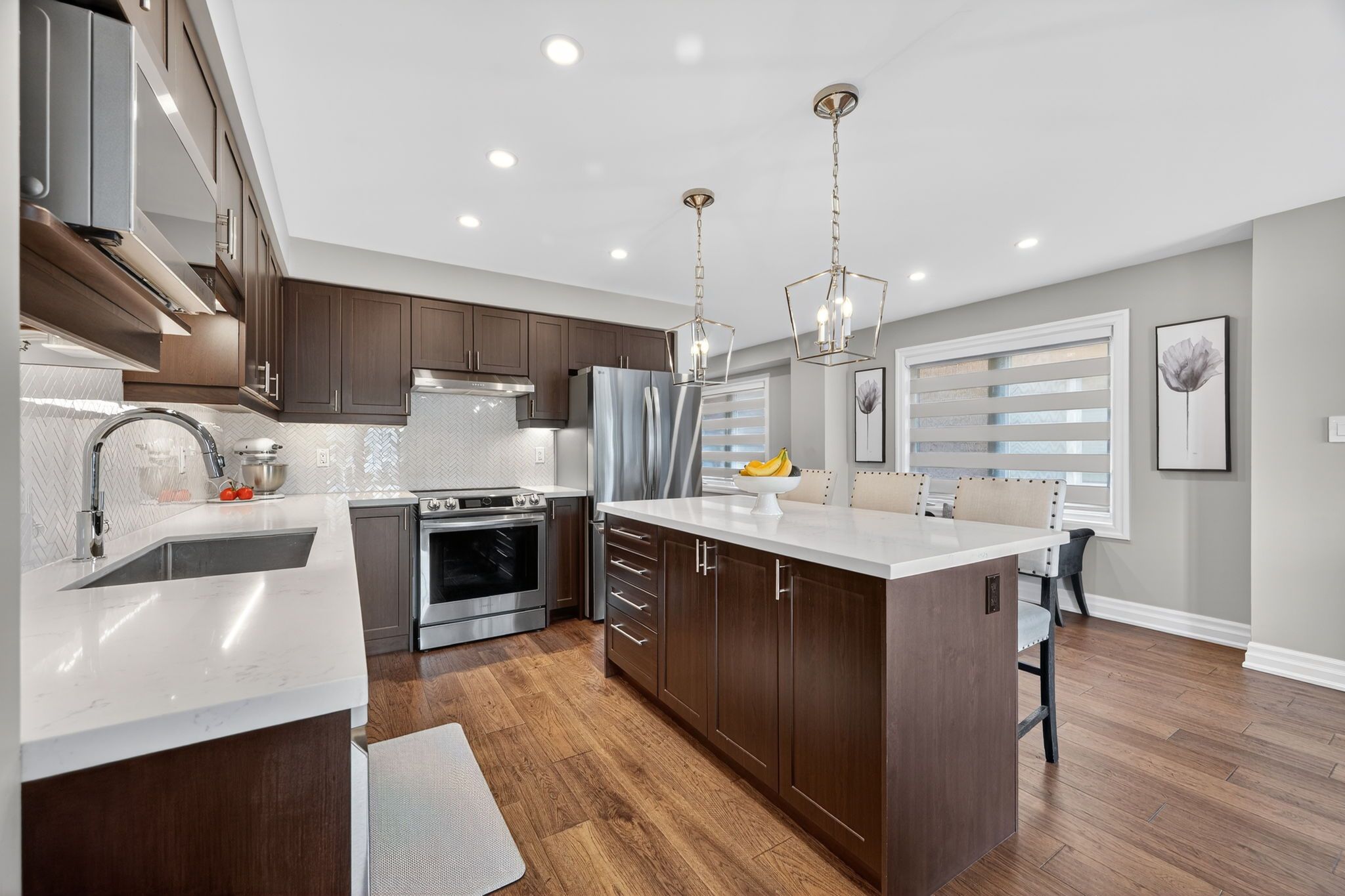 • Stylish open concept kitchen with quartz countertops and stainless steel appliances.