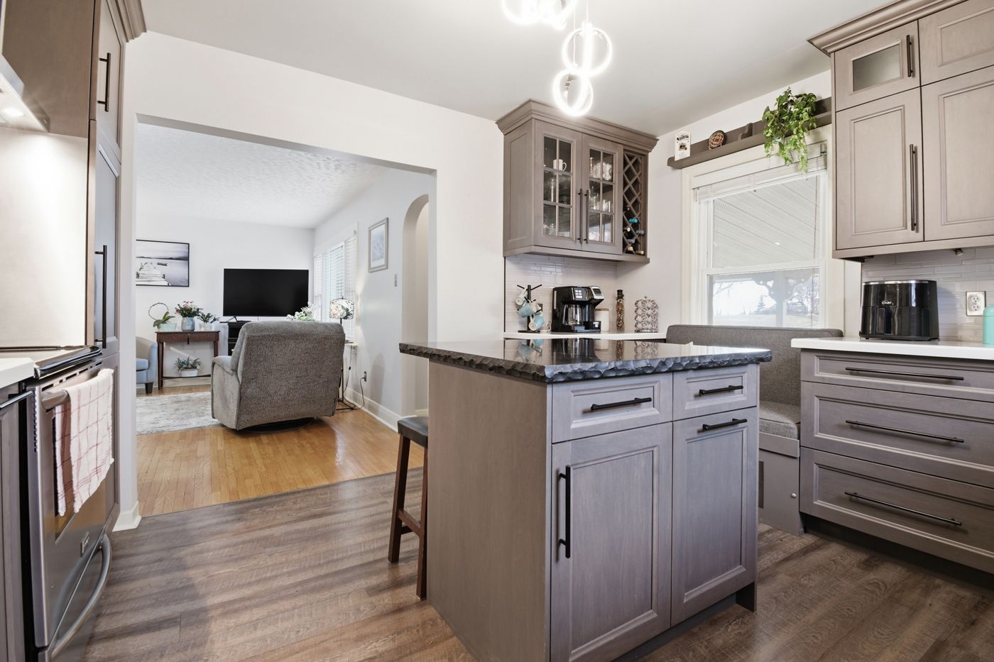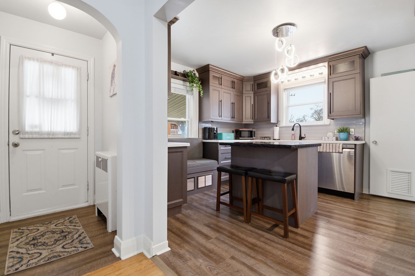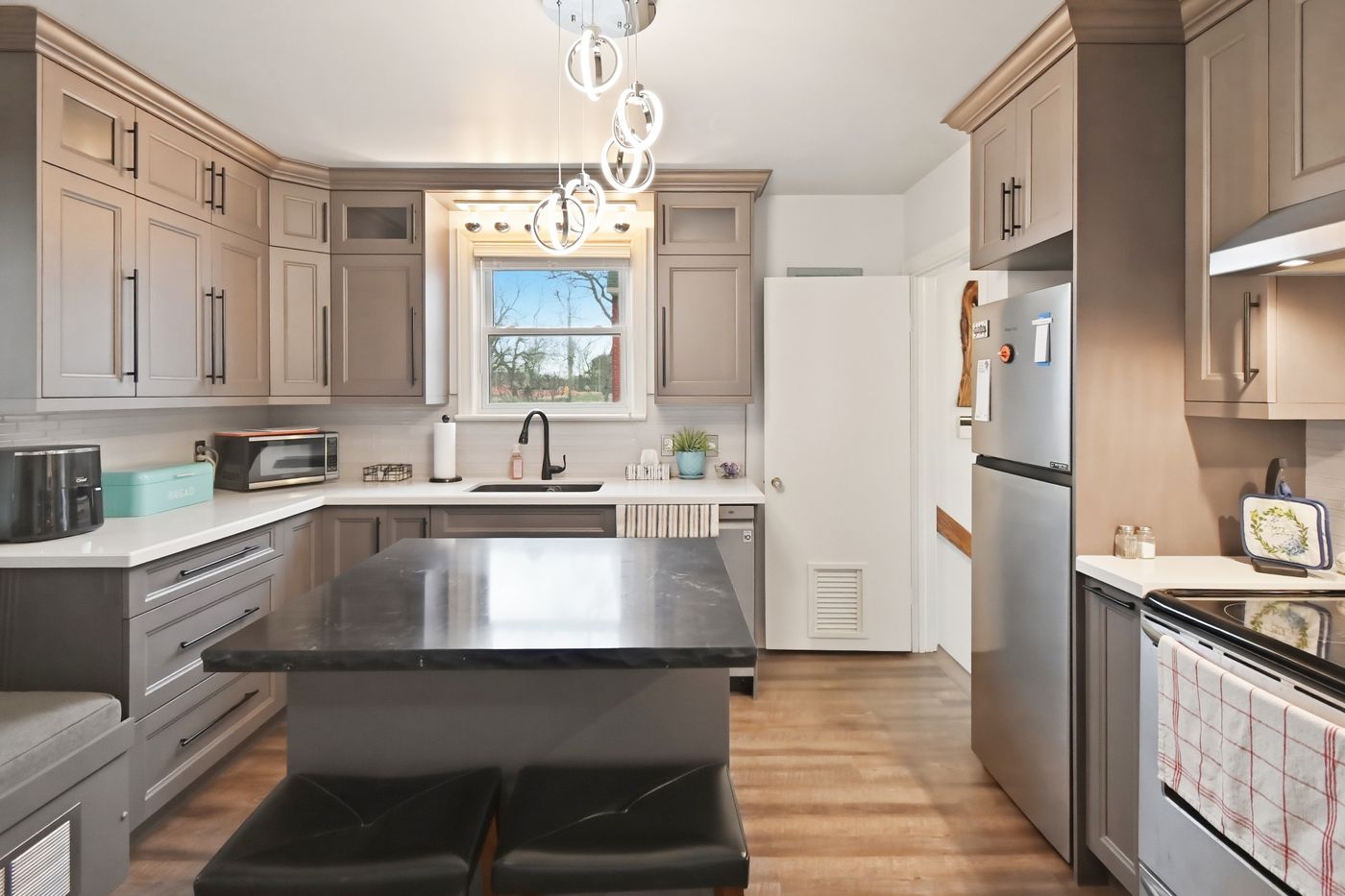 • New kitchen with a cozy breakfast island and park views.