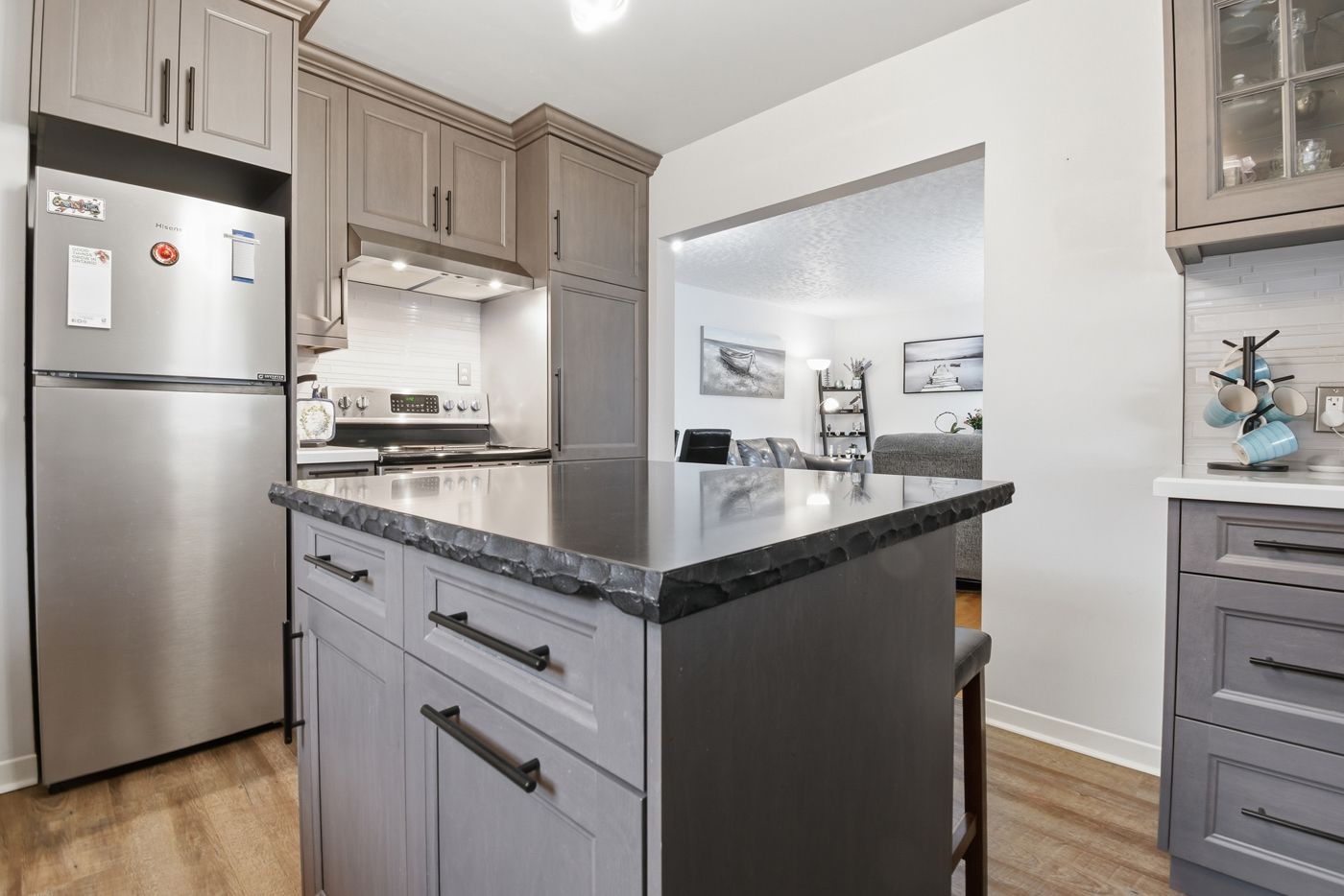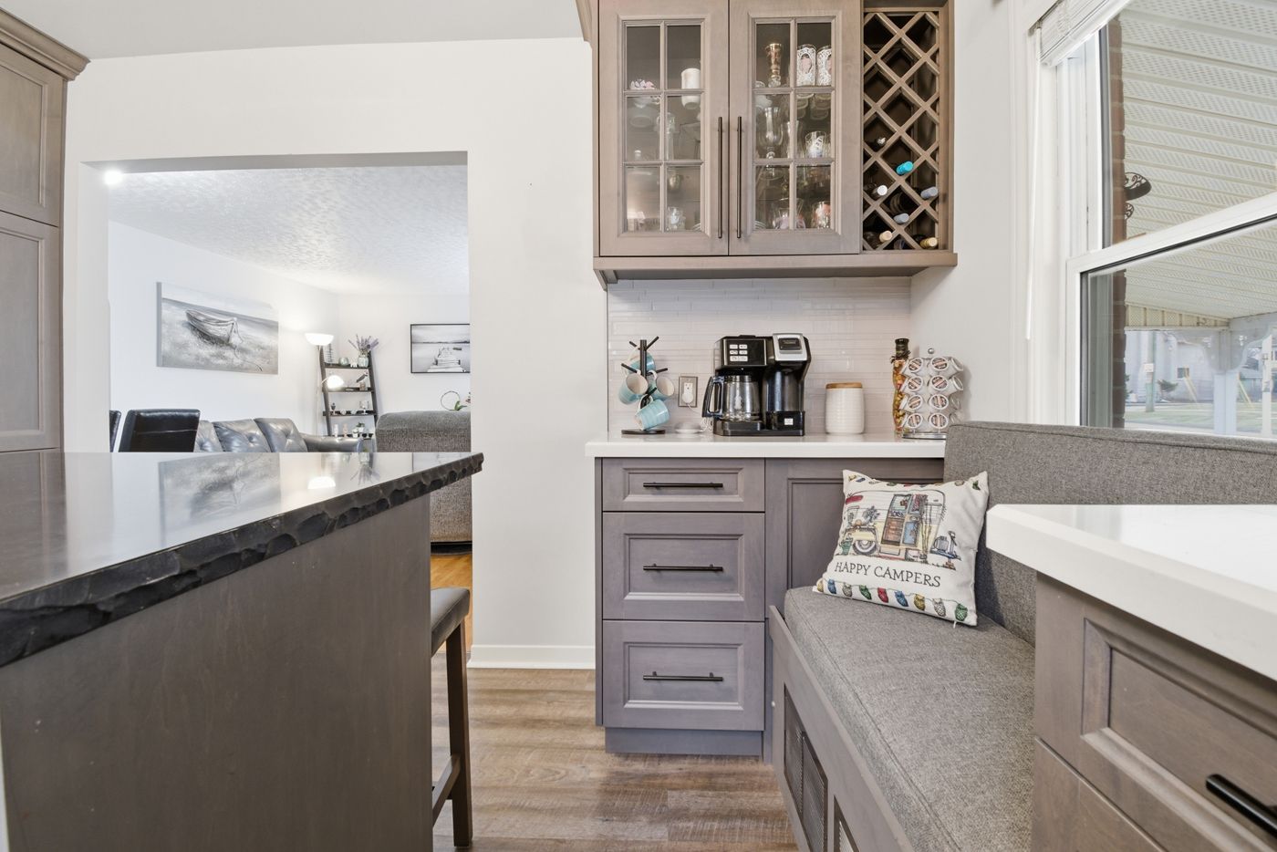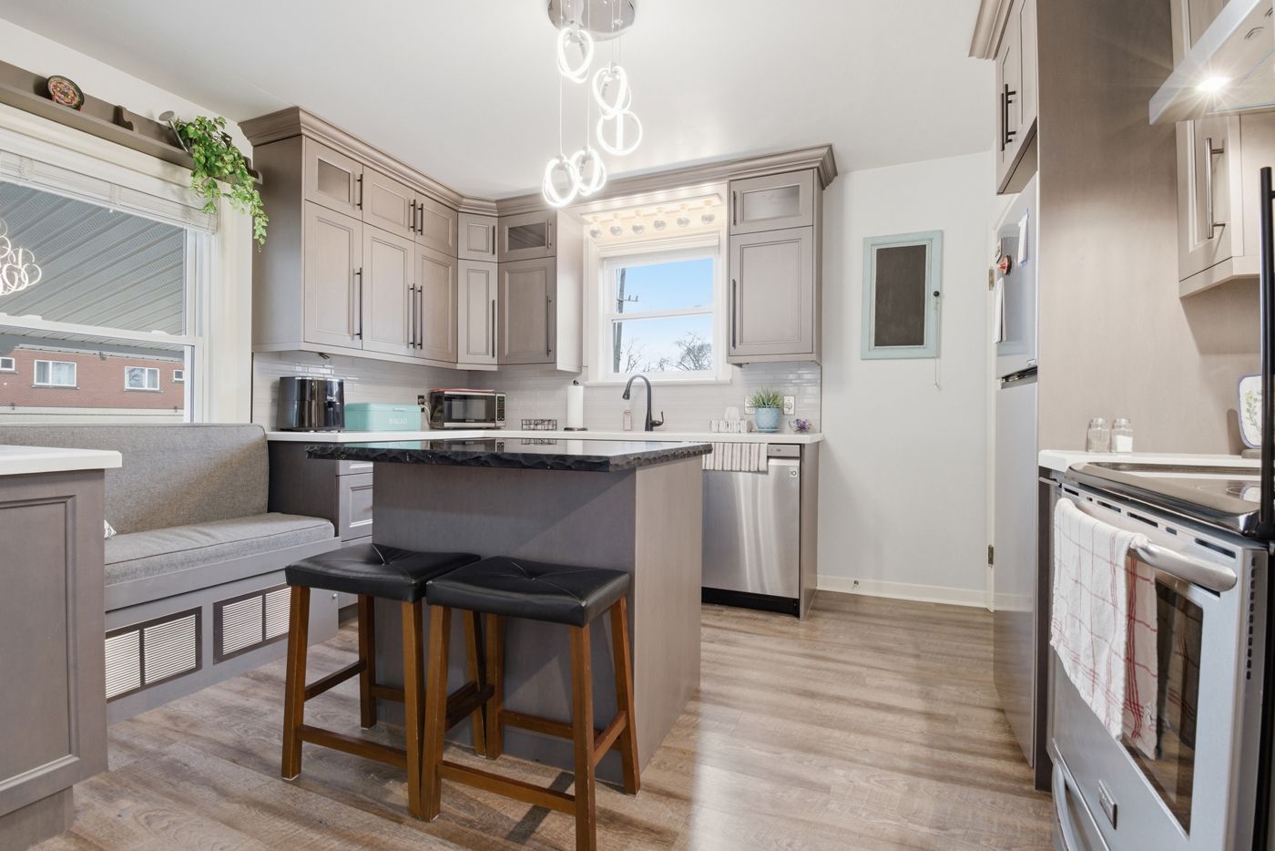 • New kitchen with a cozy breakfast island and park views.