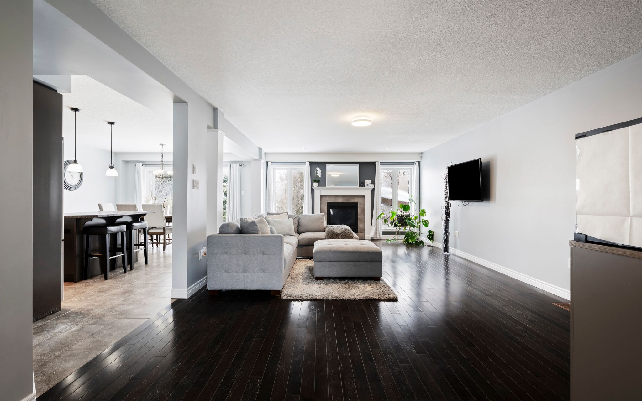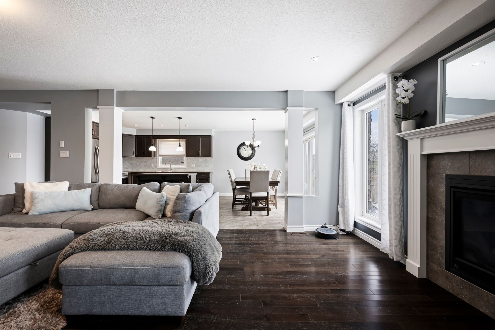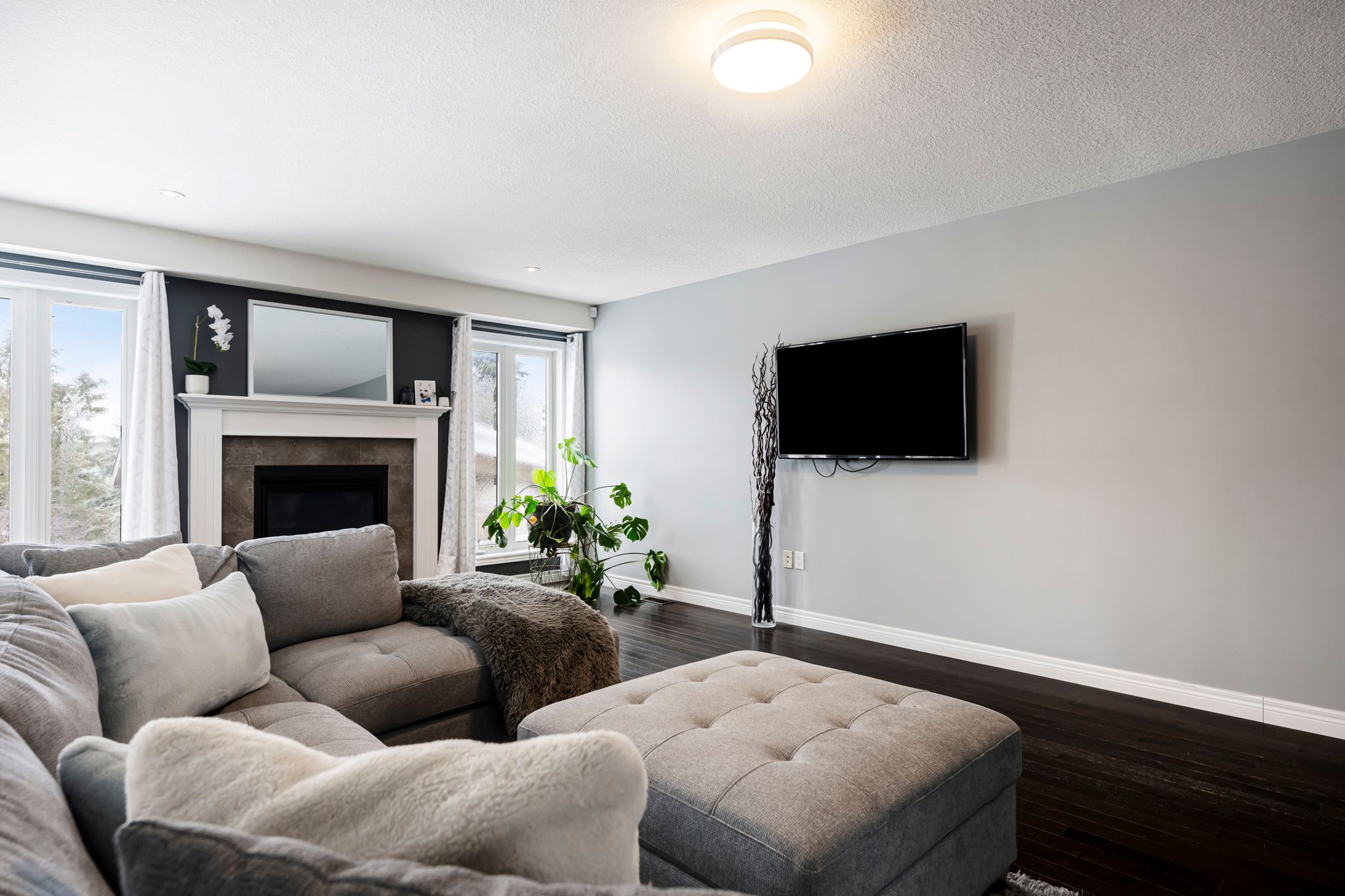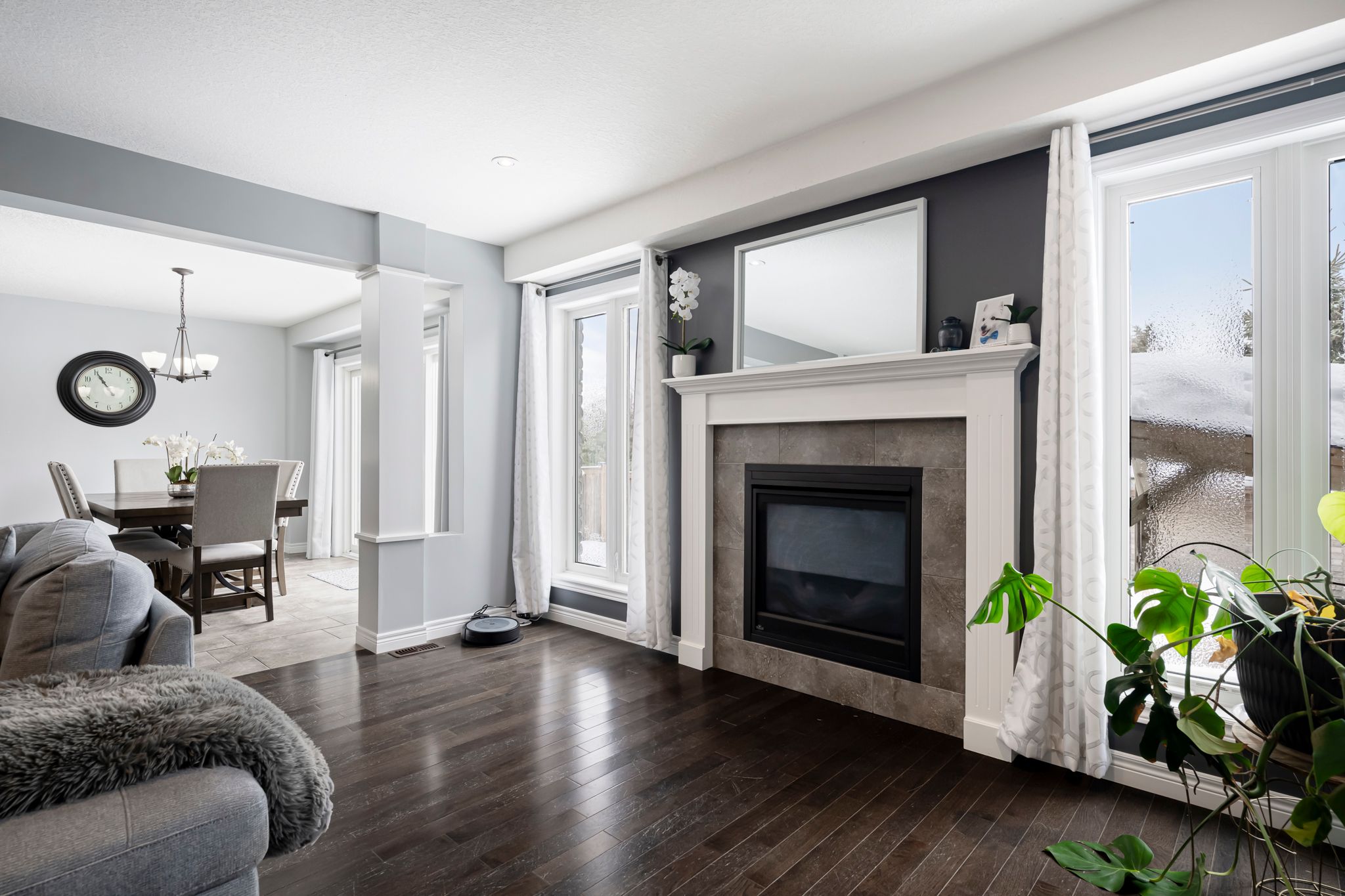 • Spacious layout with large windows and cozy gas fireplace for natural light.