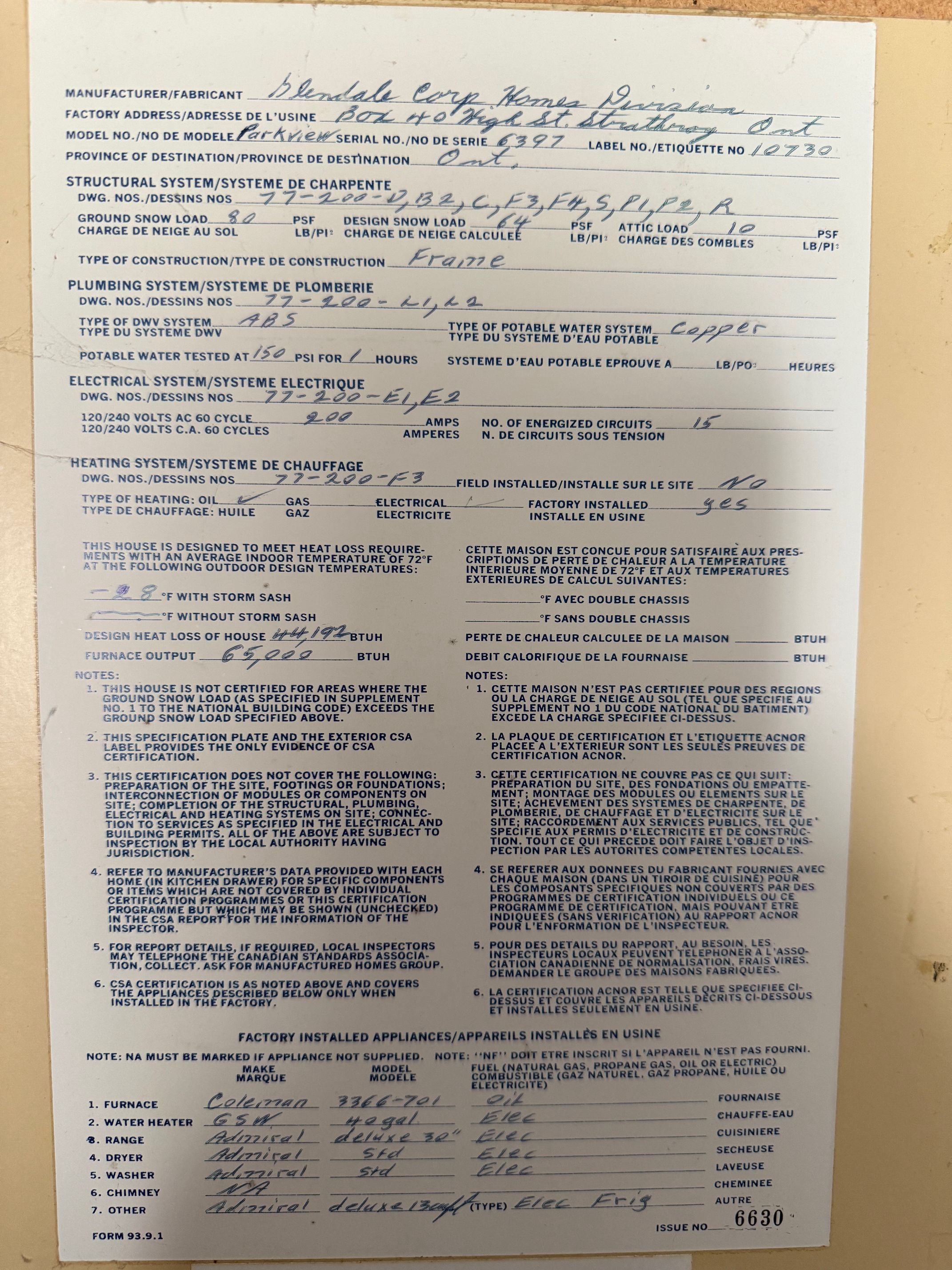Subtype MobileTrailerIndoor Features StorageOutdoor Features DeckOwnership FreeholdBasement NoneFoundation Concrete BlockHeating / Cooling Forced AirHeating Fuel PropaneSewer Septic