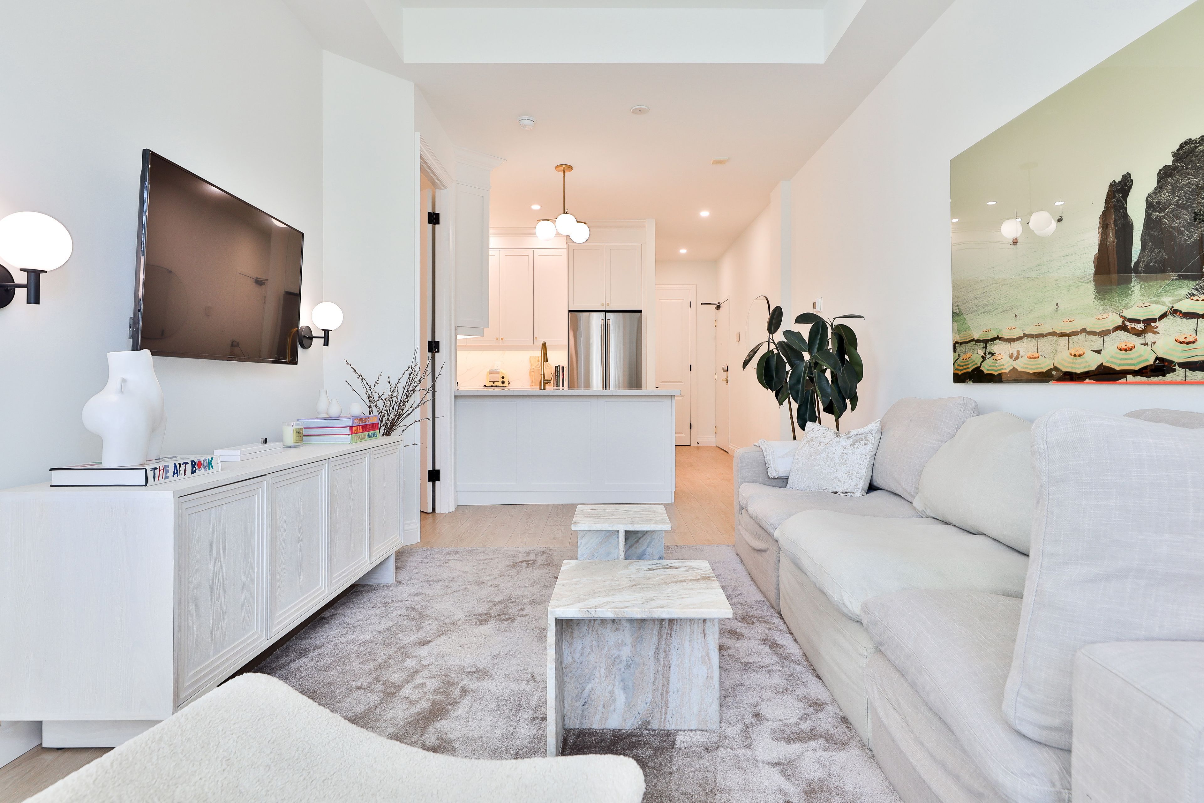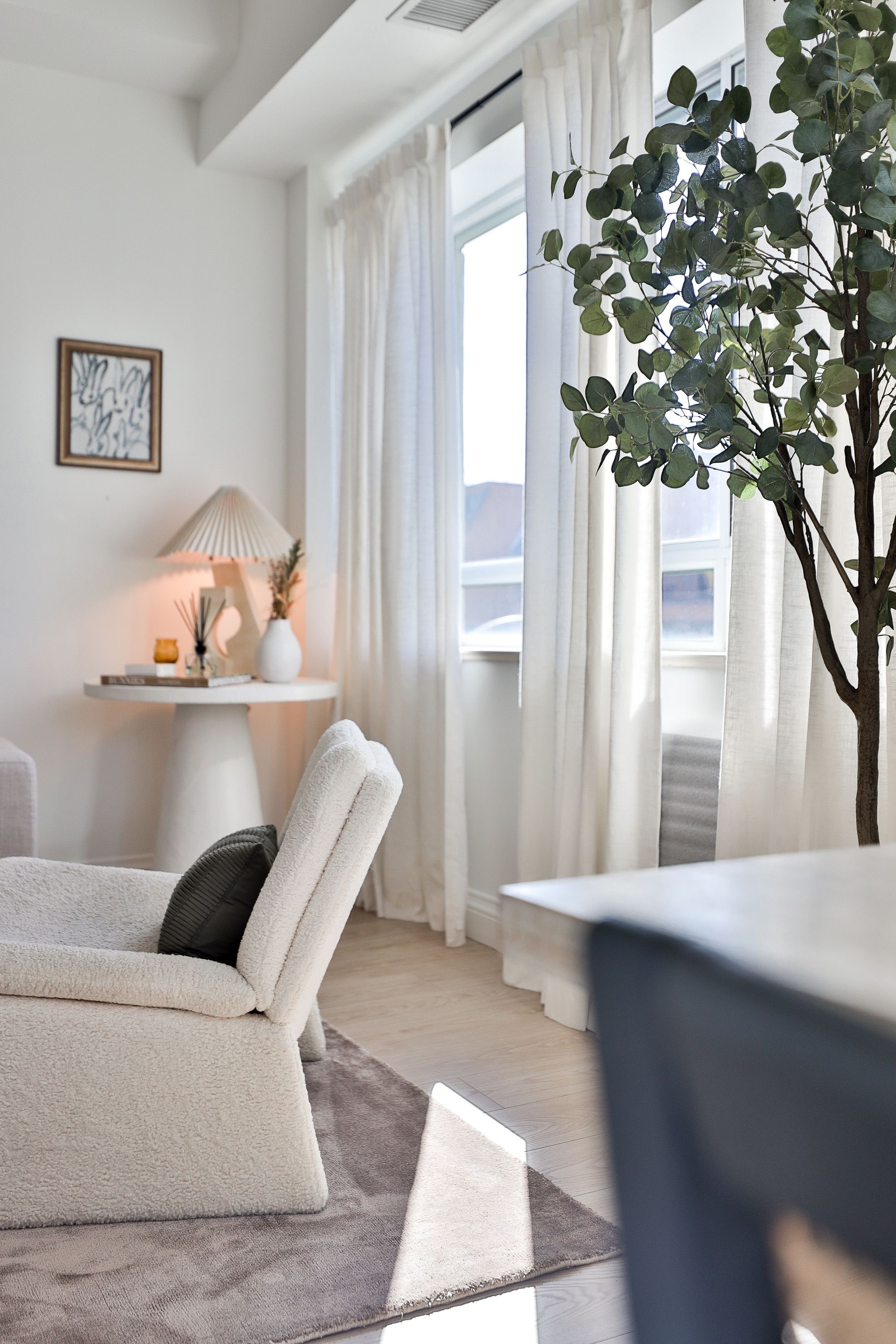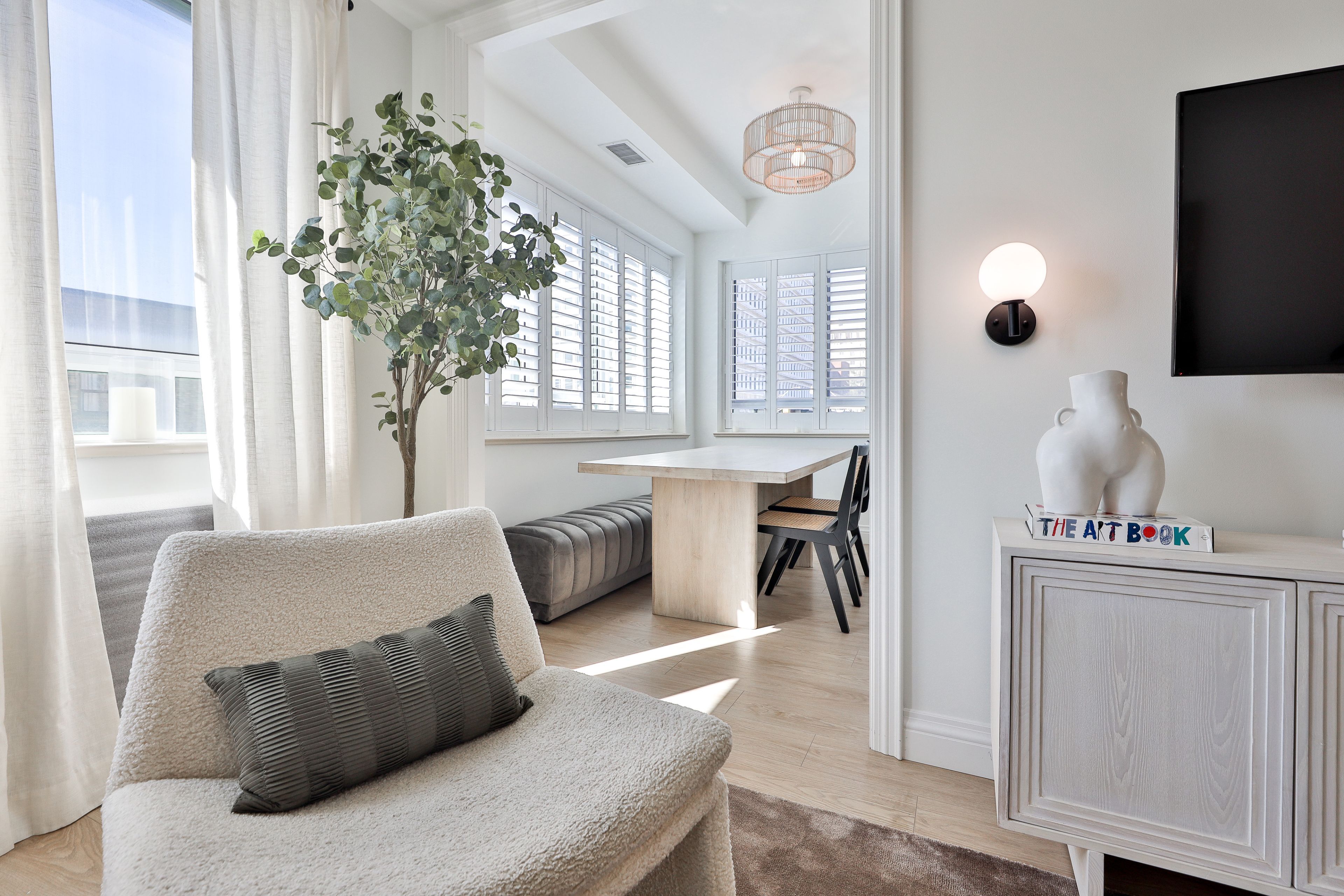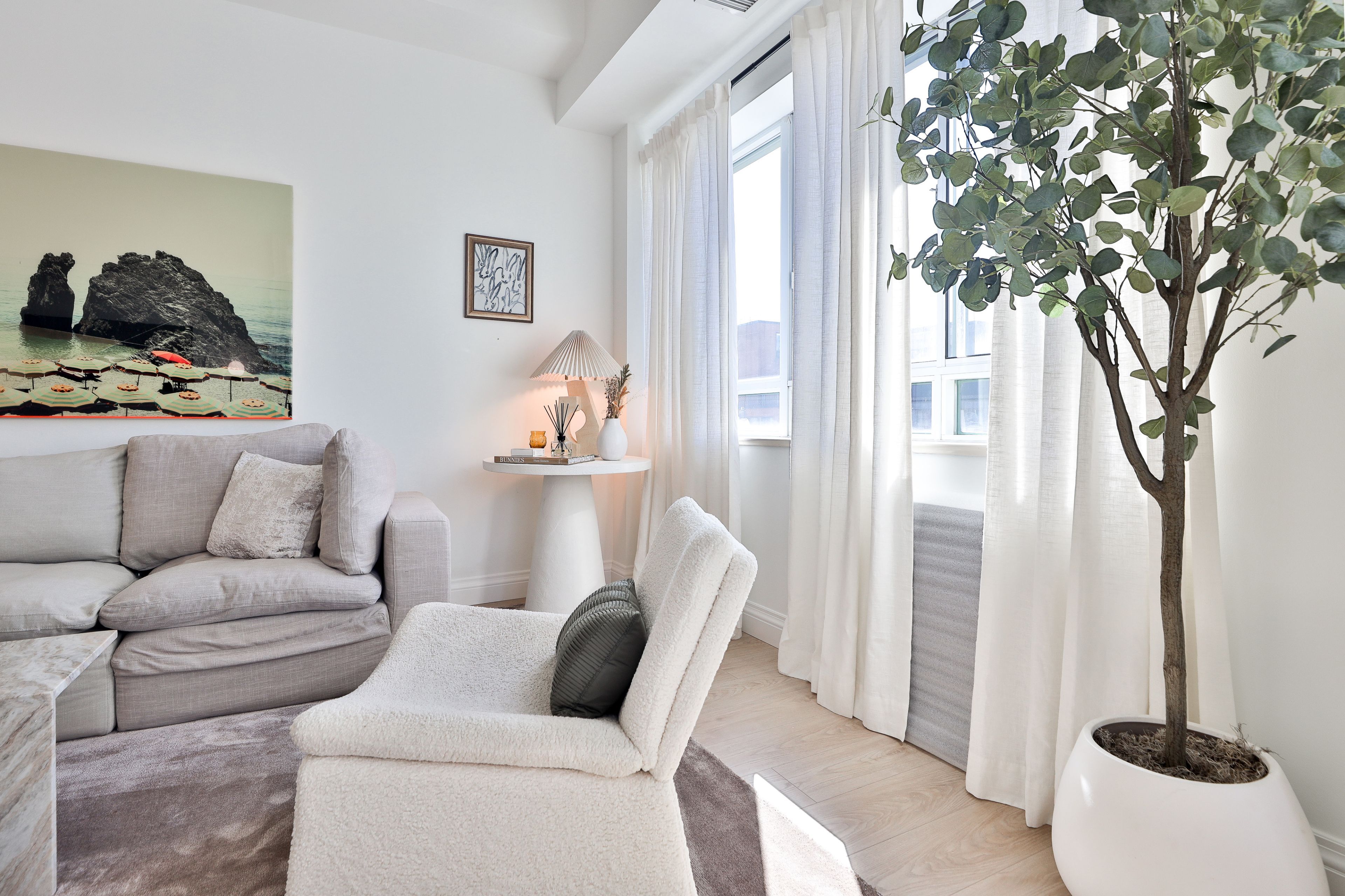 This is a one-plus den that knows exactly what it is. Fully renovated, meticulously maintained, and designed with restraint rather than excess. Every choice feels intentional. Not one moment out of place. At 840+ square feet, with expansive 10+ foot ceilings, the airy, open plan is immediately compelling & beautifully resolved. Sunlight moves freely throughout, amplifying proportions and giving this elegant residence a calm, architectural presence that feels larger than its footprint suggests. The palette is soft & disciplined. Wide plank engineered hardwood in a pale oak finish runs wall to wall, stretching sightlines and reinforcing a clean, gallery-like flow through the living and entertaining spaces. Custom details appear throughout, with flat-panel cabinetry, integrated storage, choice hardware, laundry, and tailored notes that read as elevated as the apartment itself. The kitchen strikes a confident balance between classic and contemporary. Shaker-inspired cabinetry is paired with warm brass hardware, a softly veined stone backsplash, and integrated, built-in appliances that keep everything neat and considered. The primary bedroom understands the assignment. A calm, light-toned envelope allows proportion to take the lead, with ceiling height adding quiet drama while sculptural lighting introduces warmth without visual clutter. Then there is the expansive walk-through closet. Not tucked away. Not an afterthought. Enviable, fully built-in with shelving, drawers, and hanging areas for those who love to spend. And finally, the den adapts without compromise. Dining. Office. Creative studio. It doesn't ask you to choose. It simply works. A summerhill suite with an all-star lineup: a proper entry, a true front hall closet, a well-appointed four-piece bath, all within a building that's safe, secure, and well managed...[cont'd]