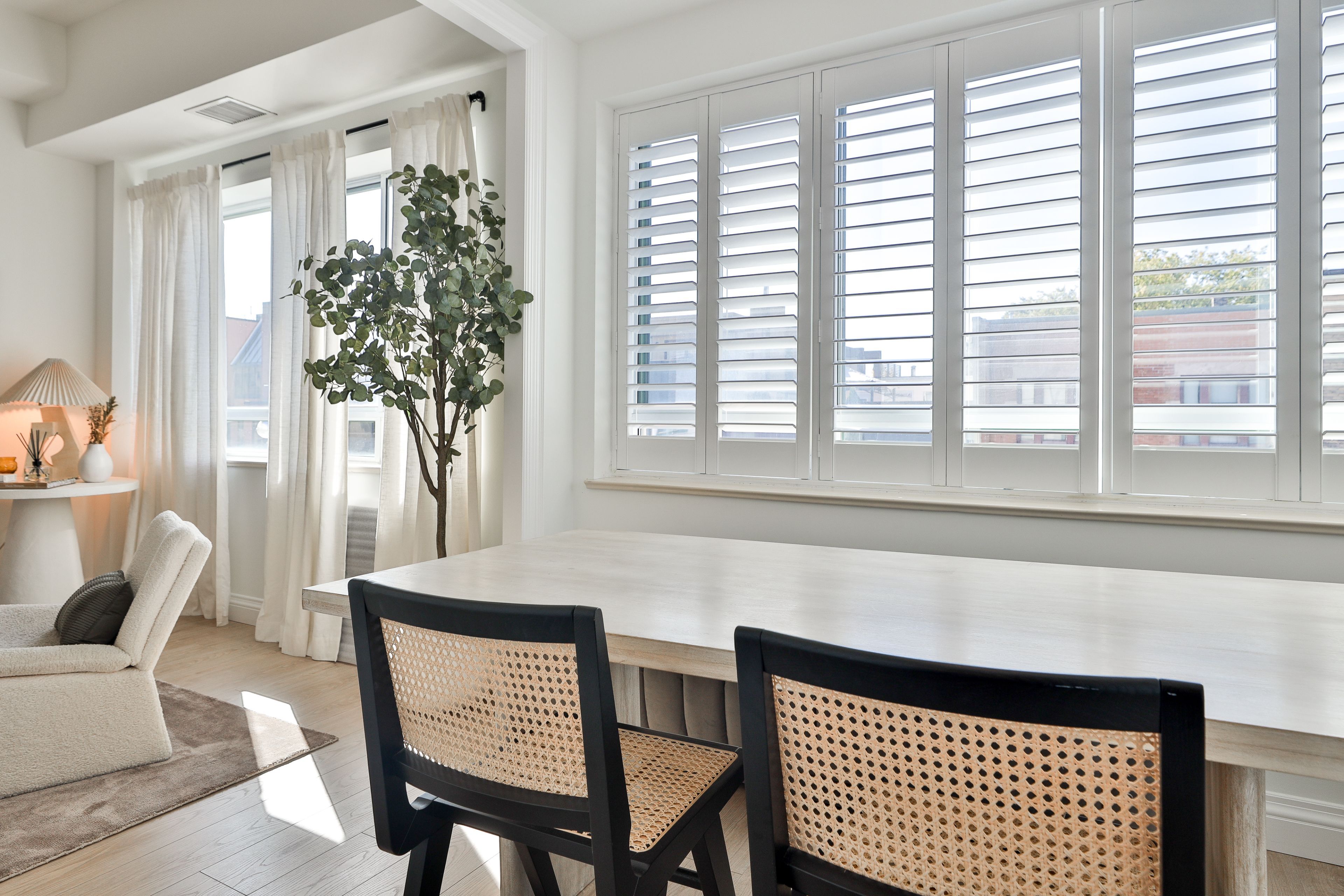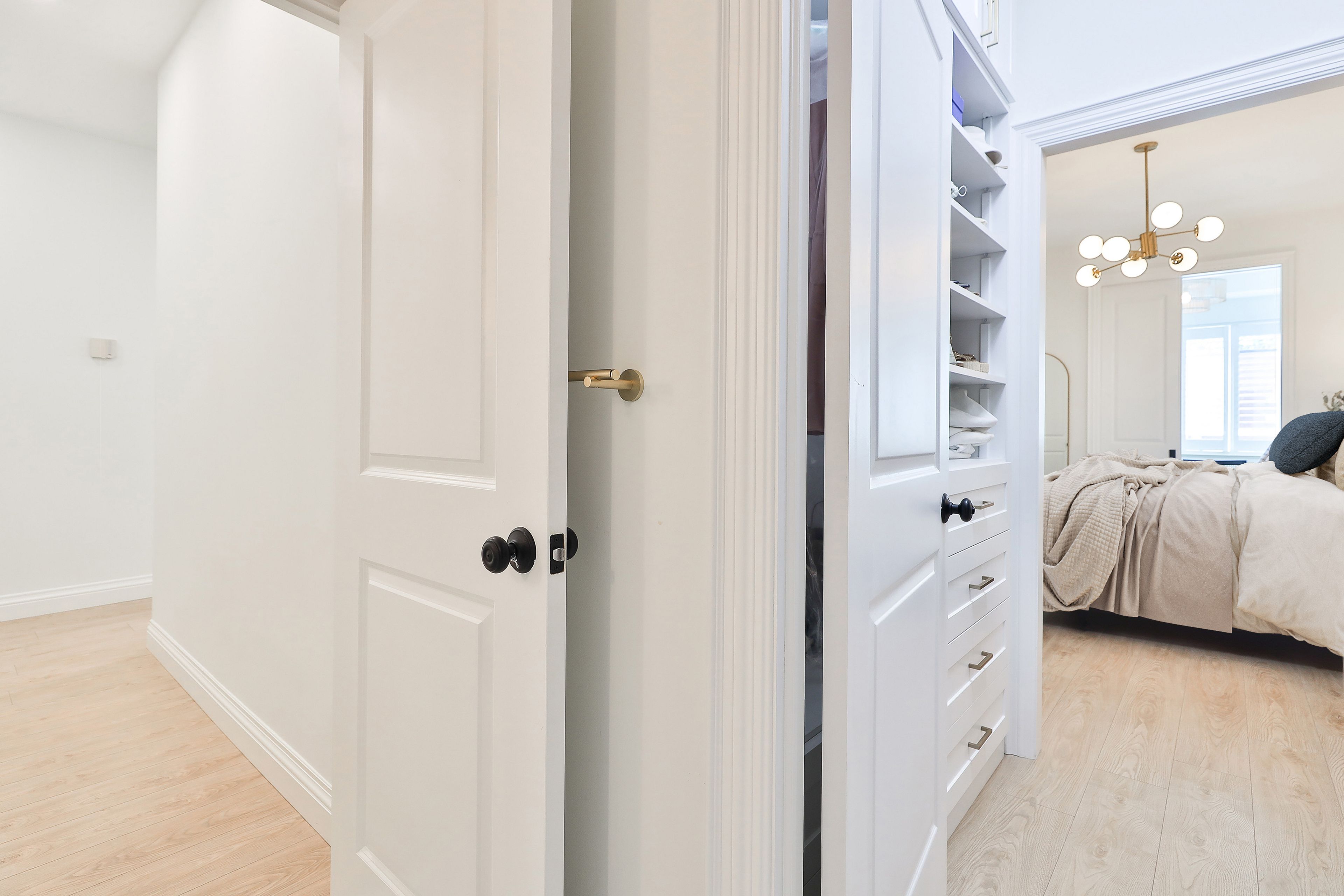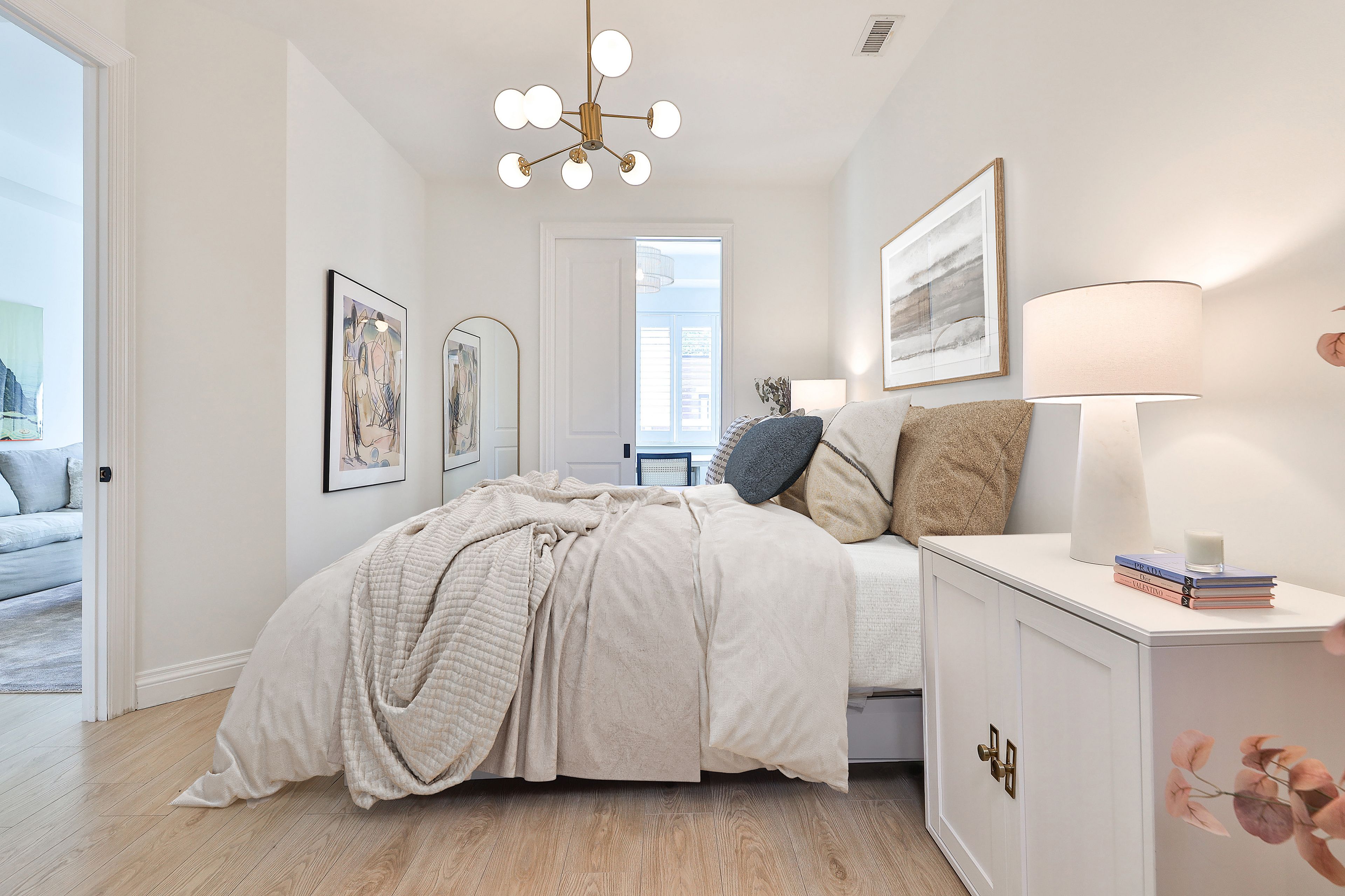This is a one-plus den that knows exactly what it is. Fully renovated, meticulously maintained, and designed with restraint rather than excess. Every choice feels intentional. Not one moment out of place. At 840+ square feet, with expansive 10+ foot ceilings, the airy, open plan is immediately compelling & beautifully resolved. Sunlight moves freely throughout, amplifying proportions and giving this elegant residence a calm, architectural presence that feels larger than its footprint suggests. The palette is soft & disciplined. Wide plank engineered hardwood in a pale oak finish runs wall to wall, stretching sightlines and reinforcing a clean, gallery-like flow through the living and entertaining spaces. Custom details appear throughout, with flat-panel cabinetry, integrated storage, choice hardware, laundry, and tailored notes that read as elevated as the apartment itself. The kitchen strikes a confident balance between classic and contemporary. Shaker-inspired cabinetry is paired with warm brass hardware, a softly veined stone backsplash, and integrated, built-in appliances that keep everything neat and considered. The primary bedroom understands the assignment. A calm, light-toned envelope allows proportion to take the lead, with ceiling height adding quiet drama while sculptural lighting introduces warmth without visual clutter. Then there is the expansive walk-through closet. Not tucked away. Not an afterthought. Enviable, fully built-in with shelving, drawers, and hanging areas for those who love to spend. And finally, the den adapts without compromise. Dining. Office. Creative studio. It doesn't ask you to choose. It simply works. A summerhill suite with an all-star lineup: a proper entry, a true front hall closet, a well-appointed four-piece bath, all within a building that's safe, secure, and well managed...[cont'd]