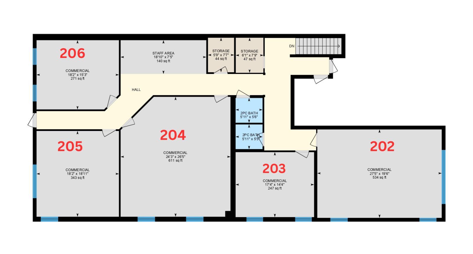 • Bright and spacious 343 sq. ft. office unit on the second floor.