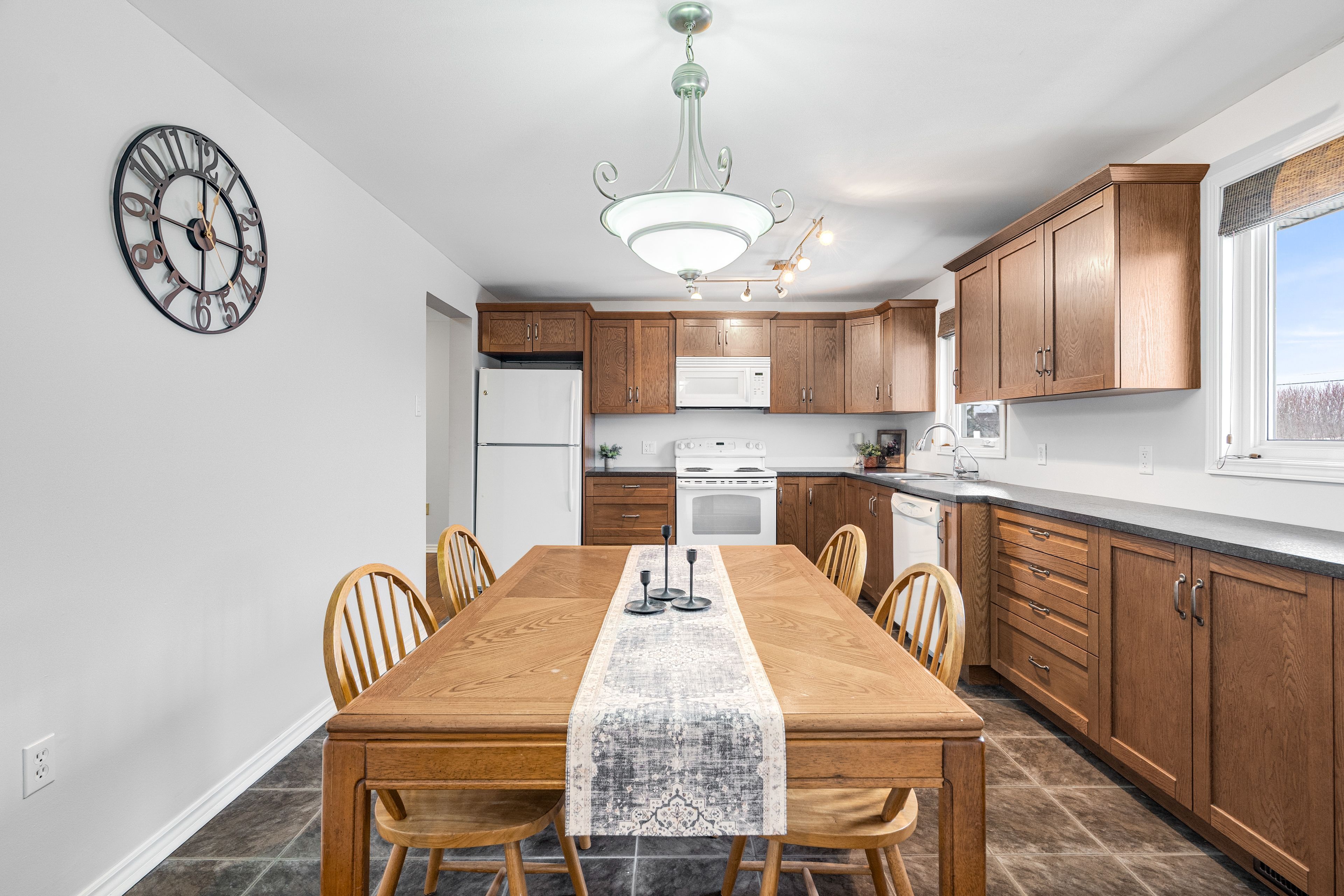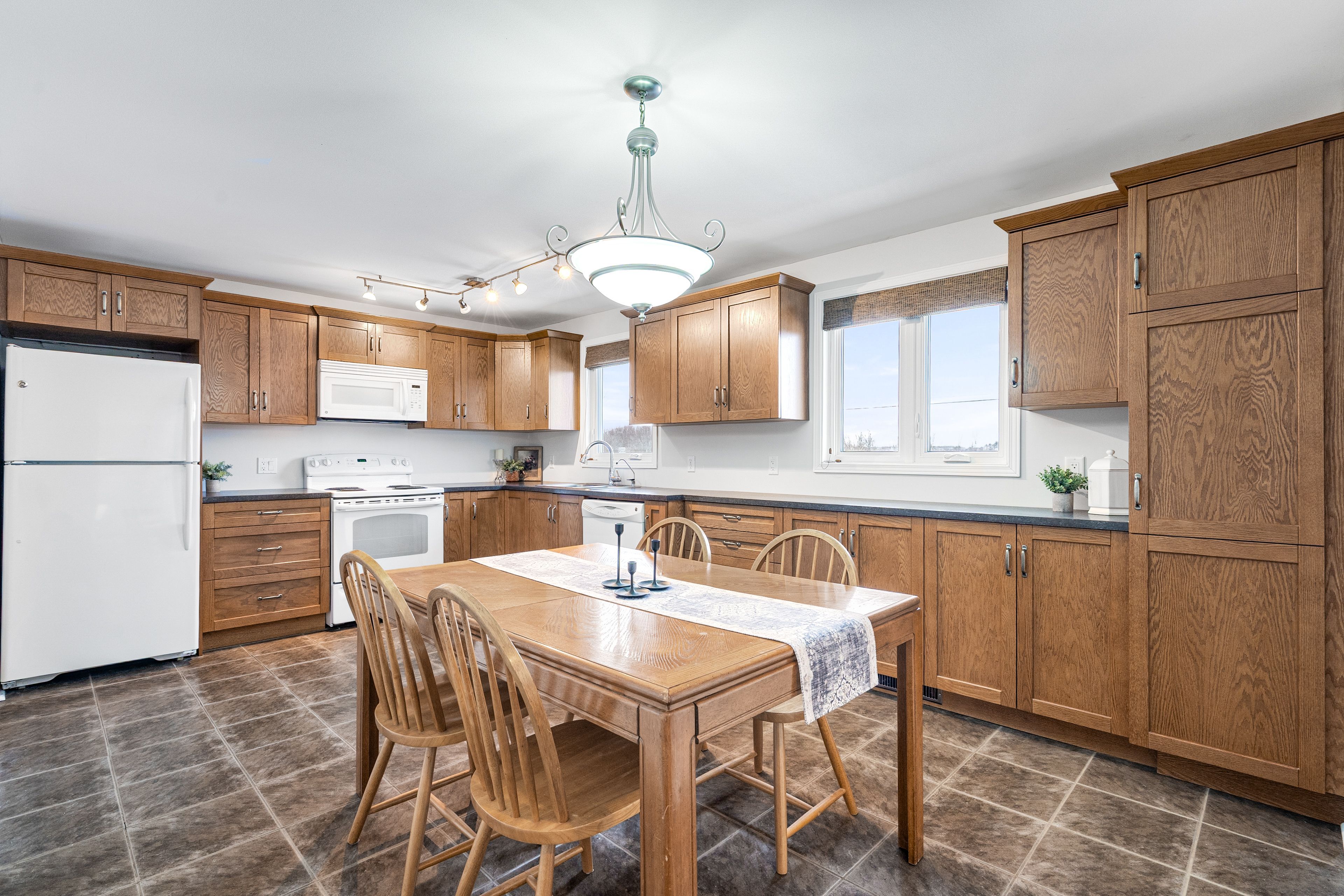• Bright eat-in kitchen with solid oak cabinetry for functionality.