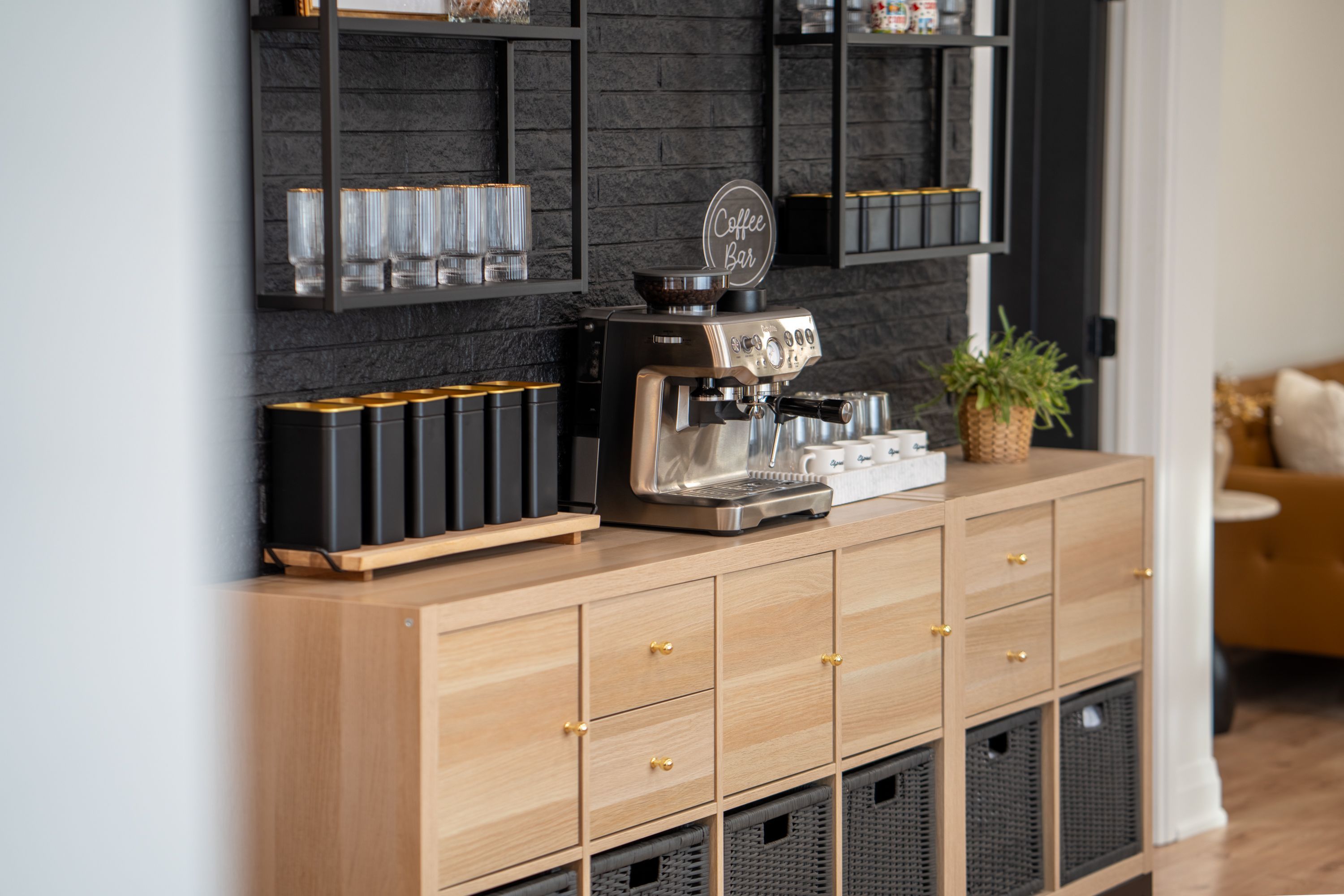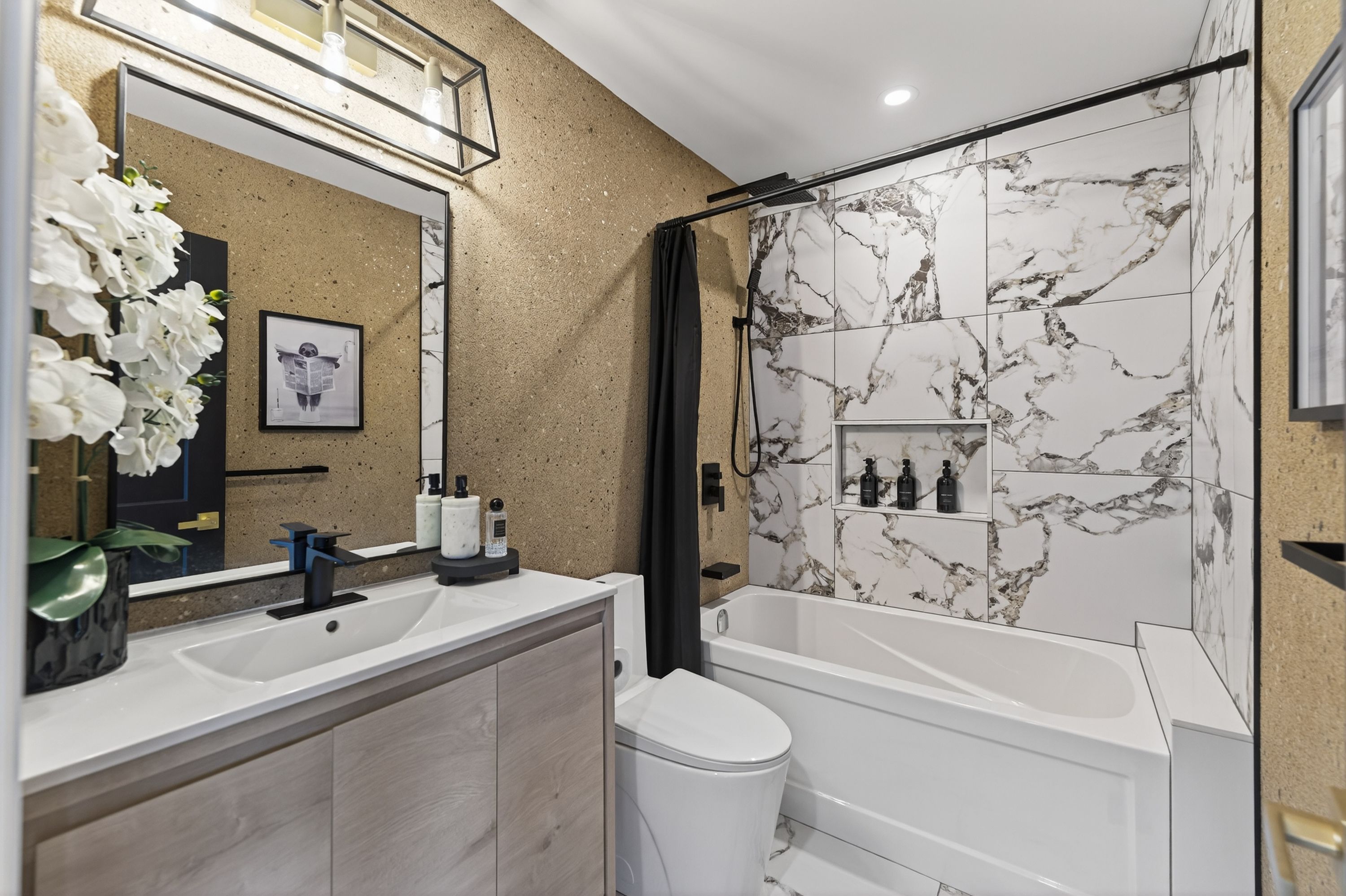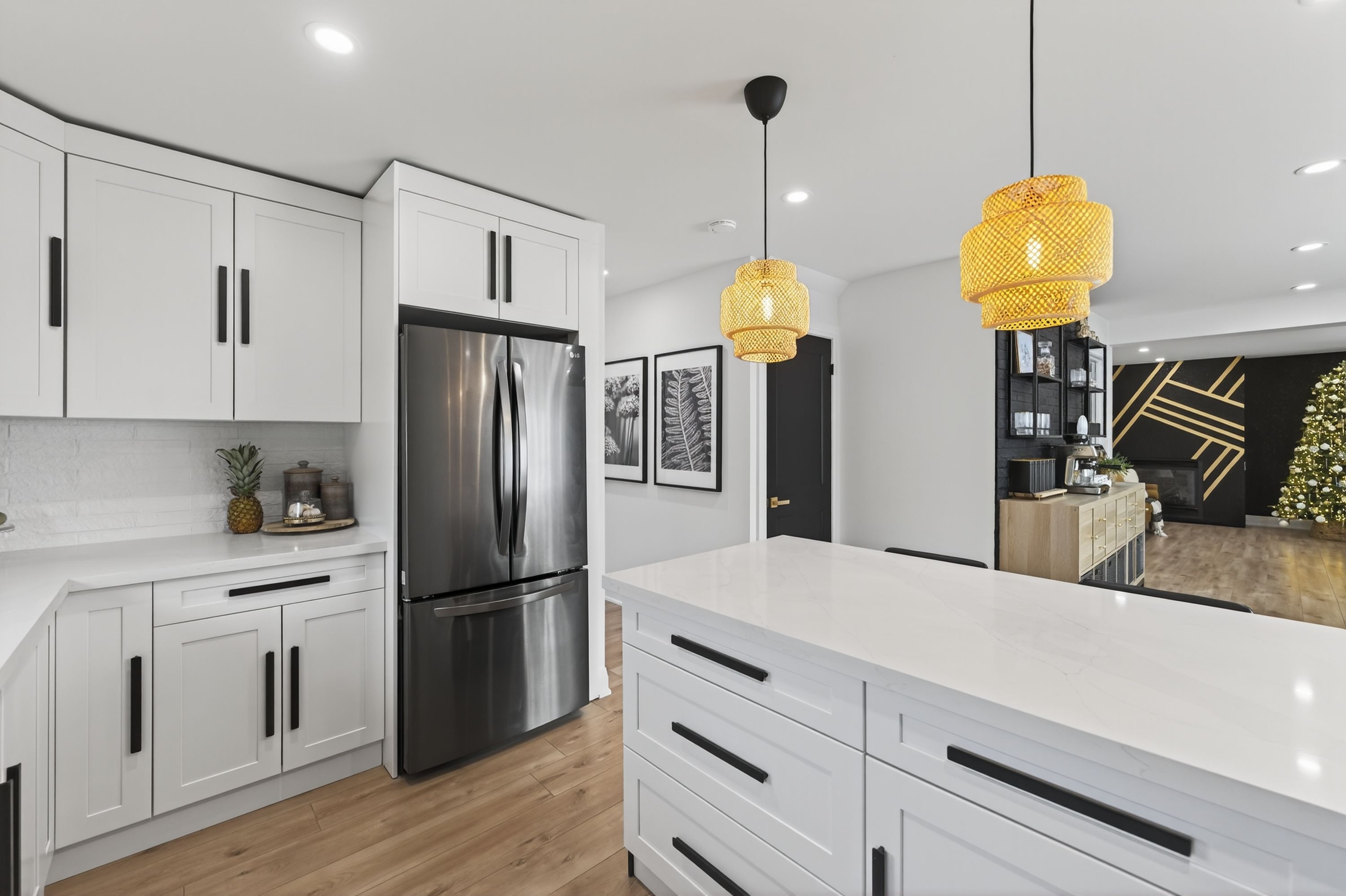 • Modern kitchen featuring quartz countertops and black stainless steel appliances.
