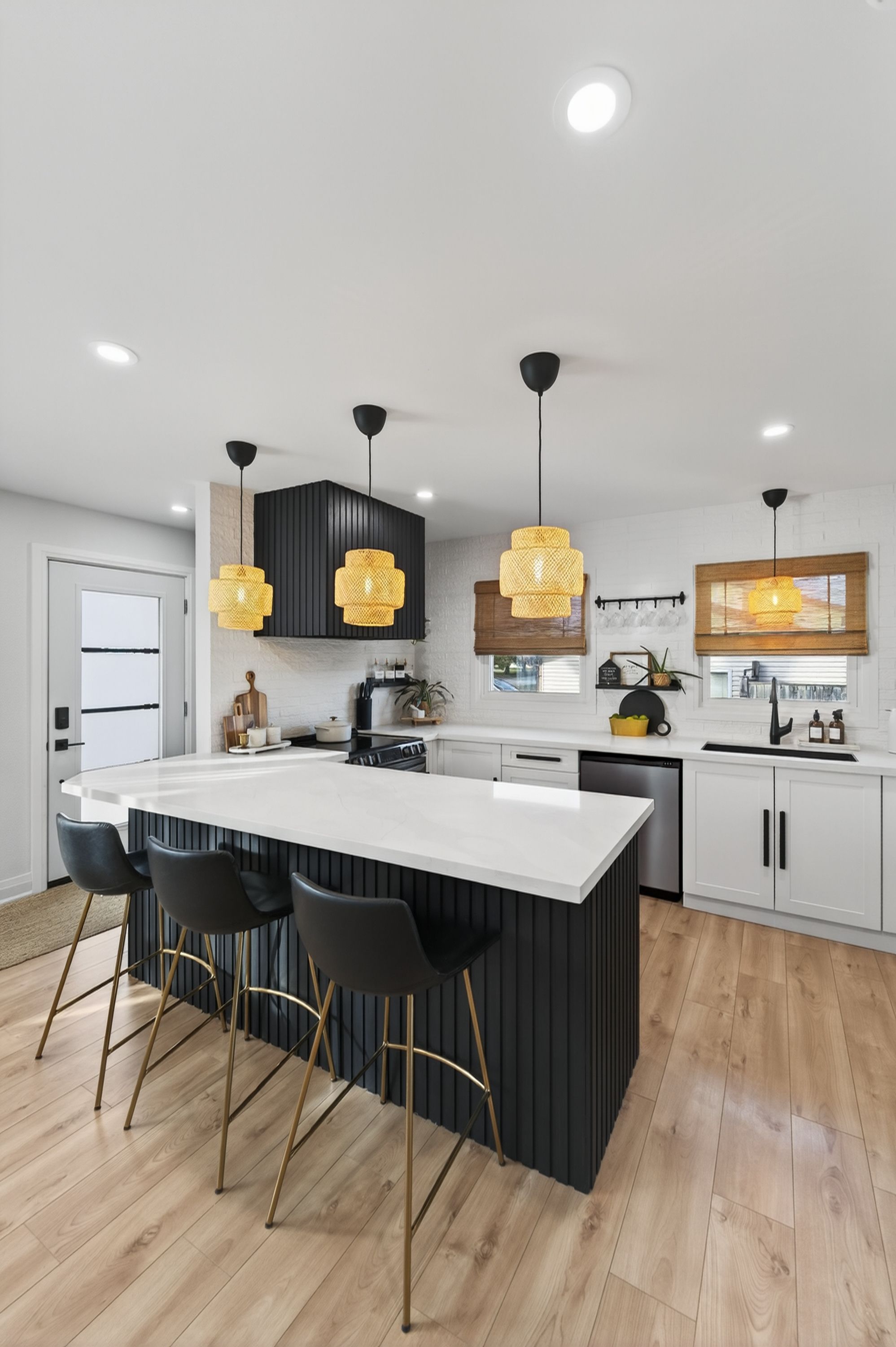 • Modern kitchen features quartz countertops and black stainless steel appliances.