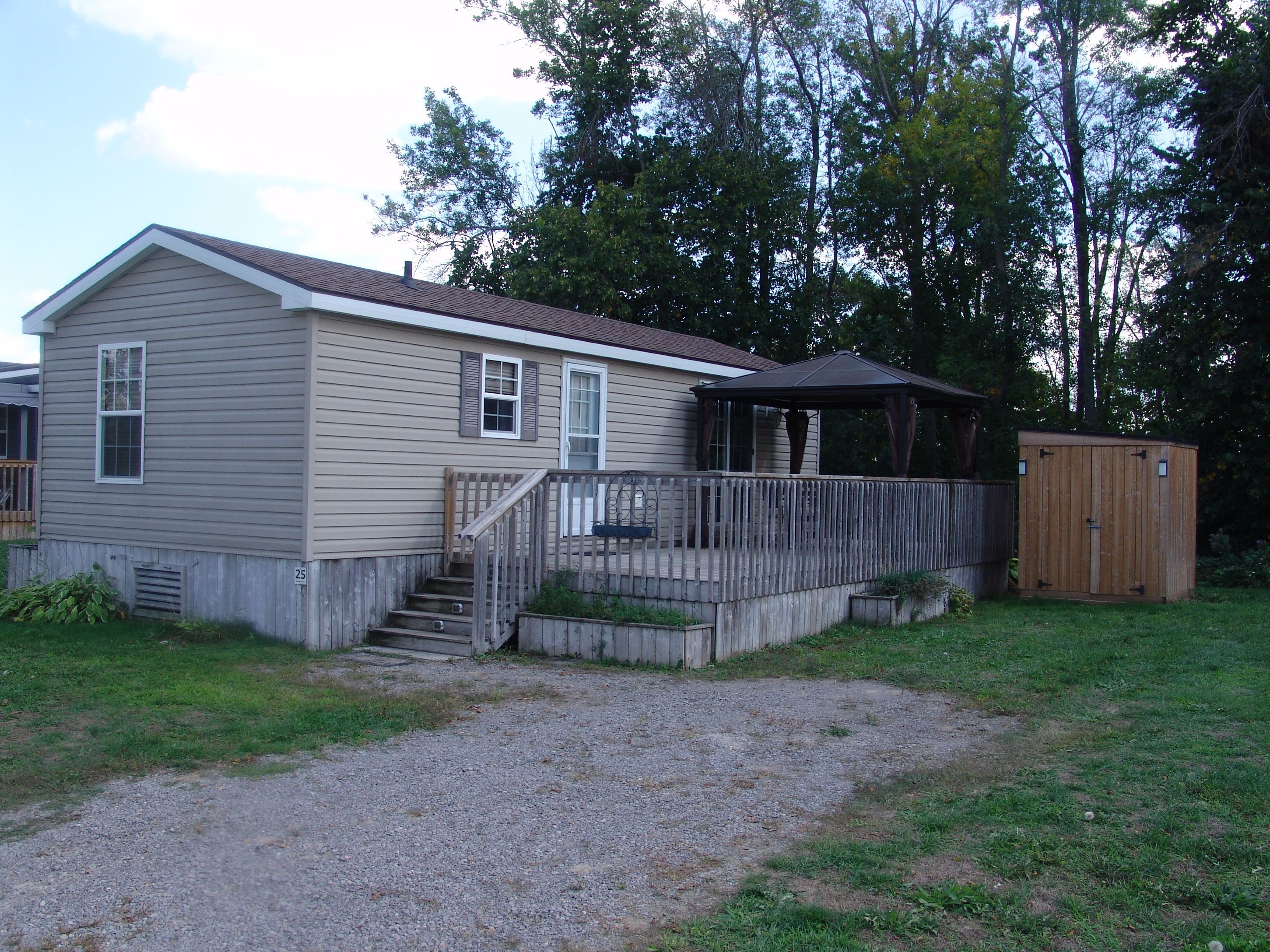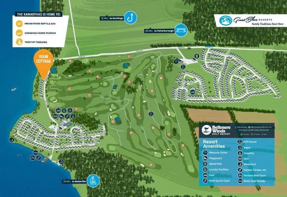 Experience pure relaxation at bellmere winds golf resort, stretching from the north shore of rice lake to the furthest sand bunker and just minutes from the vibrant city of peterborough. This resort offers the perfect escape located in phase one, 25 godfrey's lane is a tree-lined, sought-after waterfront premium site backing onto the peaceful 11th, 12th & 13th greens. Offering a spacious living/family room, full eat-in kitchen with breakfast bar, primary bedroom with queen bed & walk-in closet, second bedroom features bunkbeds with 1 double & 1 single, 1 pull-out couch sleeps two, 4 pc. Bath and walkout to a large pressure-treated deck with hard top gazebo! The cottage provides a private, scenic, luxurious escape with direct access to rice lake. Just steps from the beach, docks, water sports, gym and sports courts, blending tranquil waterfront living with unbeatable proximity to amenities. It's a perfect destination for both golf lovers and families; you're never too young to enjoy the great outdoors! Offering several fantastic family-friendly activities, including 2 saltwater swimming pools, a splash pad, a beach, exciting resort activities and unmatched firework displays. Featuring 18 challenging yet approachable holes, this course caters to all skill levels, with tee blocks set for both novices and scratch golfers. The front nine evokes the feel of a scottish links course, with breathtaking vistas of rice lake reminiscent of the bonnie banks of loch lomond. The back nine is more forgiving, highlighted by a stunning elevated 10th hole, while the 11th and 12th play along the lakeside resort with stunning lake views!
