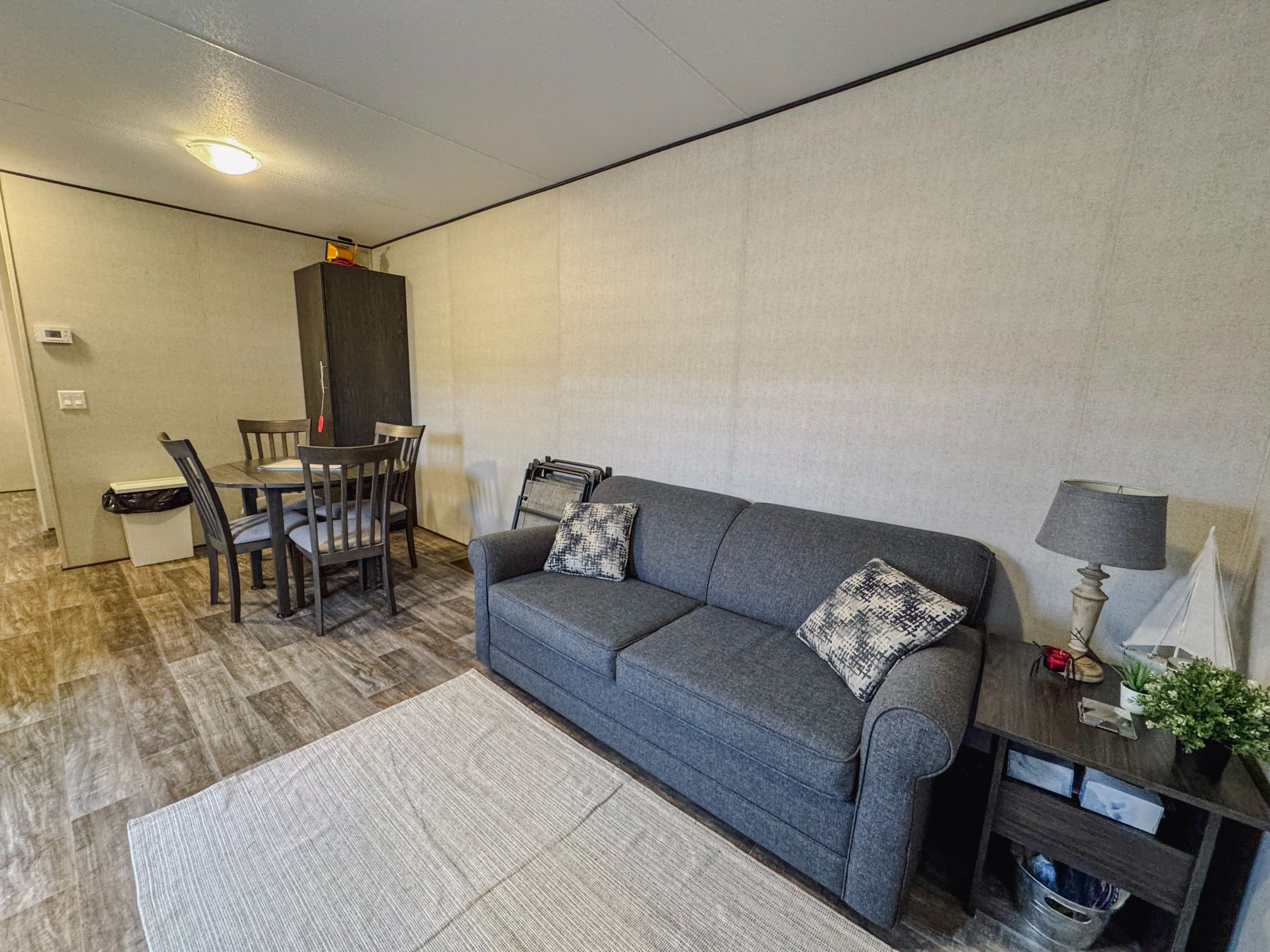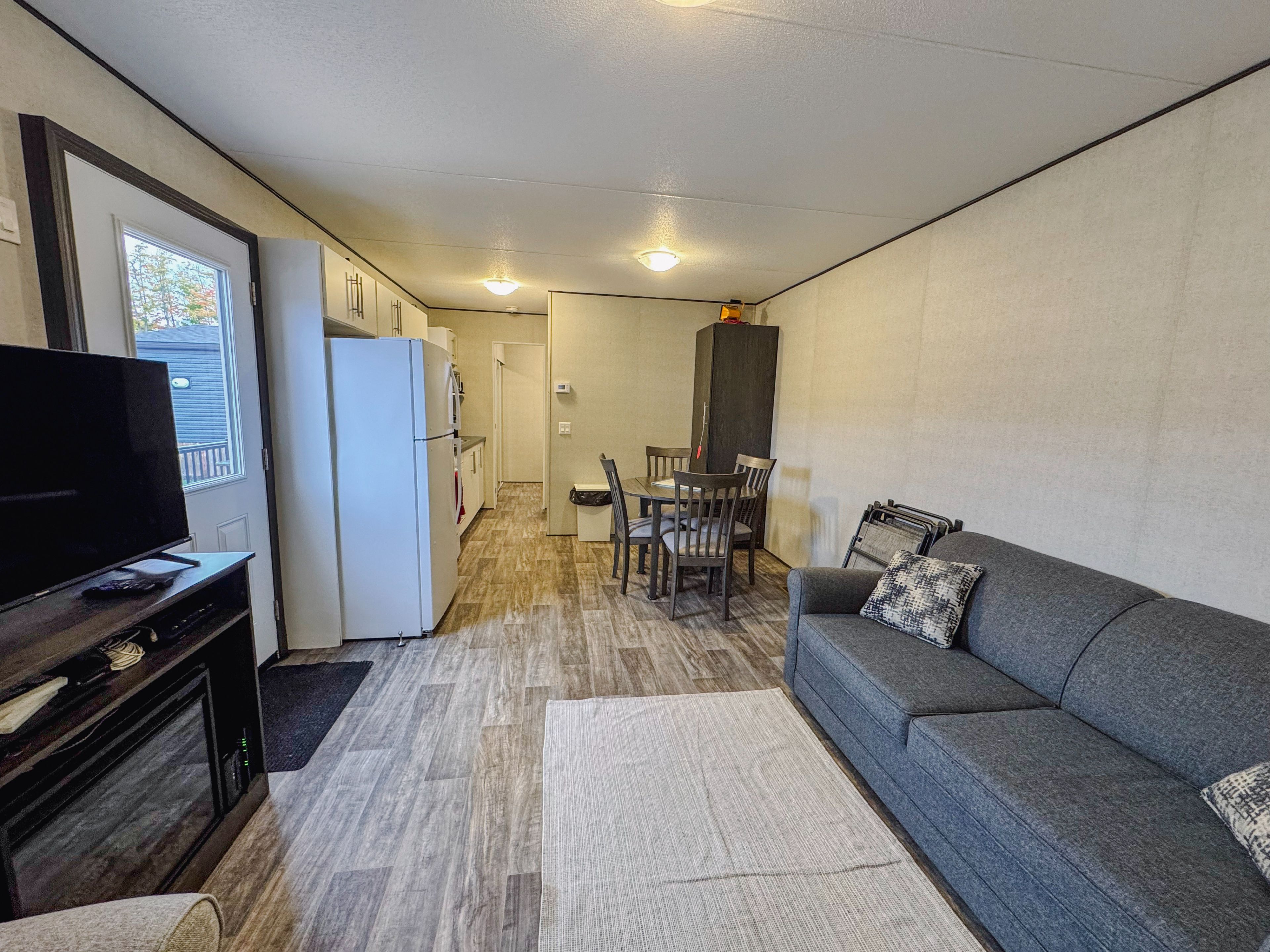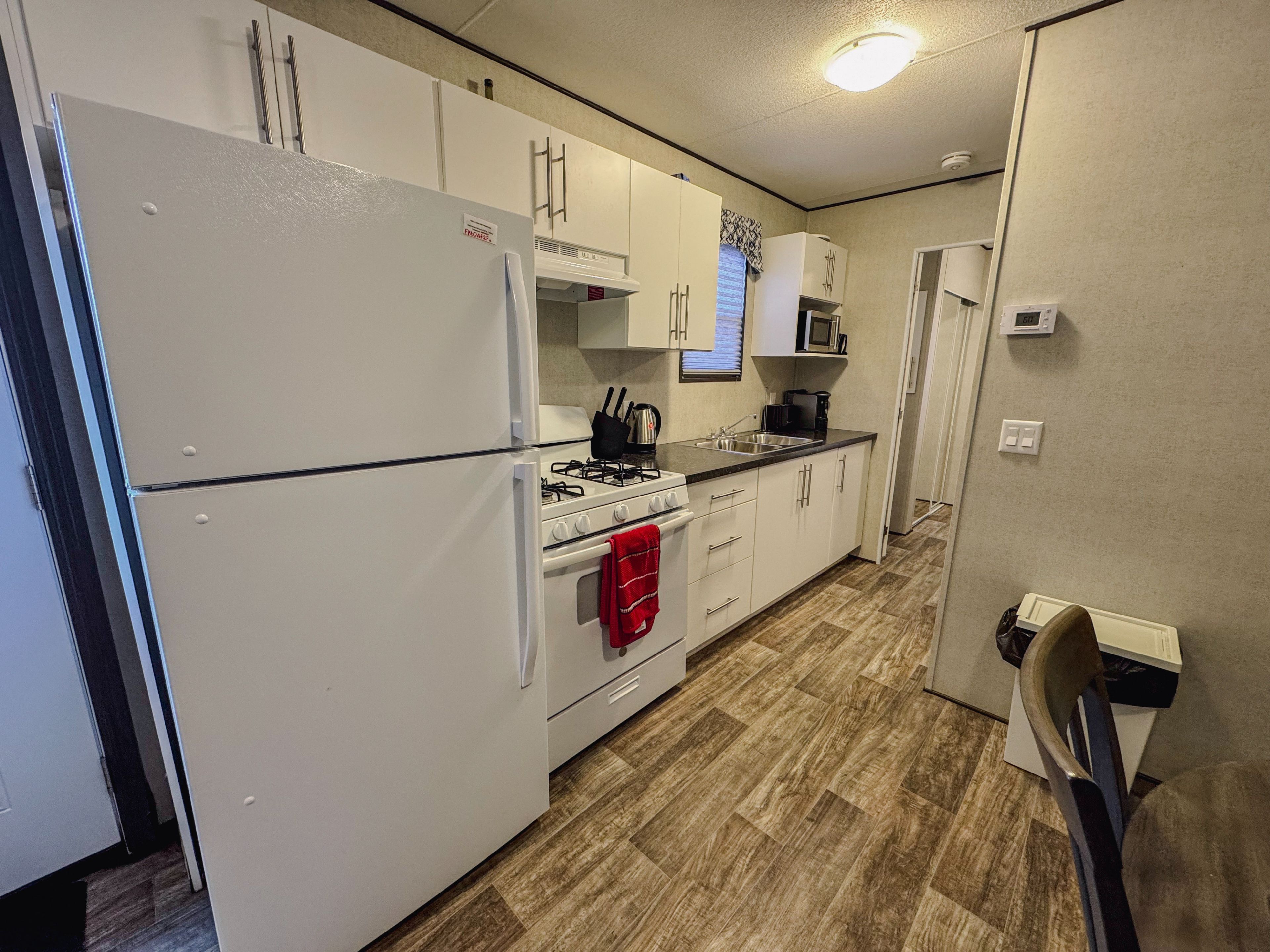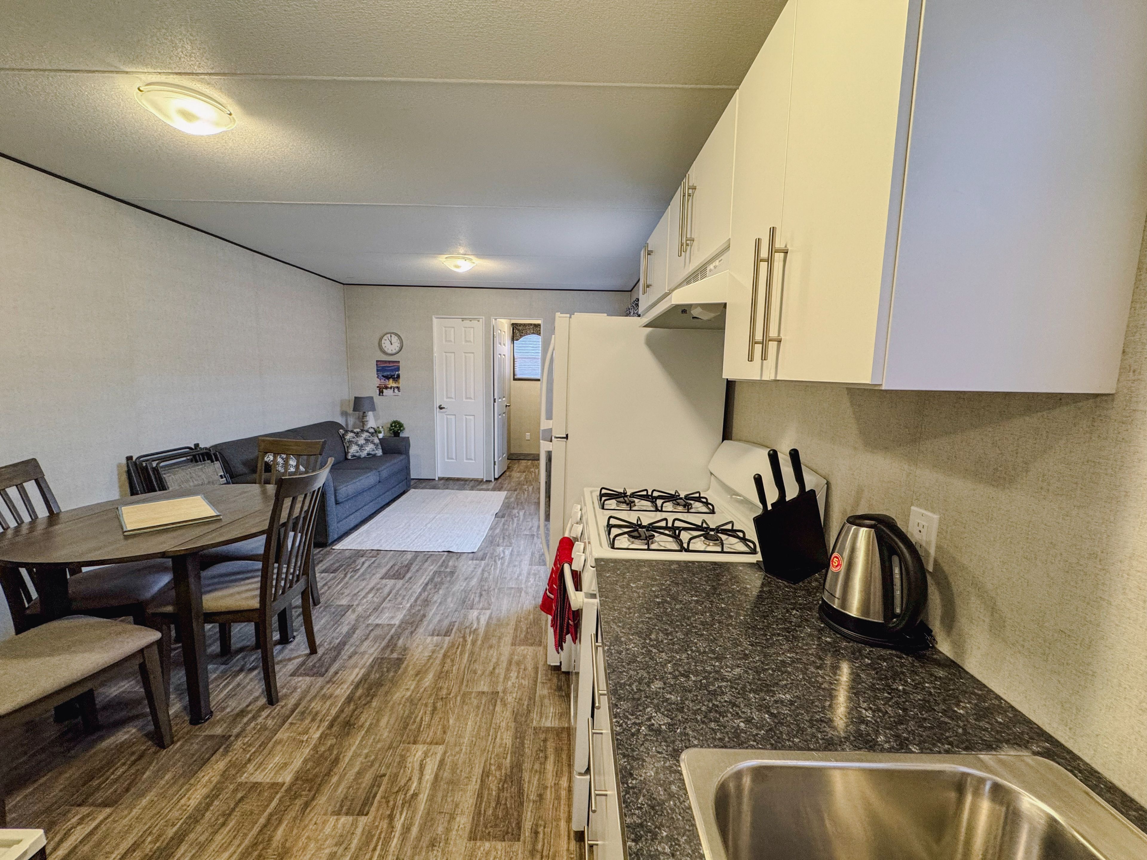 • Open-concept living space with full kitchen and propane stove for comfort.