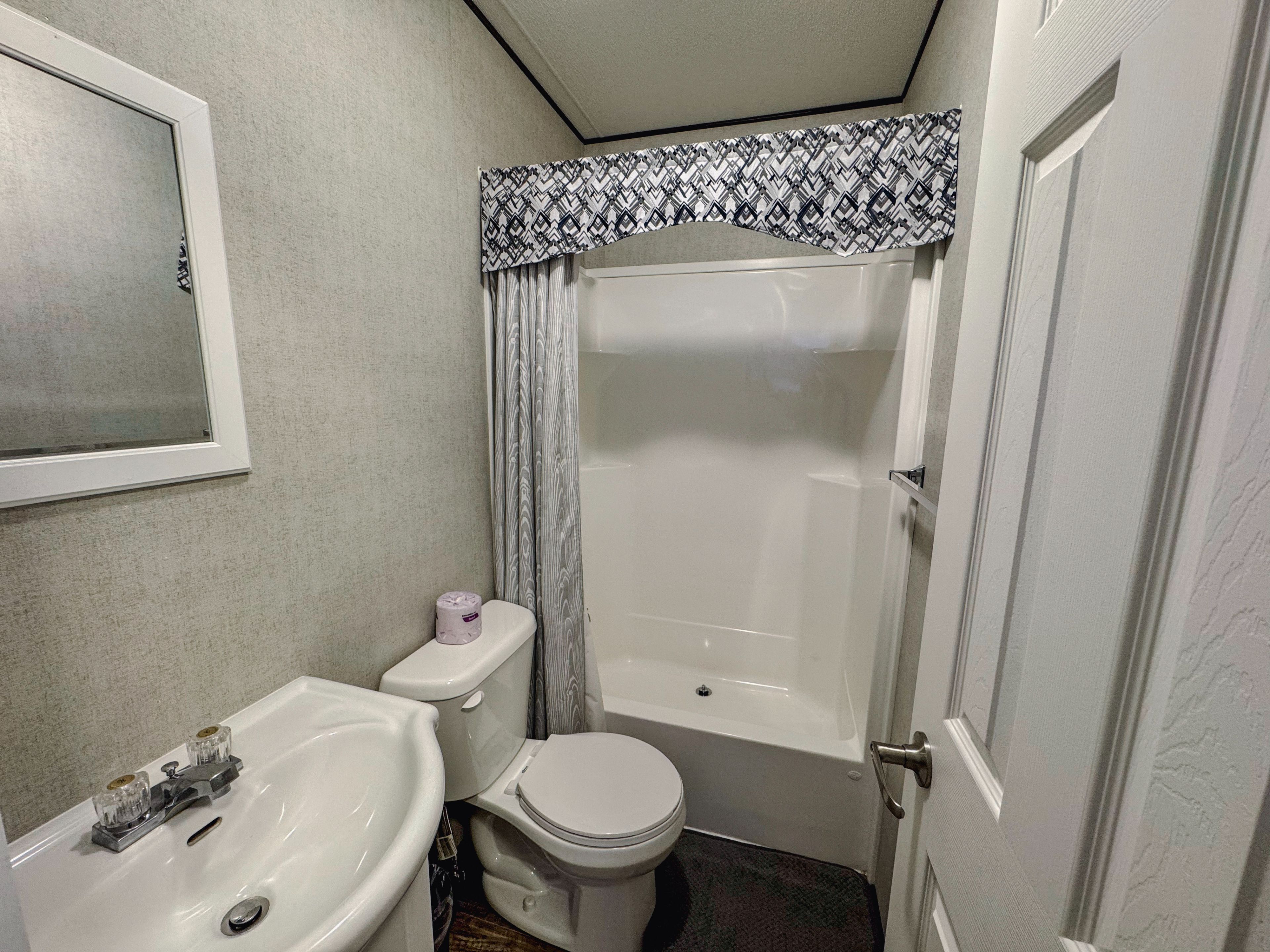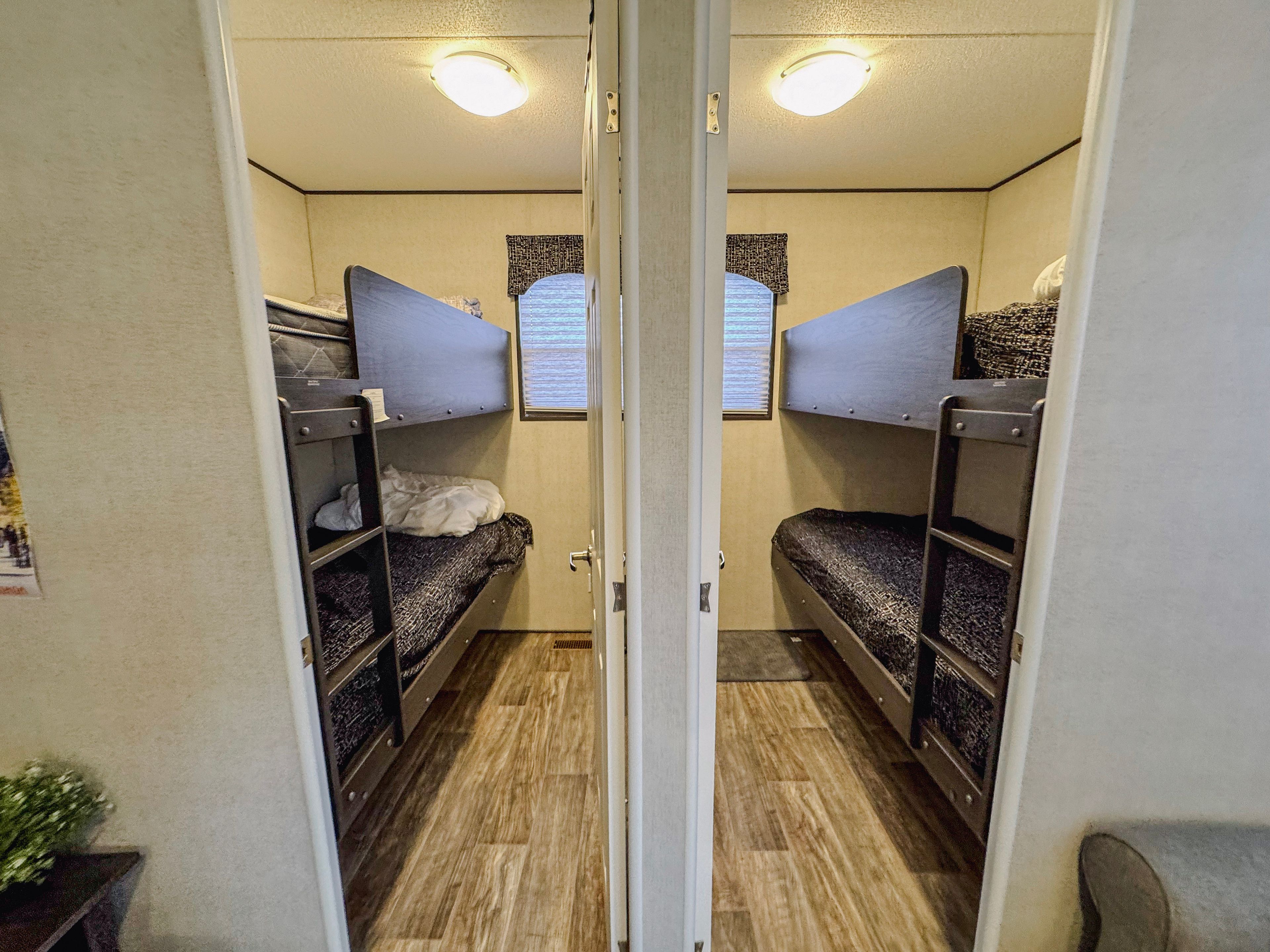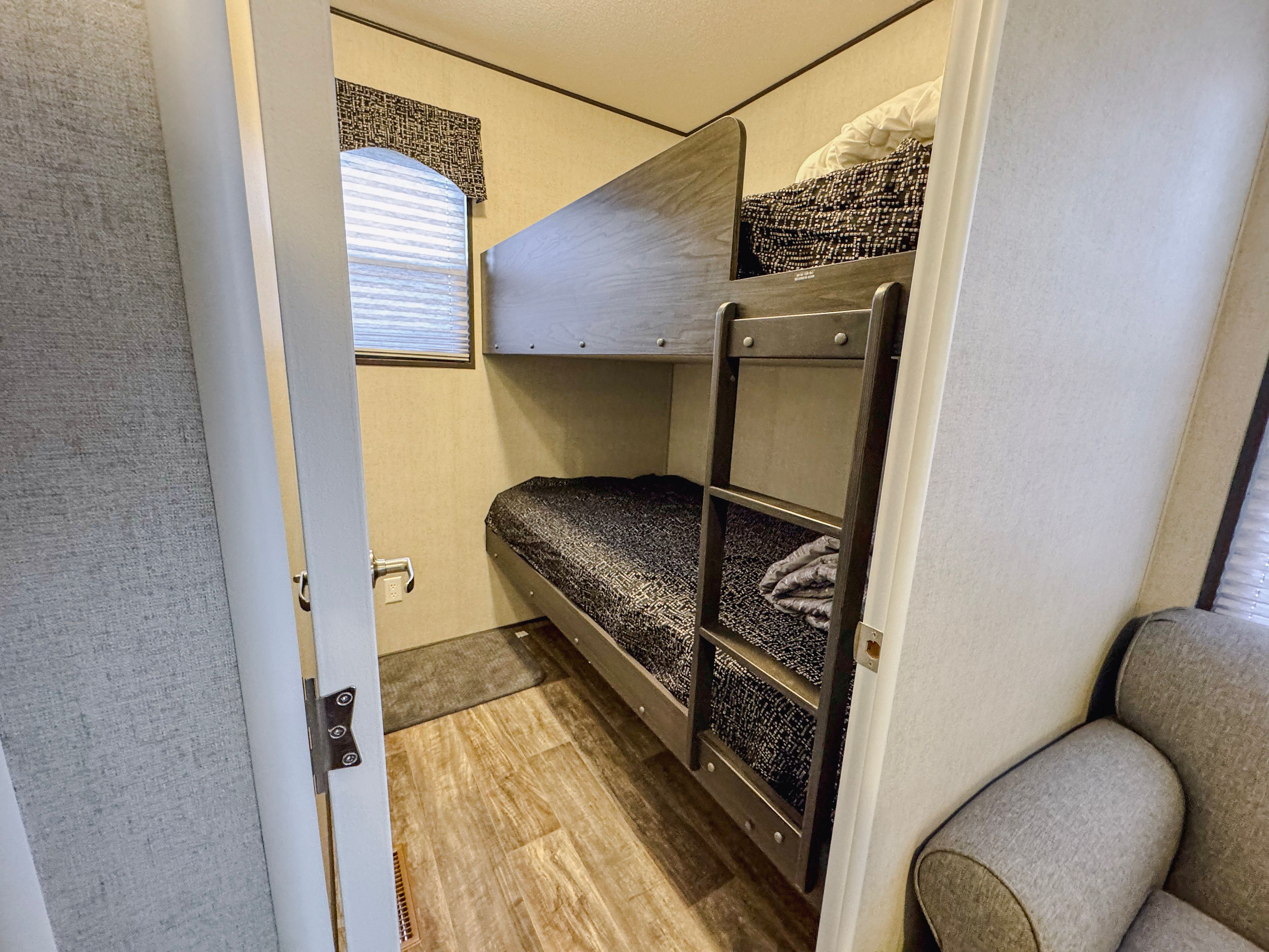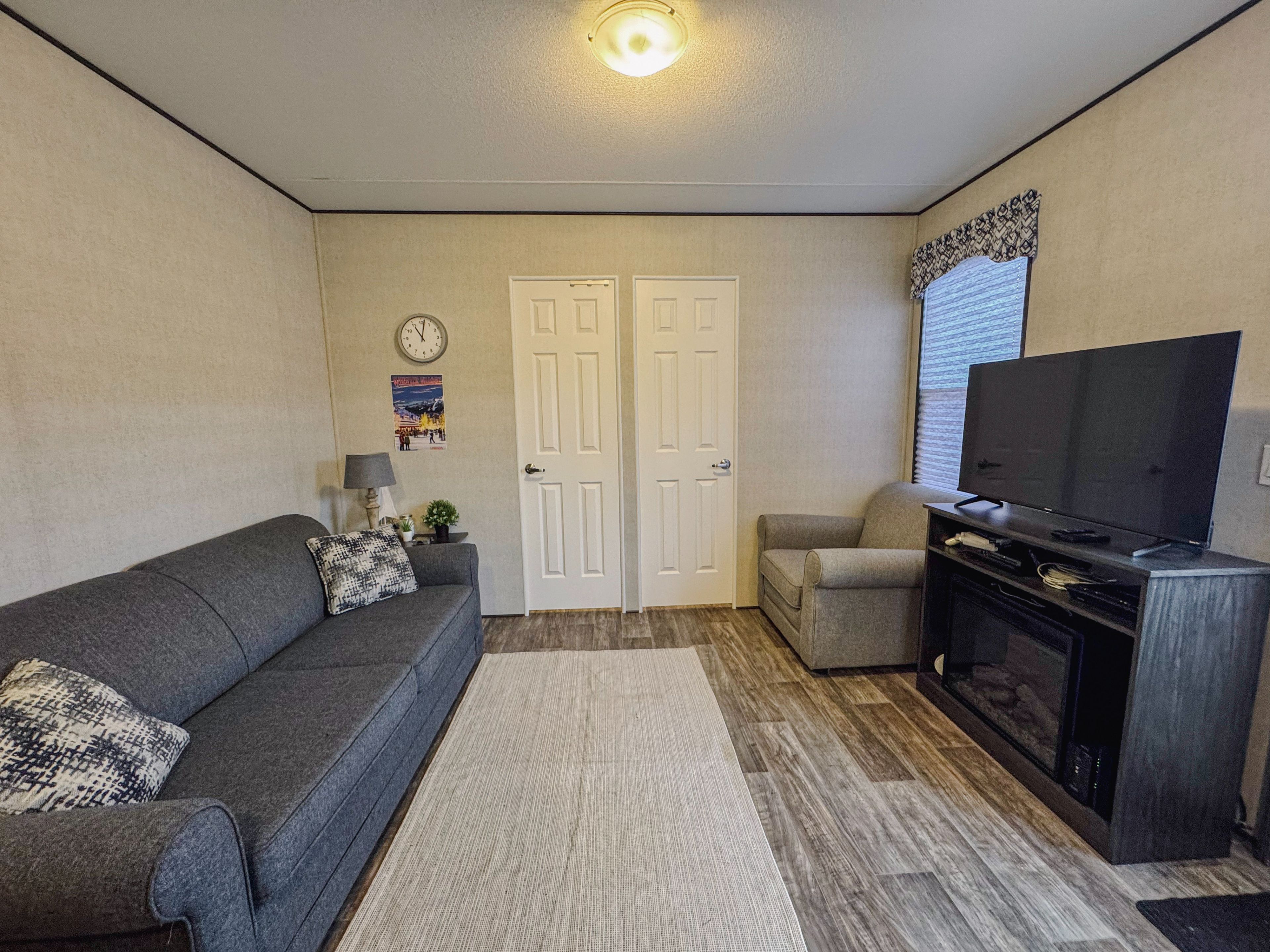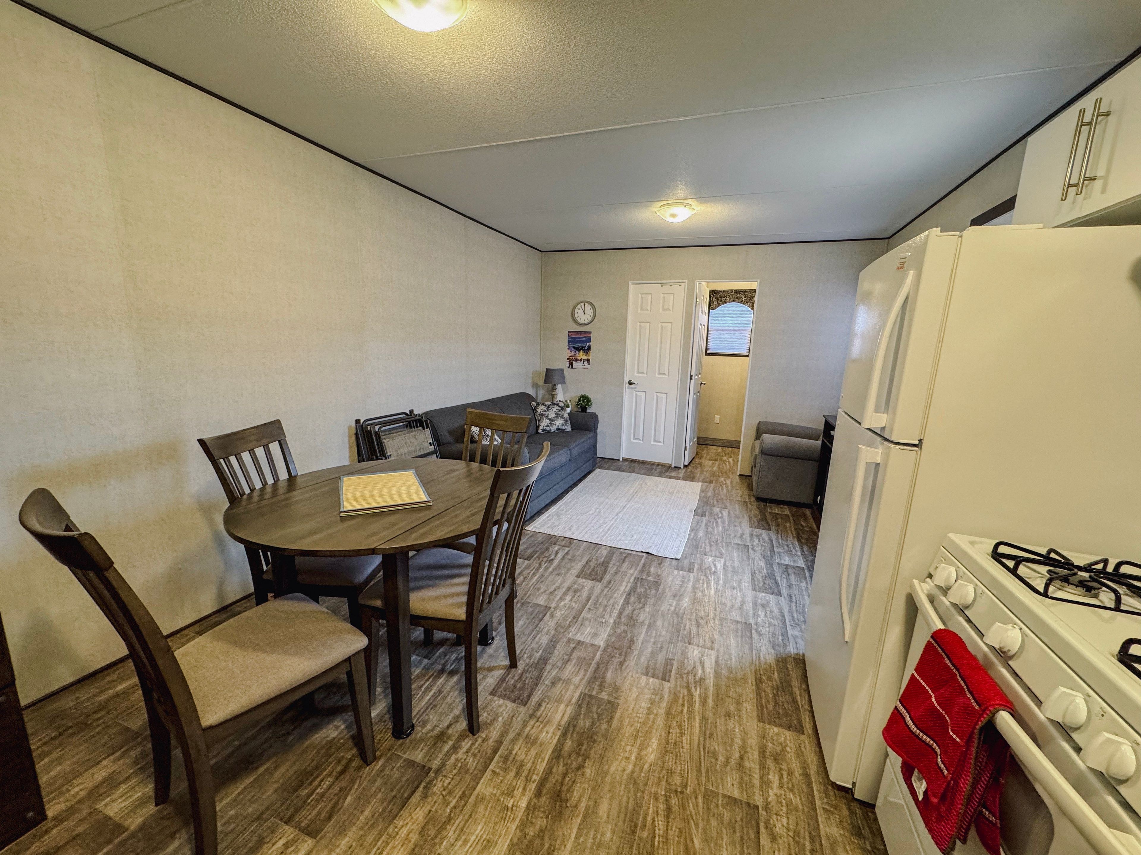 • Open-concept living space with full kitchen and propane stove for comfort.