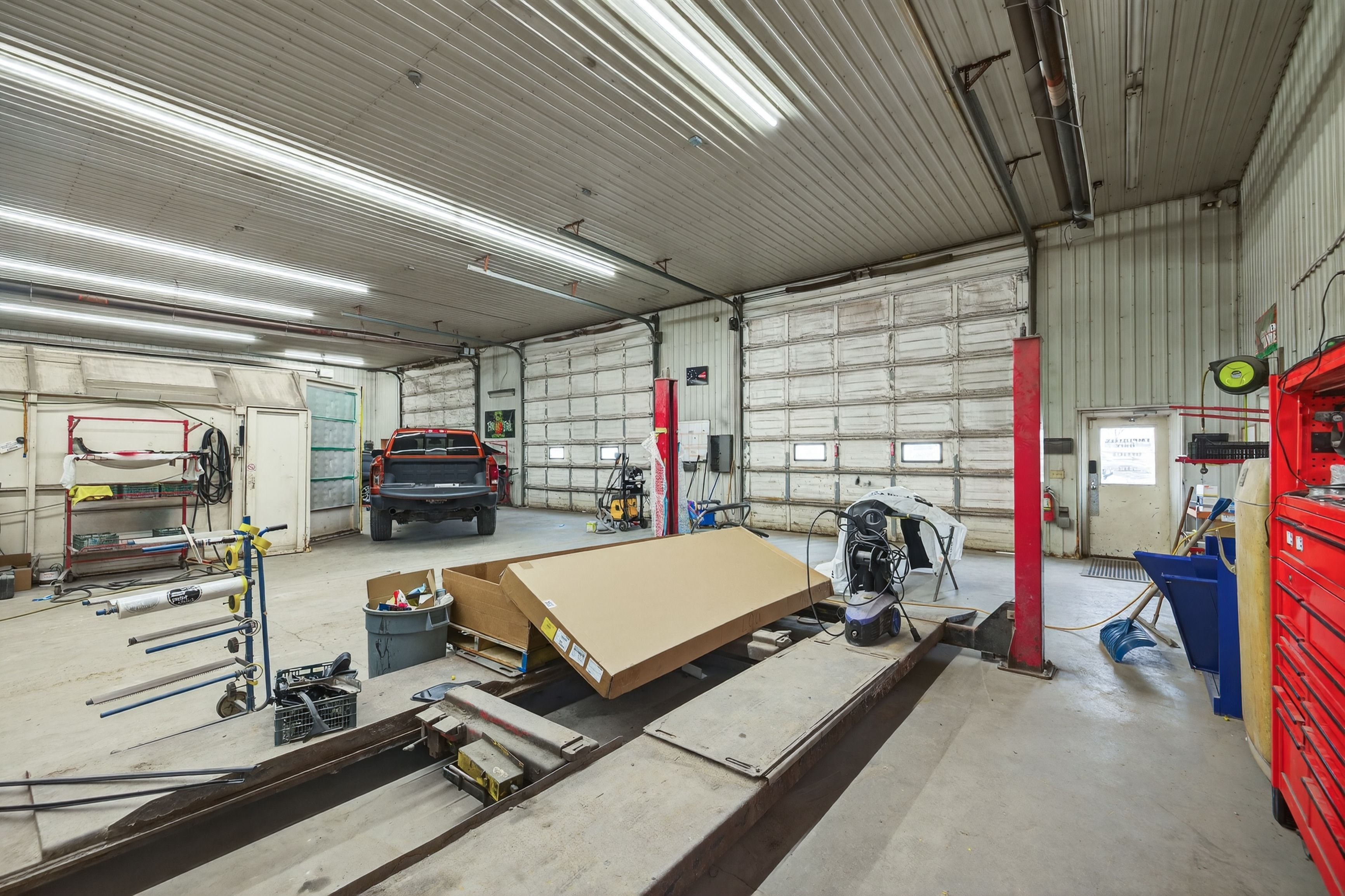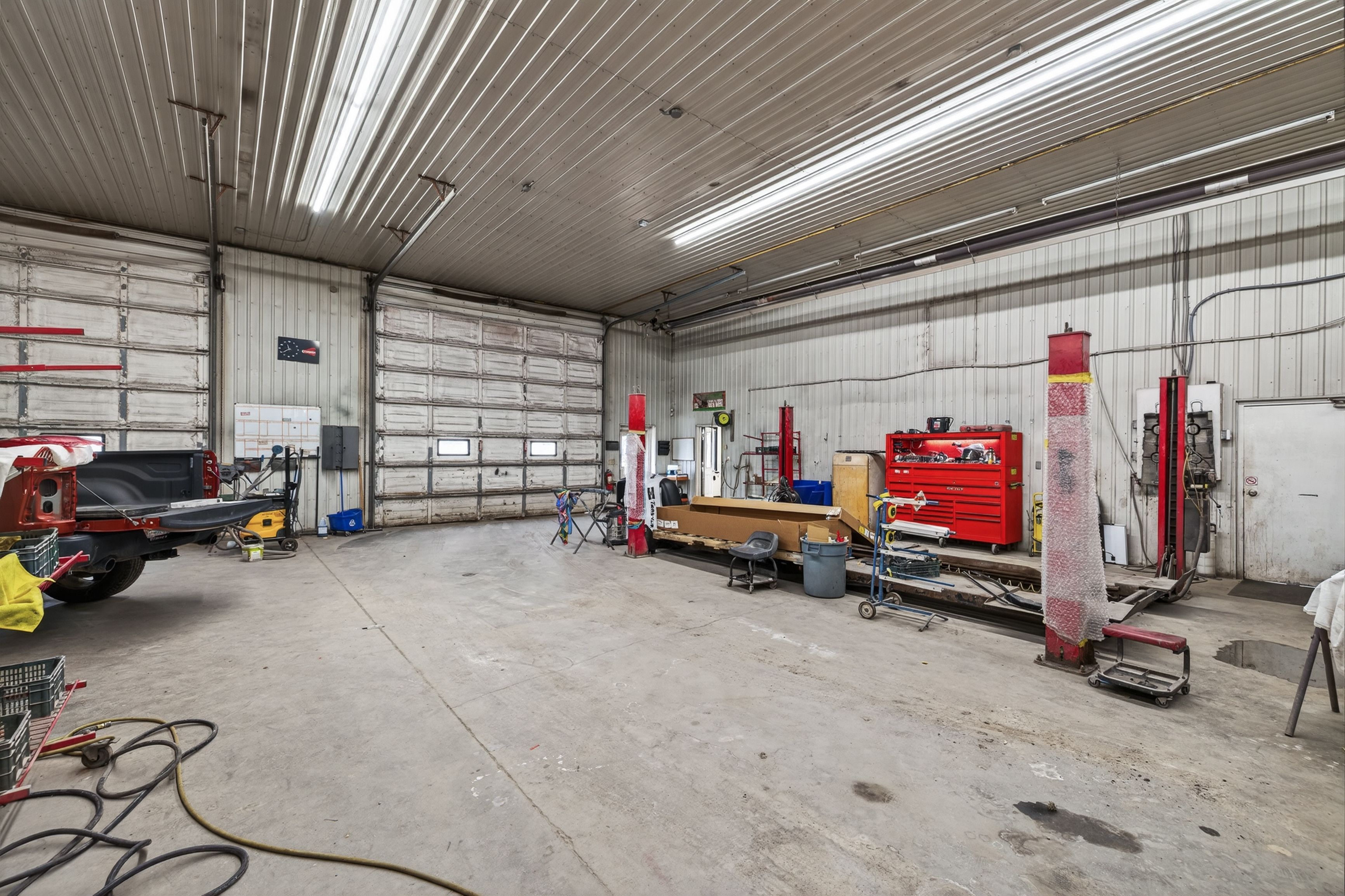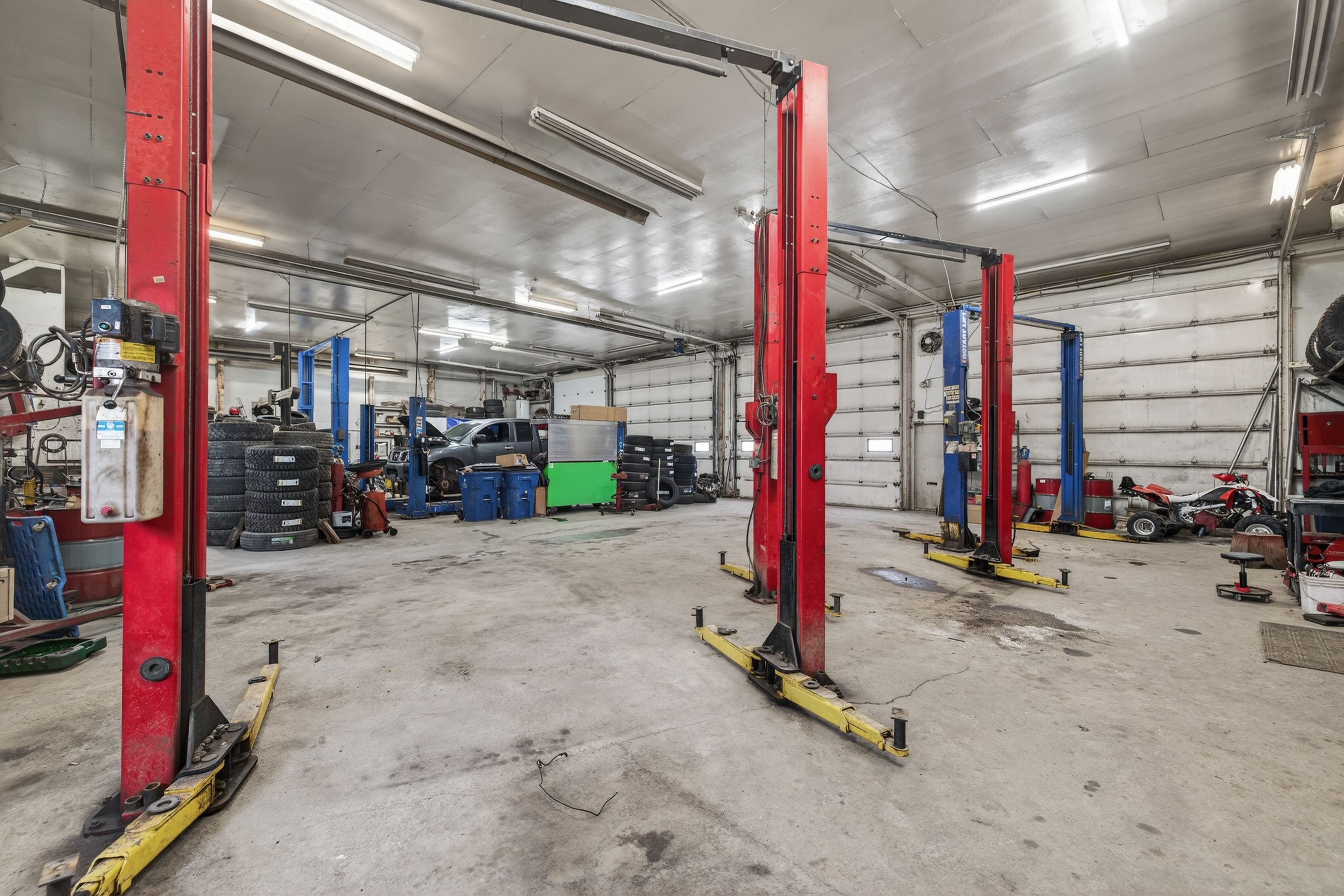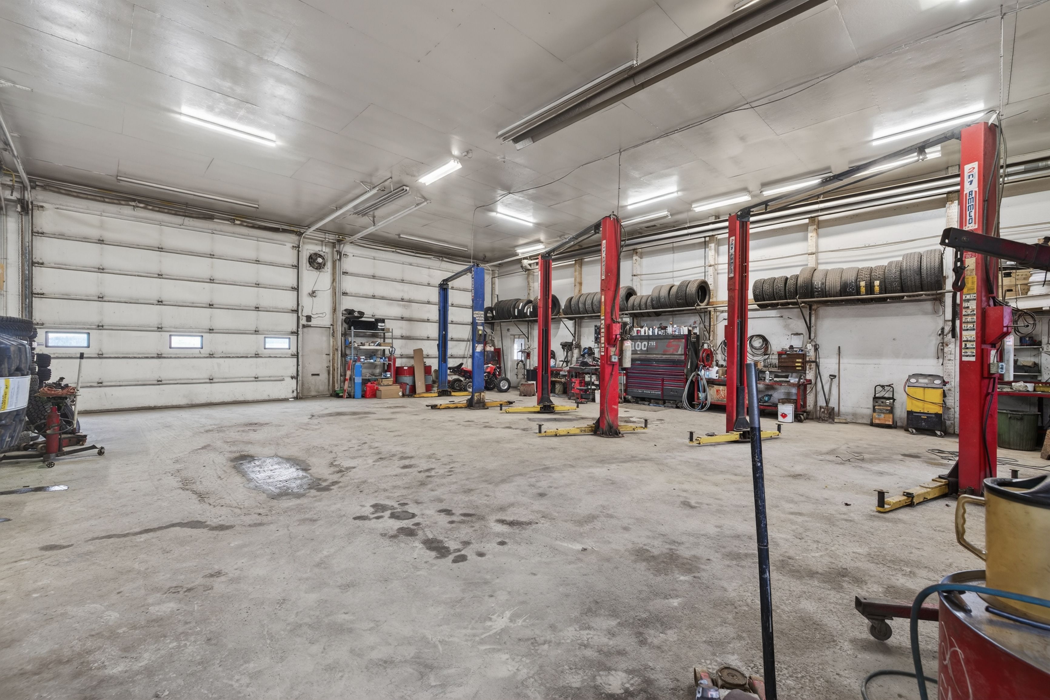• Large multi-bay building with multiple overhead doors and ample parking.