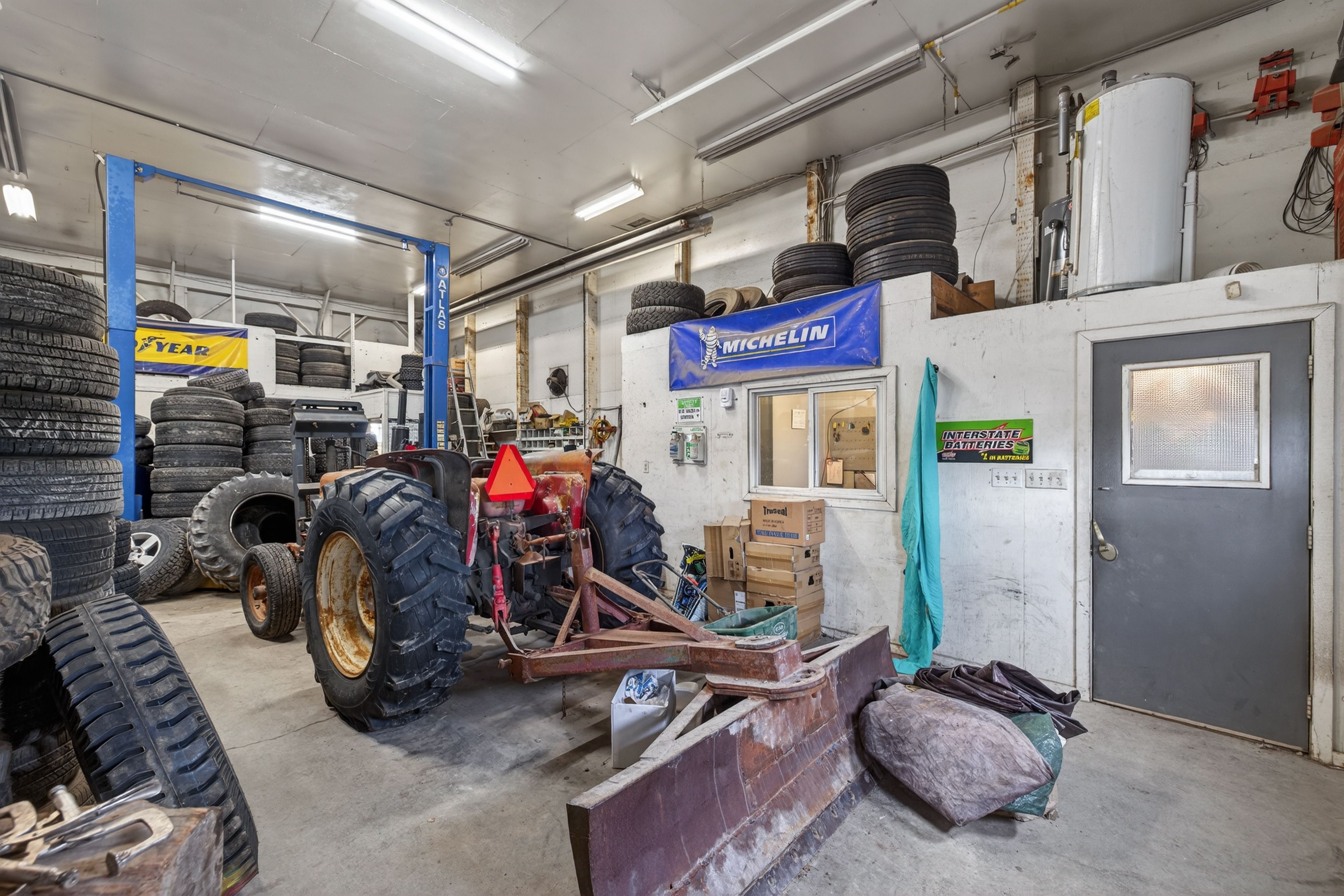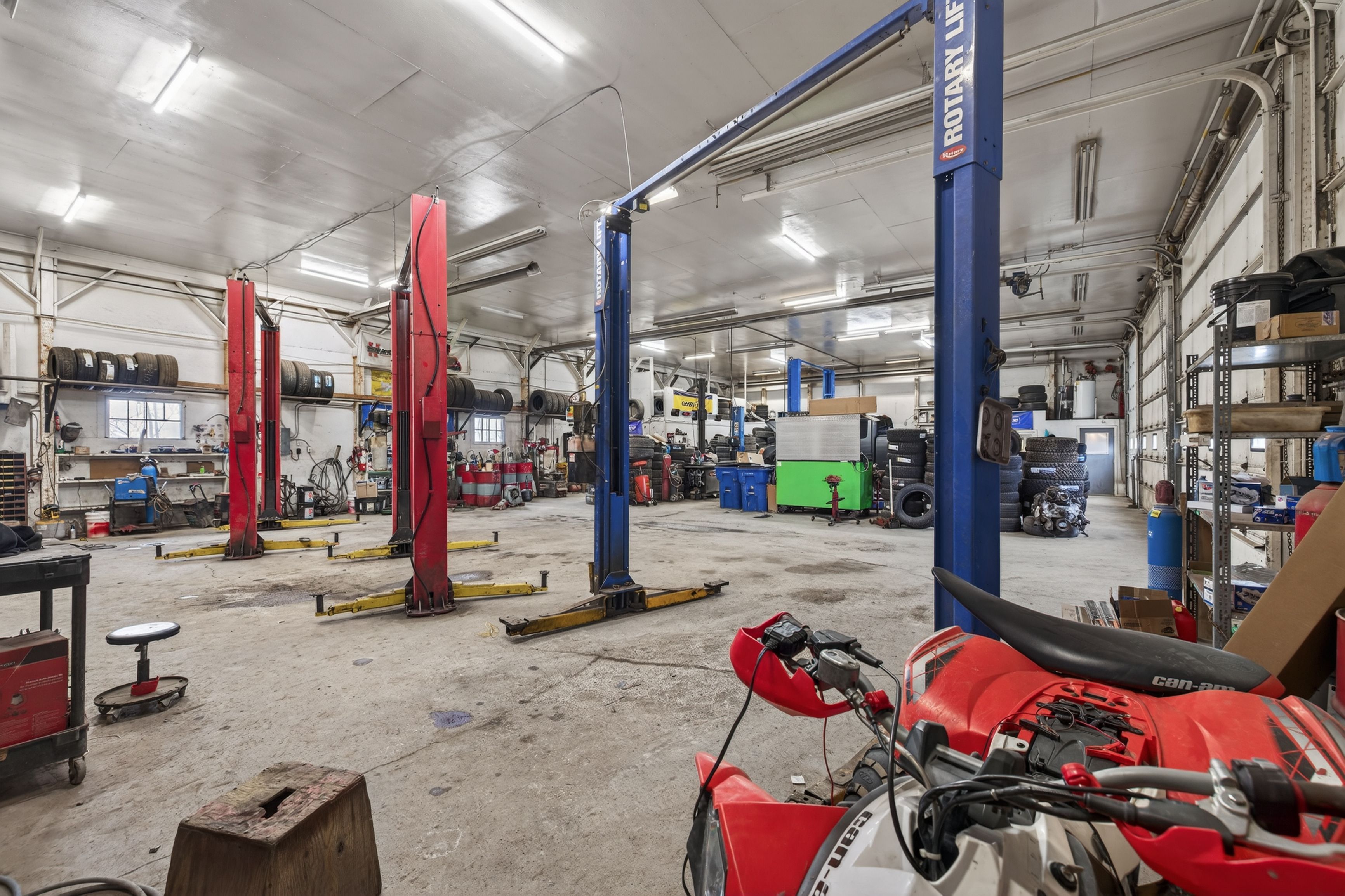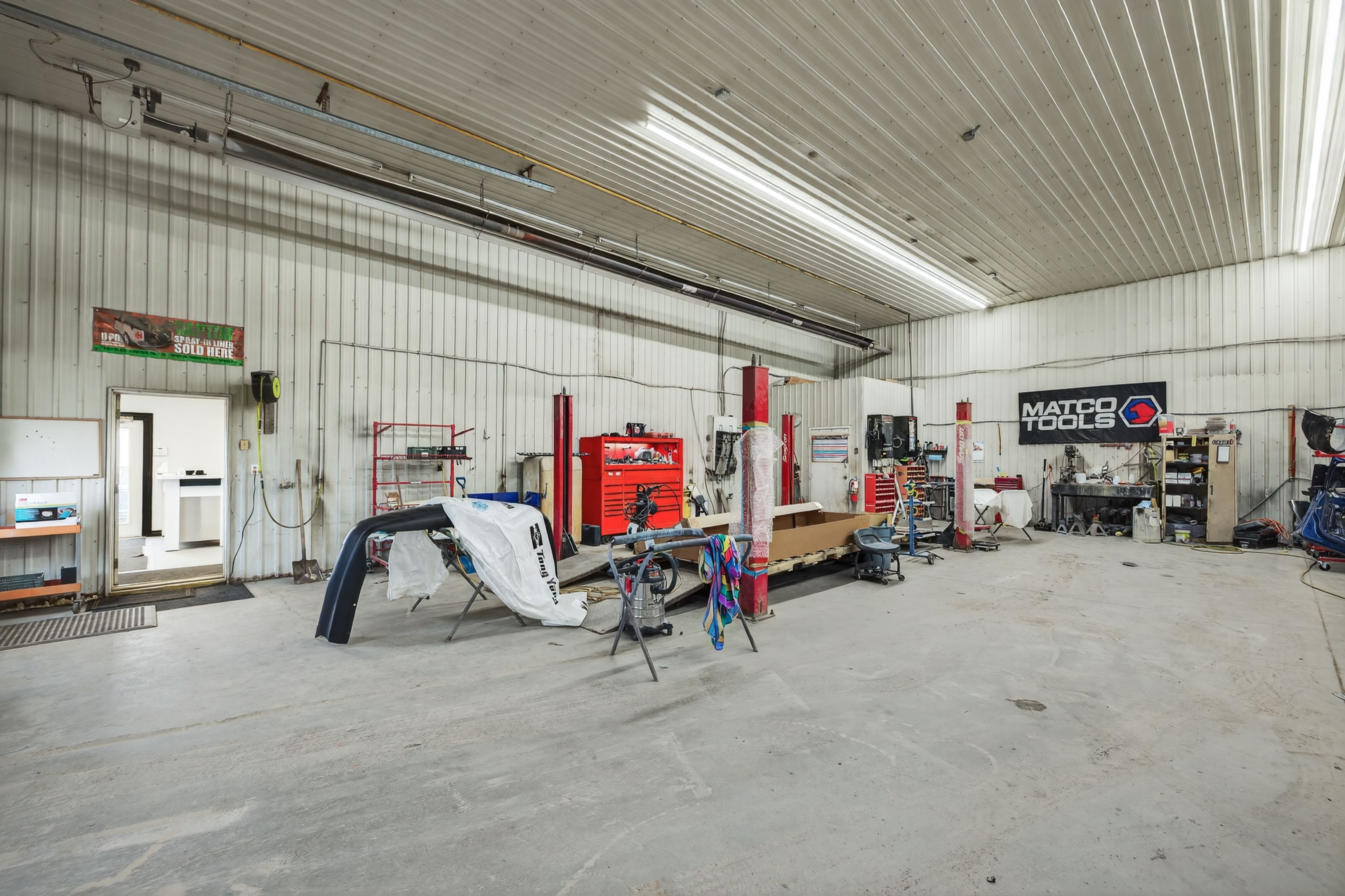 • Large multi-bay building with multiple overhead doors and ample parking.