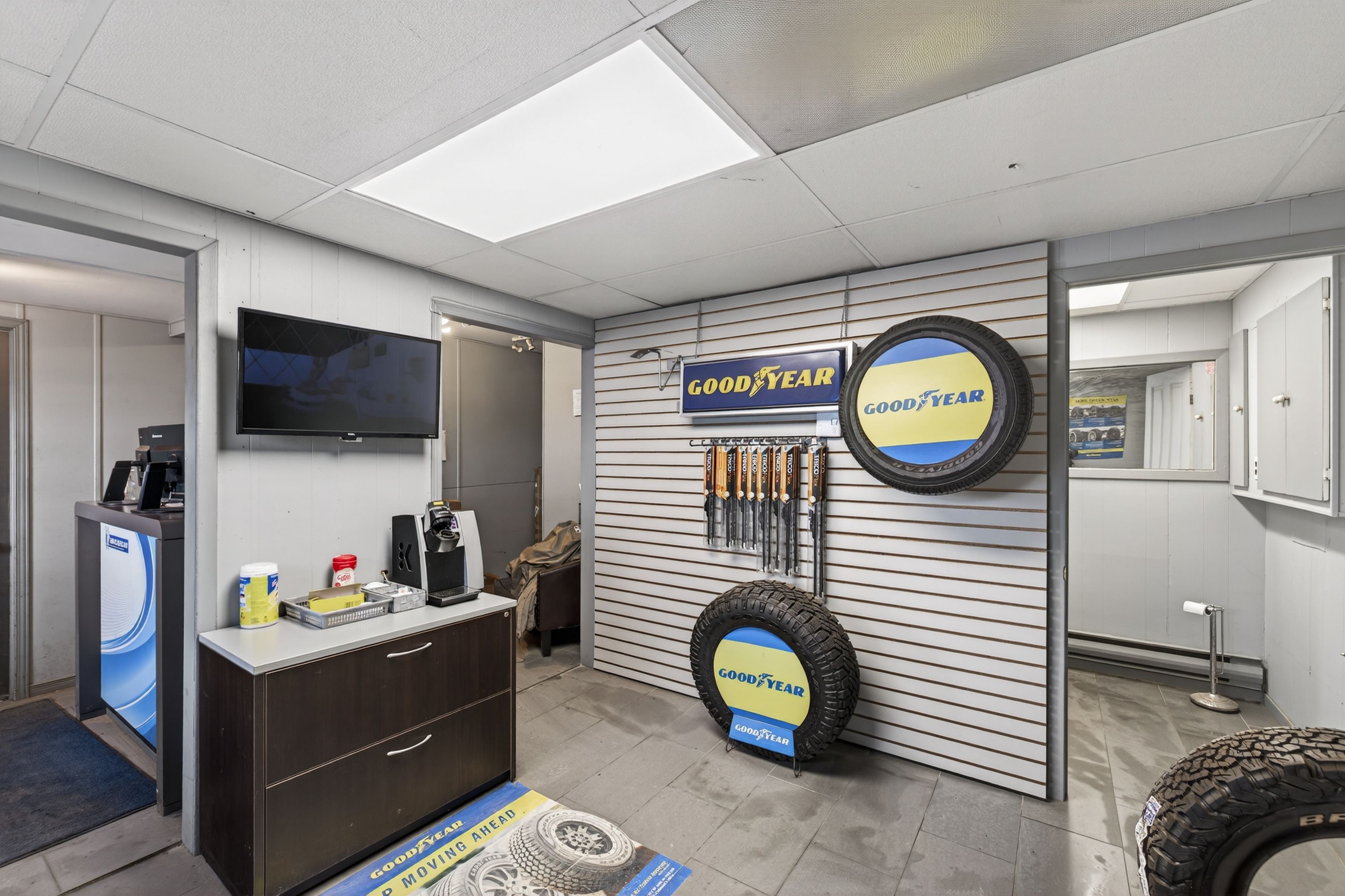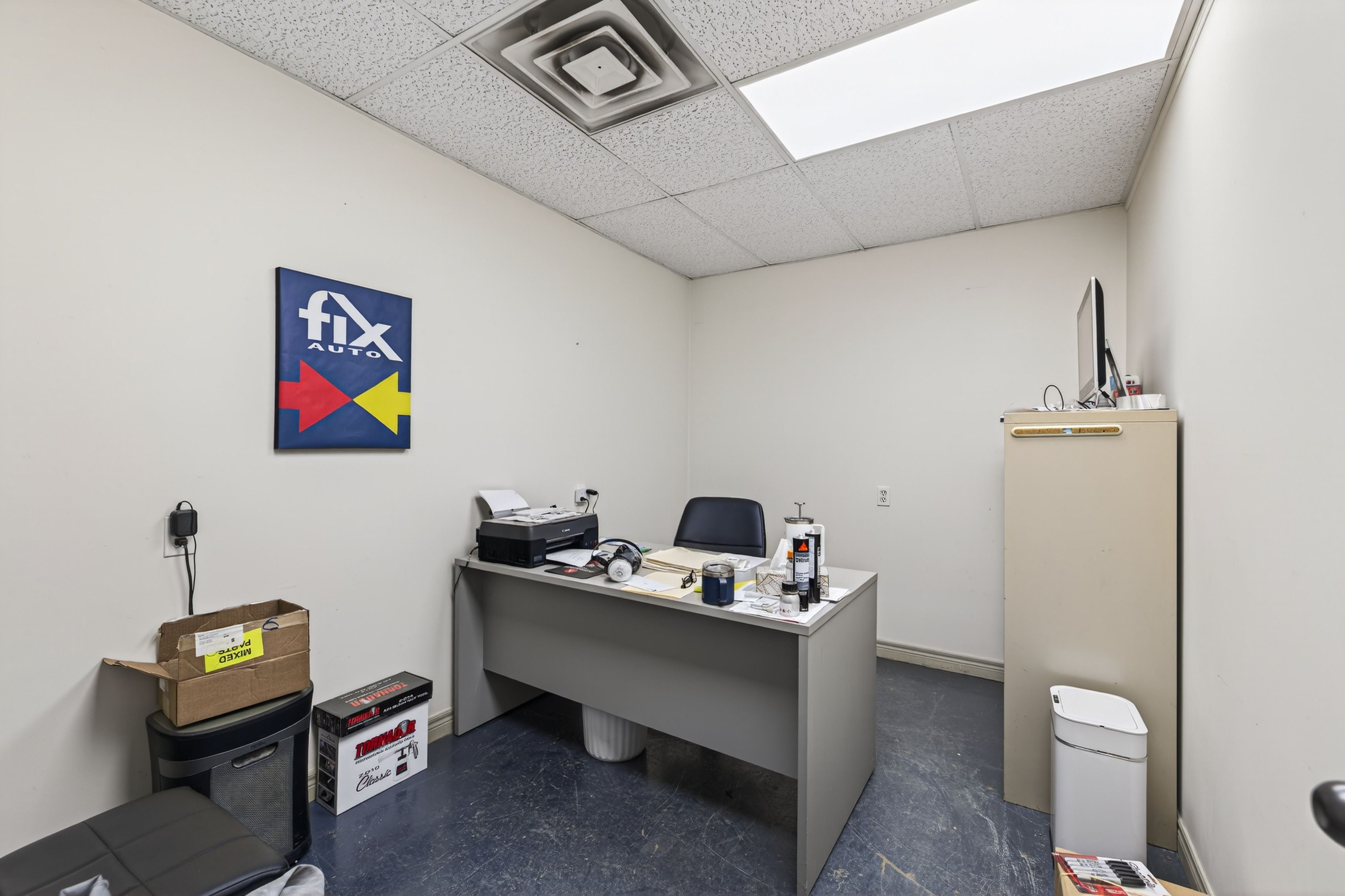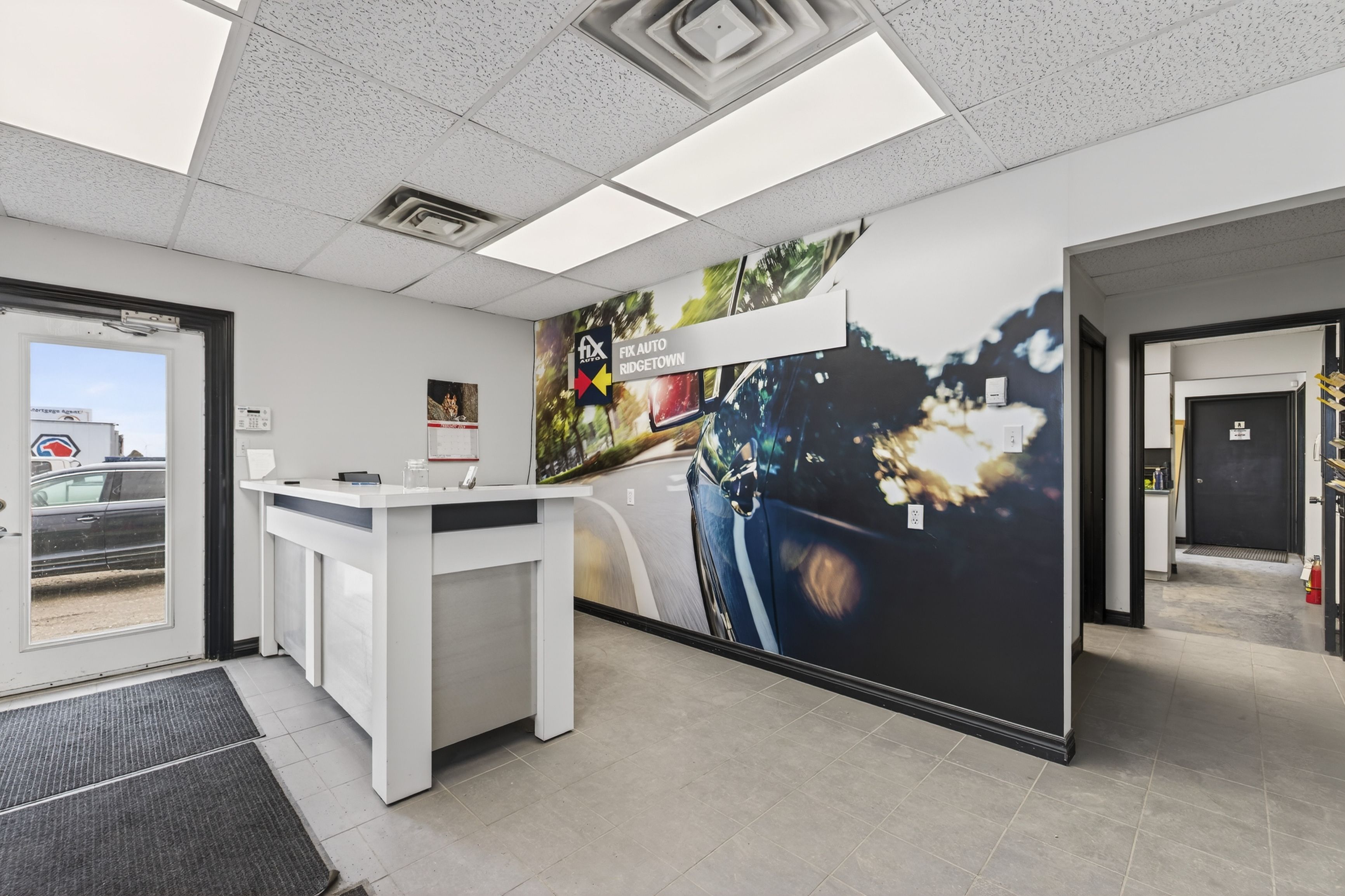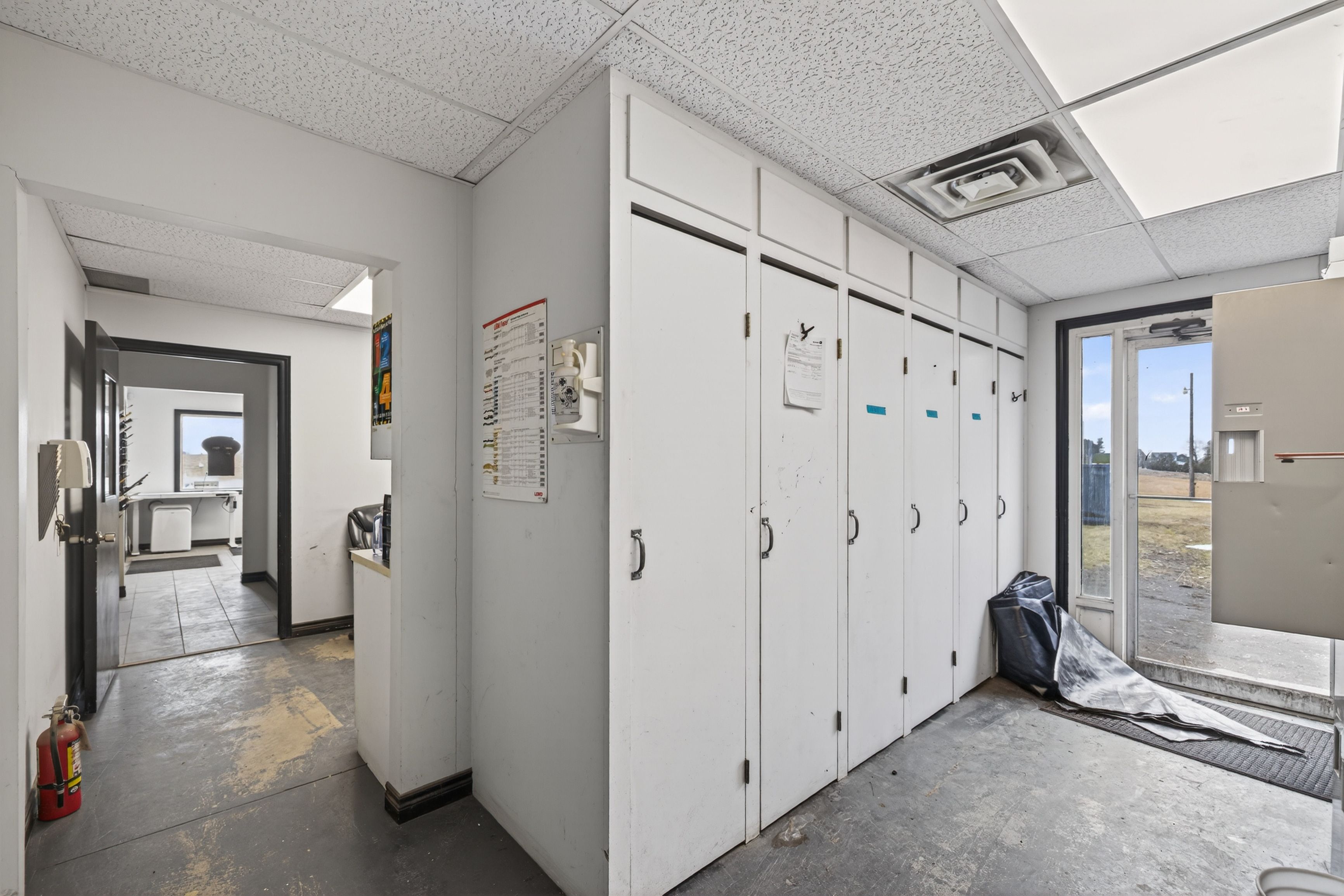 • Large multi-bay building with multiple overhead doors and ample parking.