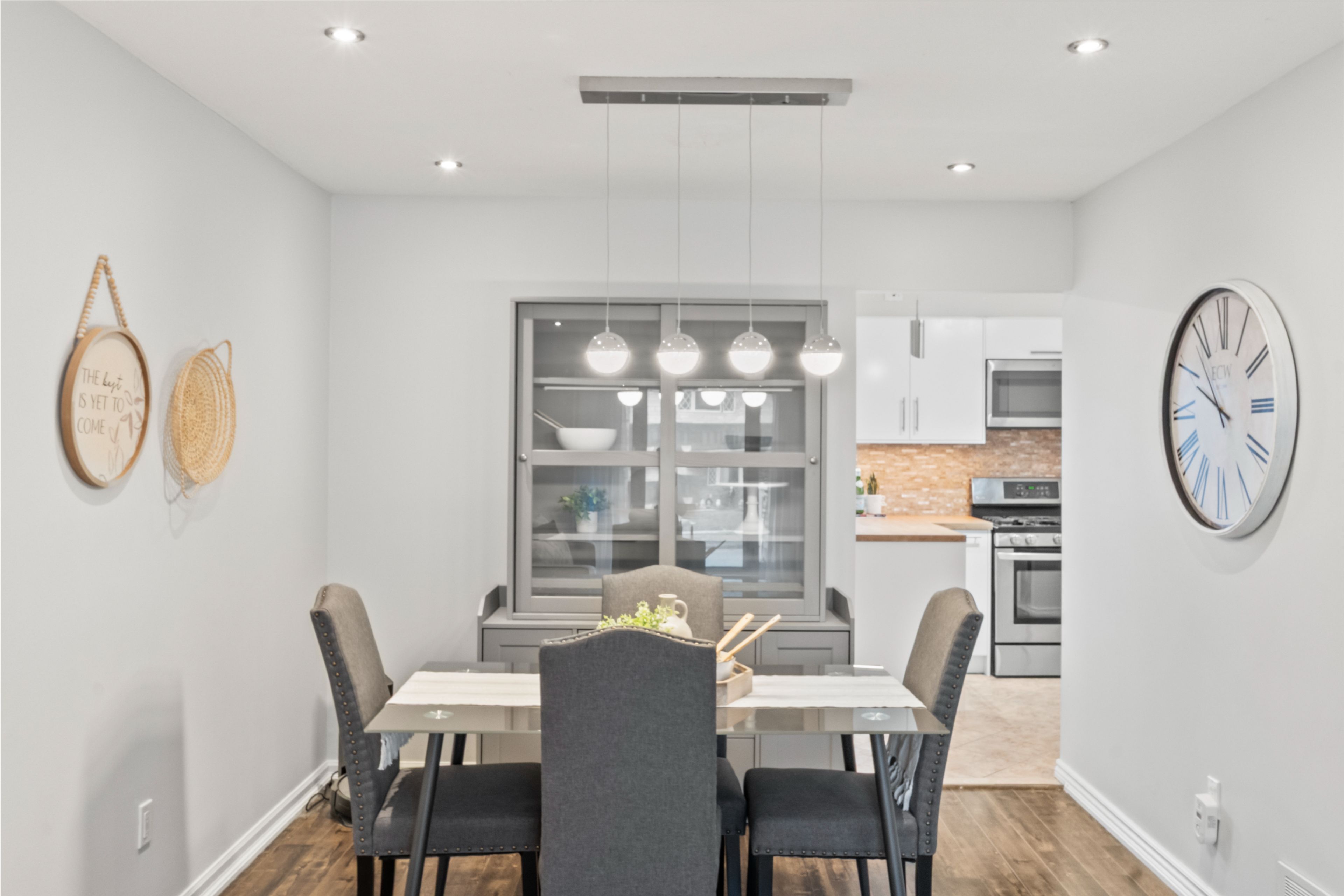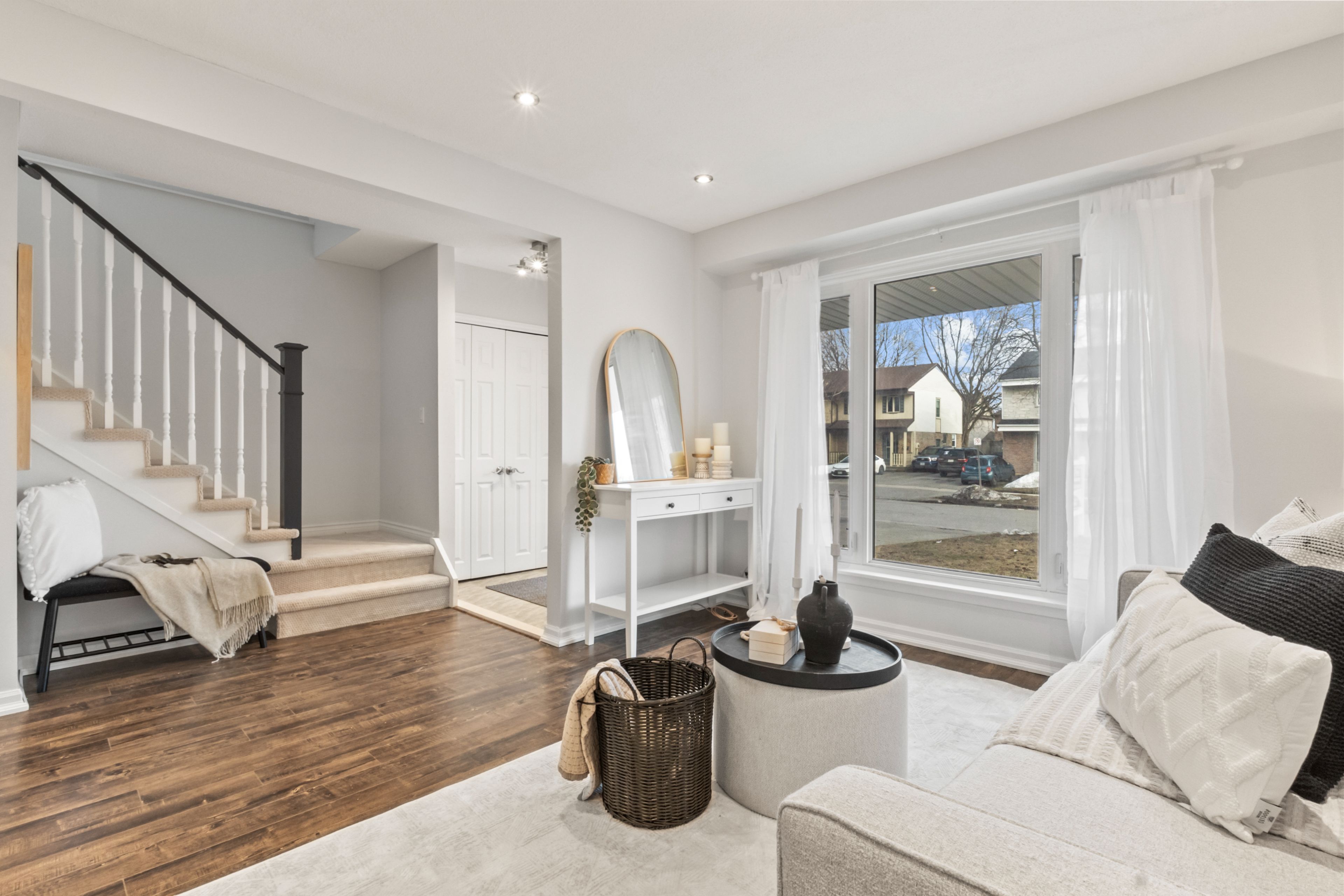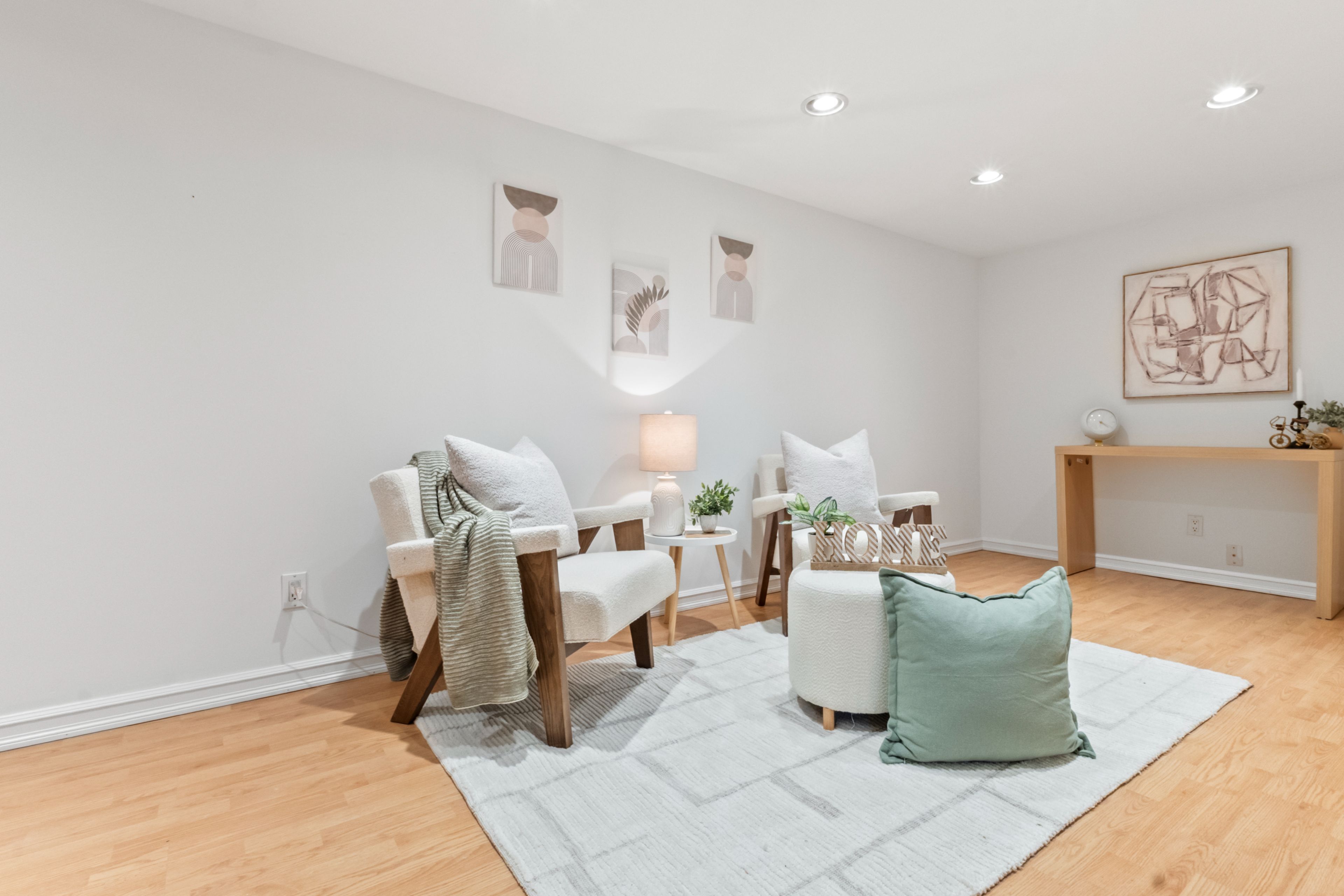 • Bright living and dining area with pot lights for a modern feel.