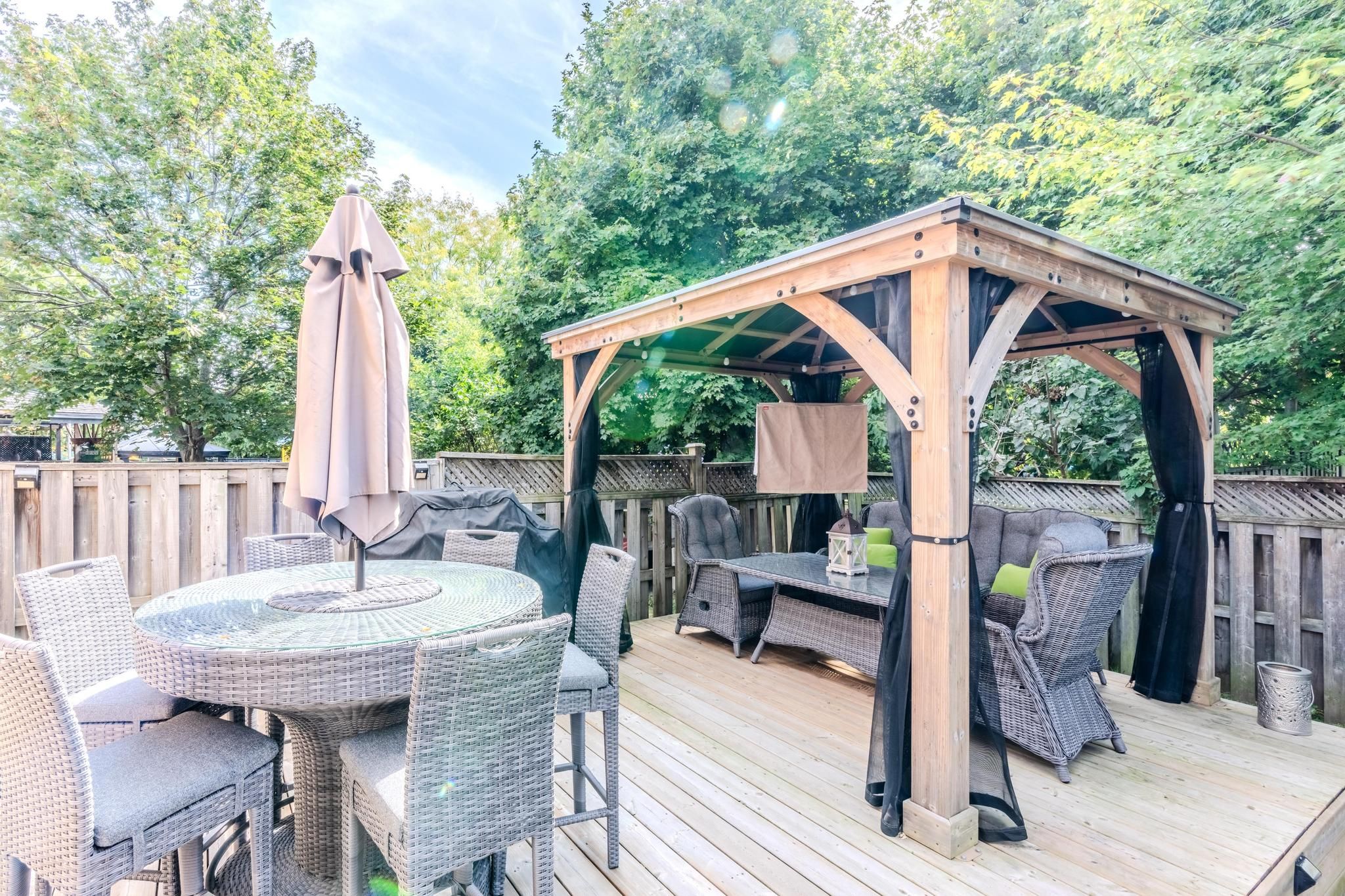 • Renovated eat-in kitchen leading to a spacious deck with gazebo.