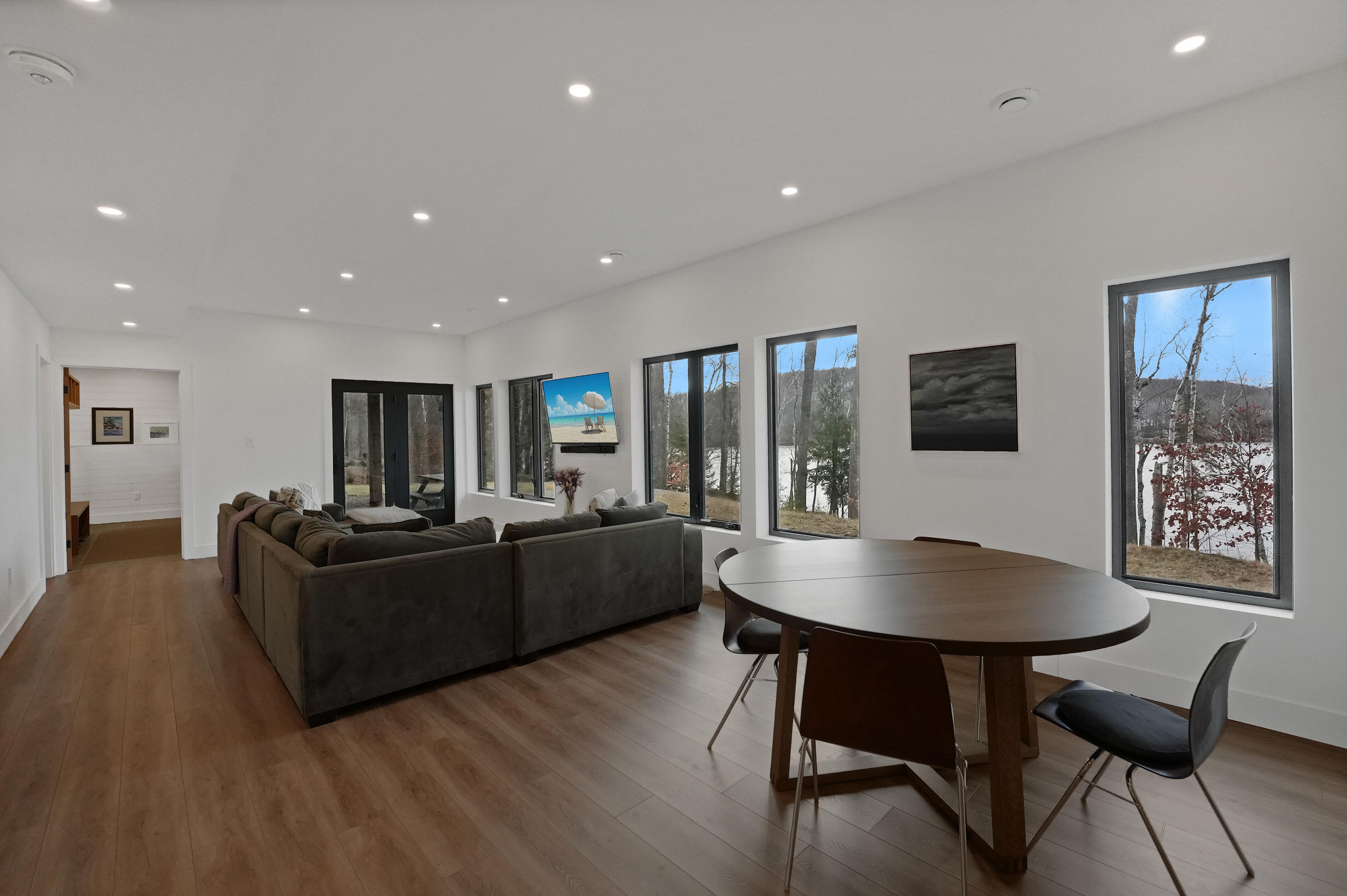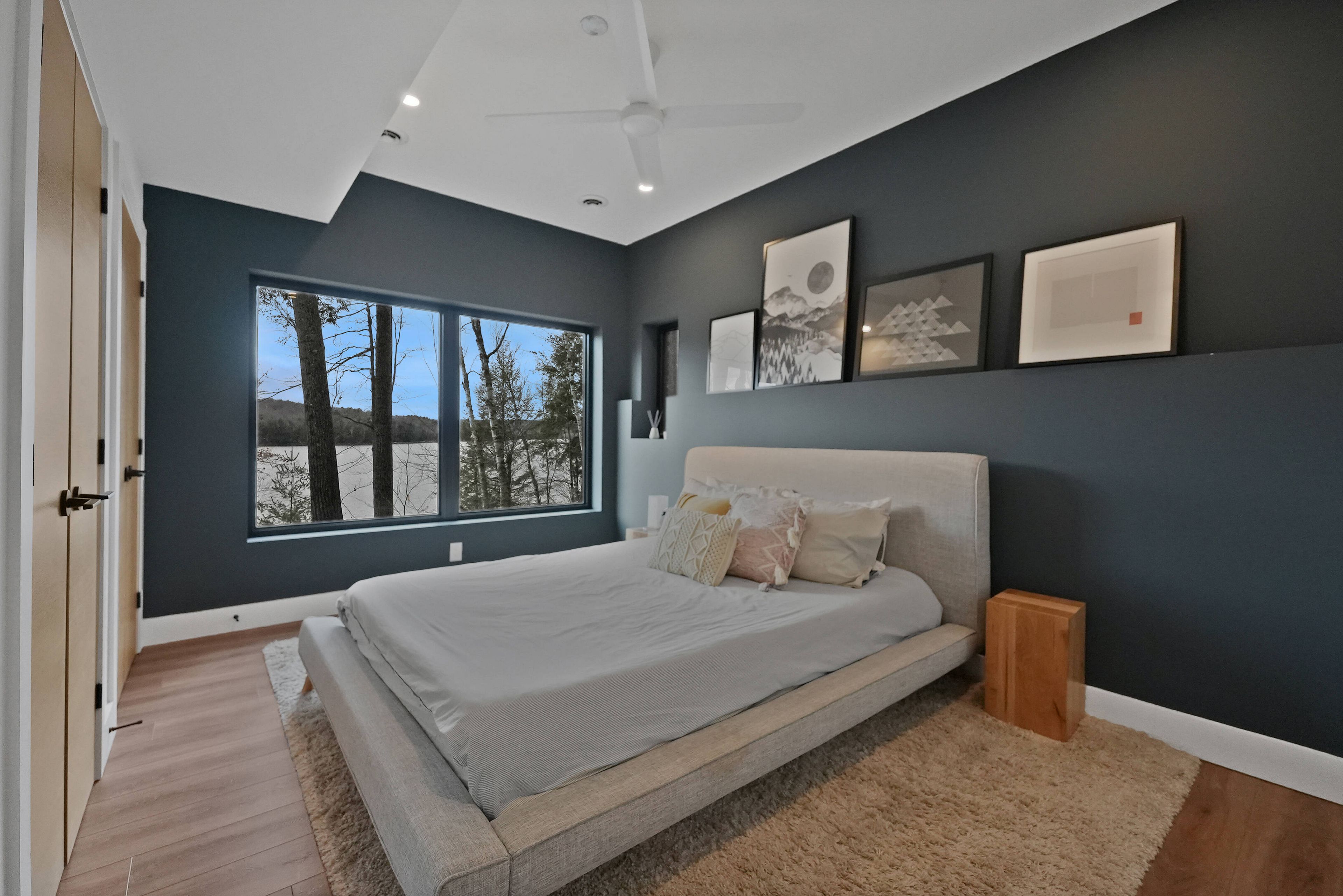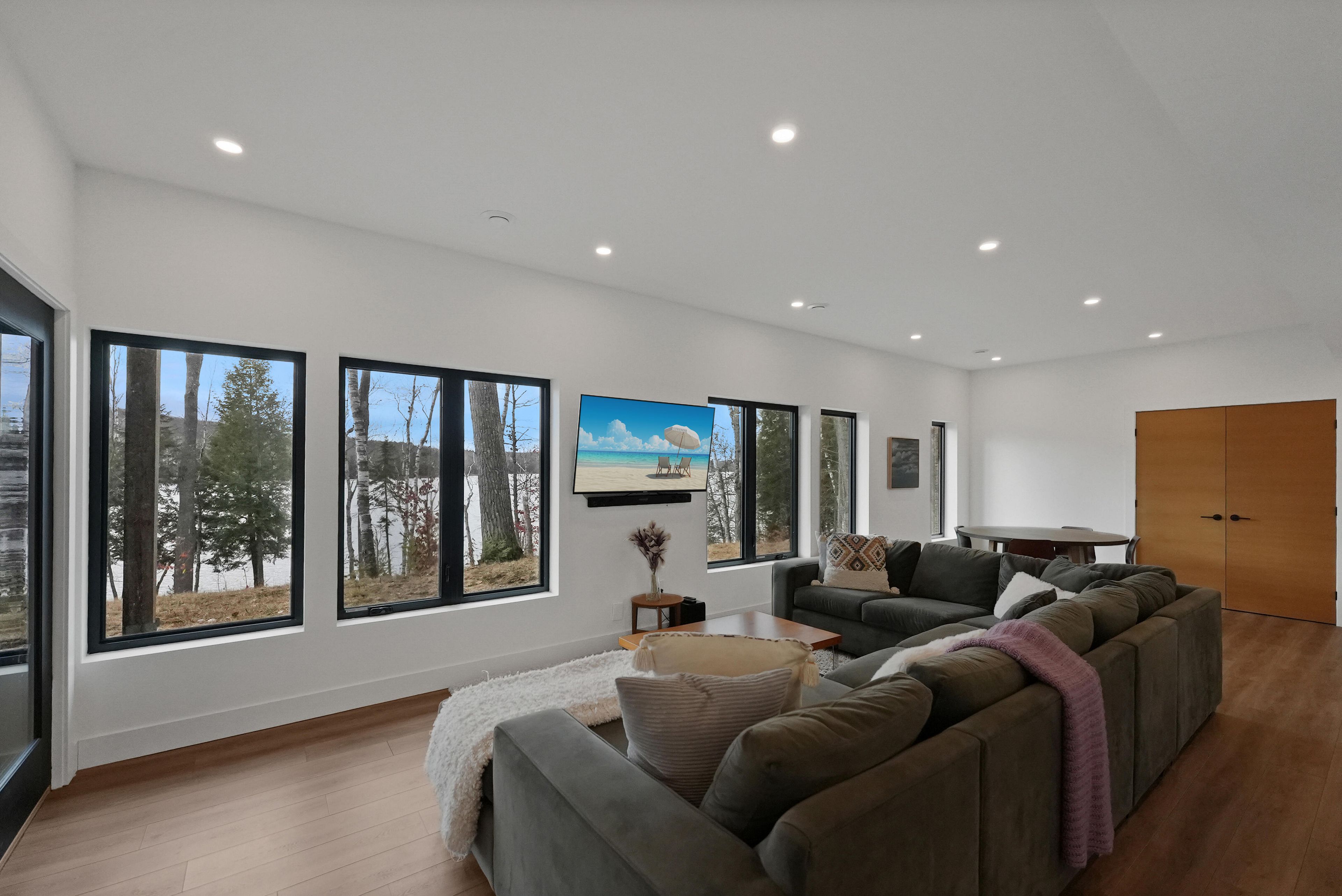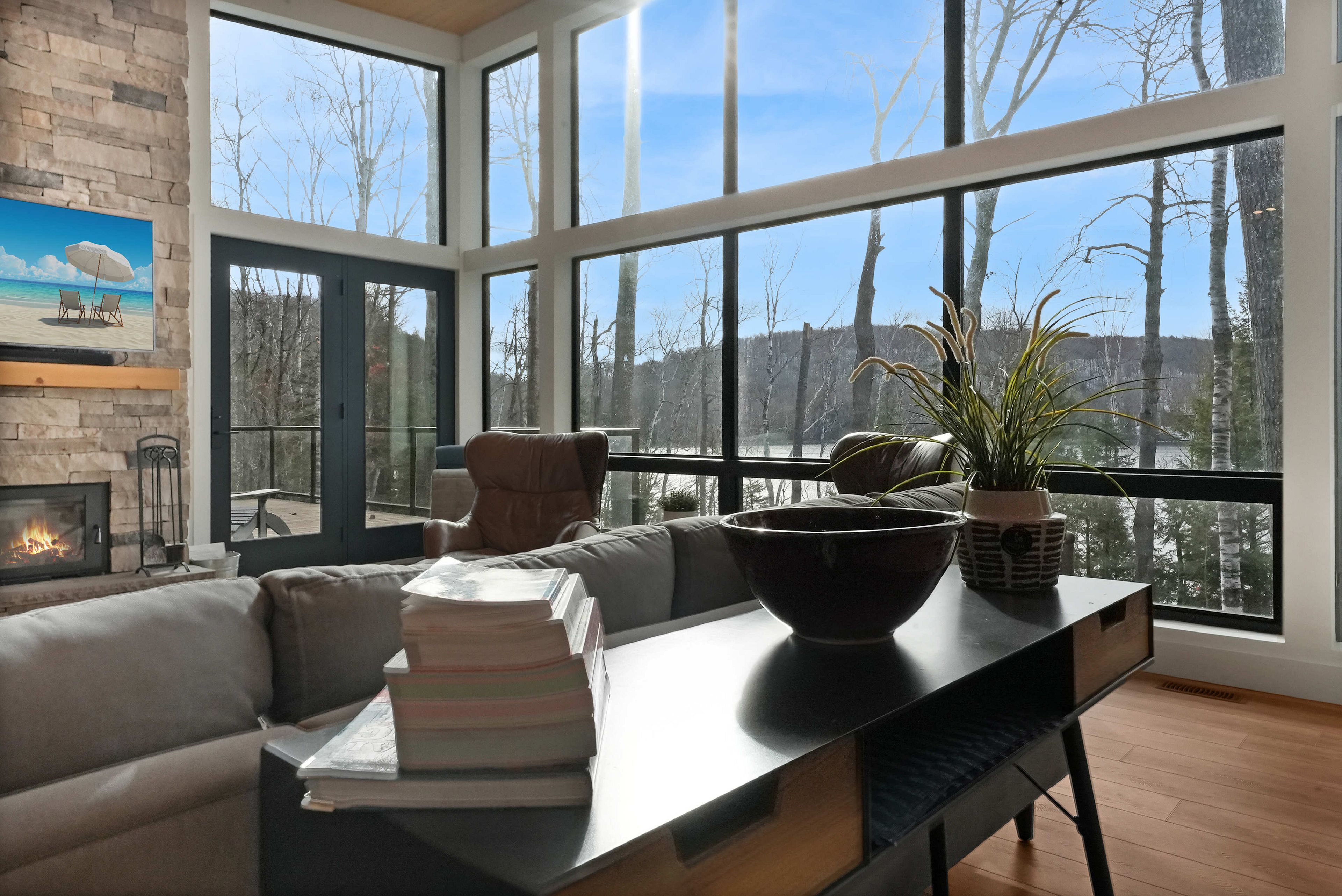 Discover luxury and meticulous craftsmanship in this spacious turn-key 5 bedroom, 3 bathroom home located on nearly 10 acres of haliburton lake waterfront. The heart of the main living area features a stunning wood-burning fireplace that creates an inviting focal point, perfect for cozy evenings after a day on the lake. The expansive windows flood the space with natural light and frames those spectacular western sunset views, while the open concept layout flows seamlessly for both intimate family gatherings and larger entertaining. A generous screened-in room extends your living space outdoors, offering a bug-free retreat where you can enjoy morning coffee, al fresco dining, or simply relax with a book while listening to the gentle sounds of the lake. Premium vinyl plank flooring flows throughout the bedrooms and main living areas, while all 3 bathrooms feature heated floors that add a touch of everyday luxury. The exterior of this property is equally as impressive, featuring landscaped steps that gently guide you to the waterfront where an oversized dock sits on a pristine rocky shoreline. The clear, weed-free water provides ideals swimming with big lake views. A fire pit creates the perfect gathering spot for family evenings. Engineered for superior comfort and year-round efficiency, this residence showcases comprehensive spray foam insulation, an advanced membrane wrap system around the foundation for absolute waterproofing, and thoughtfully designed roof overhangs that maximize passive solar gains-welcoming winter warmth while providing summer shade. The fully insulated 1500 sq. Ft garage features over r15 under-slab insulation with r30 above grade walls and radiant electric floor heating, creating a comfortable workspace or storage area in any season. Access 1200 acres of shared land, complete with trails for endless opportunites to explore untouched nature. Experience 1237 burlywood trail on one of haliburton's most sought after lakes.