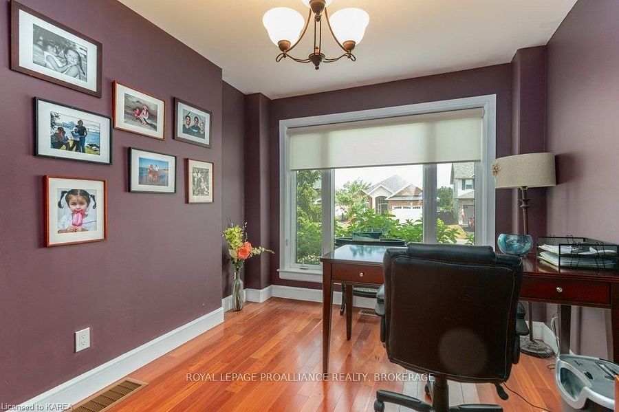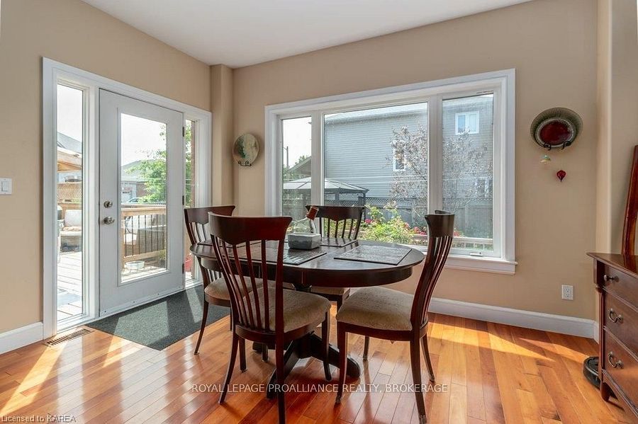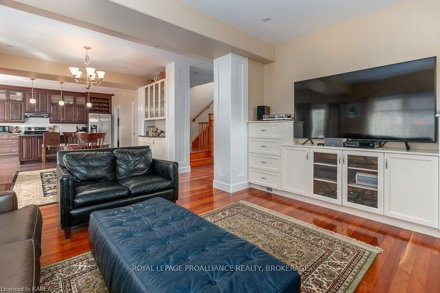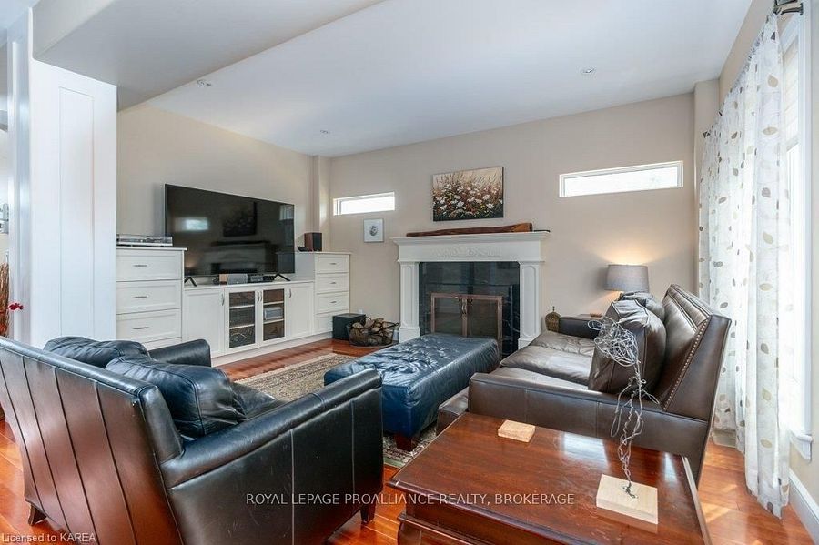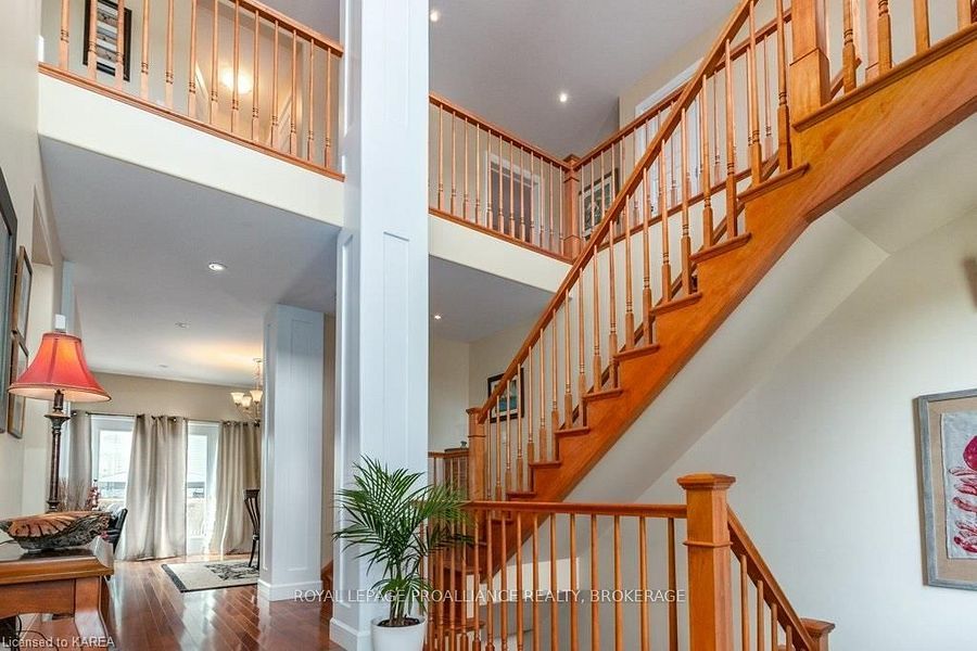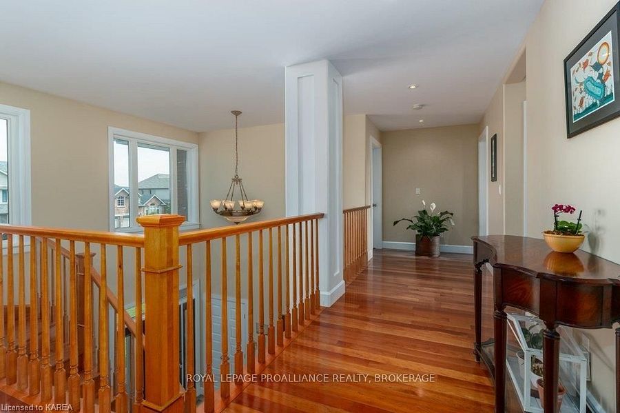 Modern luxury on a corner lot in cataraqui north. Bright, spacious, and beautifully finished, this 4+2 bedroom home offers refined living on a generous corner lot with a sunny south-facing backyard. The grand two-storey foyer features shaker-style columns and a striking cantilevered staircase leading to an open balcony landing. The main floors open-concept layout showcases cherry-wood floors, granite counters, transom windows, and custom built-ins. A large prep island anchors the cherry kitchen, complete with slow-close cabinetry and a walk-in pantry. Oversized windows flood the space with natural light, continuing upstairs into four spacious bedrooms. The primary suite includes patio doors to a juliet balcony and a stylish ensuite with a tiled walk-in shower and stone-topped vanity. The luxurious family bath features a roll-top clawfoot tub and separate shower. A second-floor laundry adds everyday convenience. The finished basement with 9-foot ceilings offers two additional bedrooms, a second kitchen, second laundry, and a large rec room, ideal for in-laws or teens. Outside, enjoy a covered gazebo patio, landscaped flower beds, and a deck with hot tub connections under a lean-to shelter. The property is equipped with hot tub and generator hookups, offering added comfort and peace of mind year-round. This home blends elegance and functionality perfect for families, entertainers, or multi-generational living.