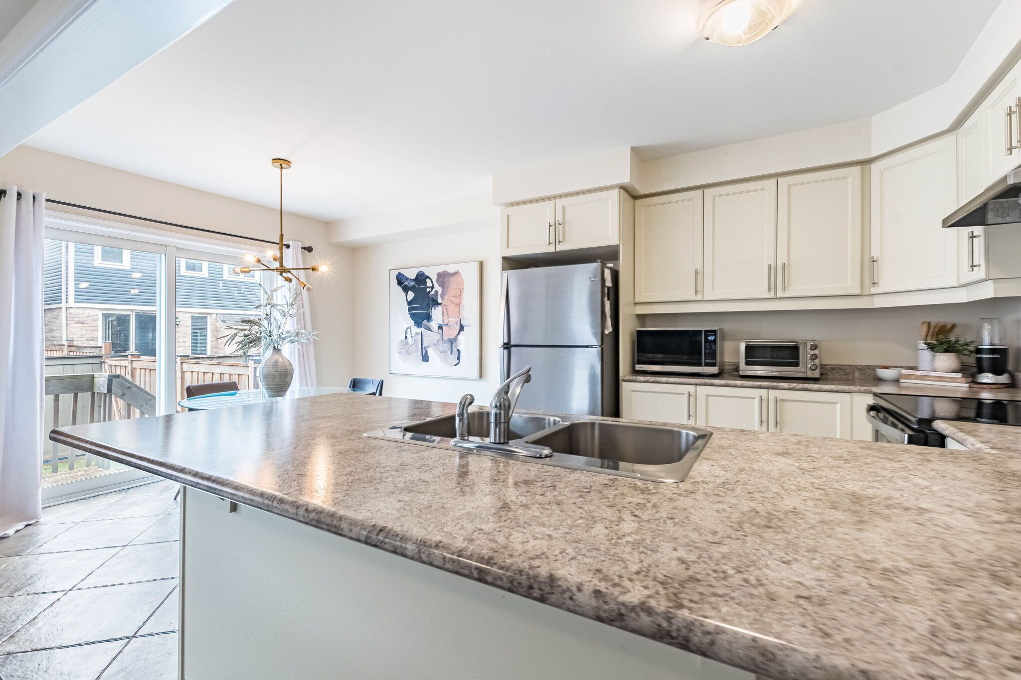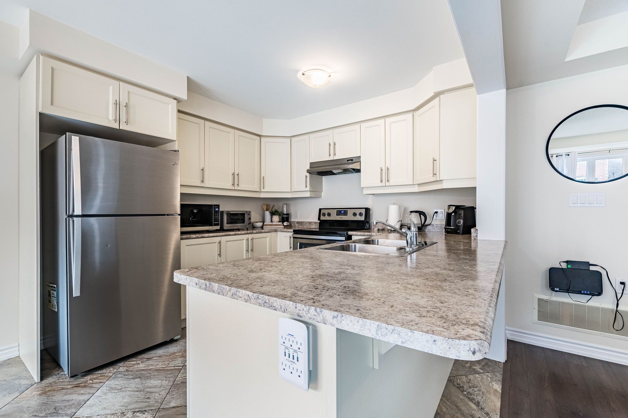 • Modern kitchen equipped with stainless steel appliances and breakfast bar.