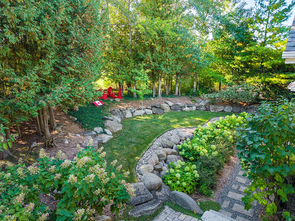 Introducing a stunning 5-bedroom custom residence by renowned builder dezign2000, perfectly situated in the exclusive lora bay community. Backing onto the driving range and surrounded by mature trees and landscaped gardens, this home offers luxurious seclusion and refined living. Inside, wide-plank oak floors, soaring ceilings, and timeless design set the tone. The gourmet kitchen features white shaker cabinetry, granite counters, gas cooktop, and walkout to a private terrace. The great room impresses with vaulted ceilings, custom built-ins, and a dramatic gas fireplace. The main-floor primary suite is a tranquil retreat with garden access, walk-in closet, and a spa-like ensuite with heated floors, soaker tub, and glass shower. A formal dining room (or office), powder room, laundry with garage access, and oversized double garage complete the main level. Upstairs offers two guest bedrooms, a sitting area, and a beautifully appointed bathroom. The finished lower level expands your space with two more bedrooms, a den, spacious rec. Room, bathroom with heated floors, large storage room, and cold cellar. Additional features include a built-in home audio system (ceiling and in-wall speakers, home audio connection), whole-house air purification system, brand-new furnace (march 2025). The exterior was fully painted in 2023. Outdoors, enjoy stone pathways, lush perennial gardens, and a private patio oasis. Just a short walk to the beautiful georgian trail system and minutes from thornbury. Lora bay residents enjoy two private beaches, championship golf, members lodge, dining, and curated social events. Indulge in a four season lifestyle that's sure to impress. Community fees (gcecc): $2,280/year.