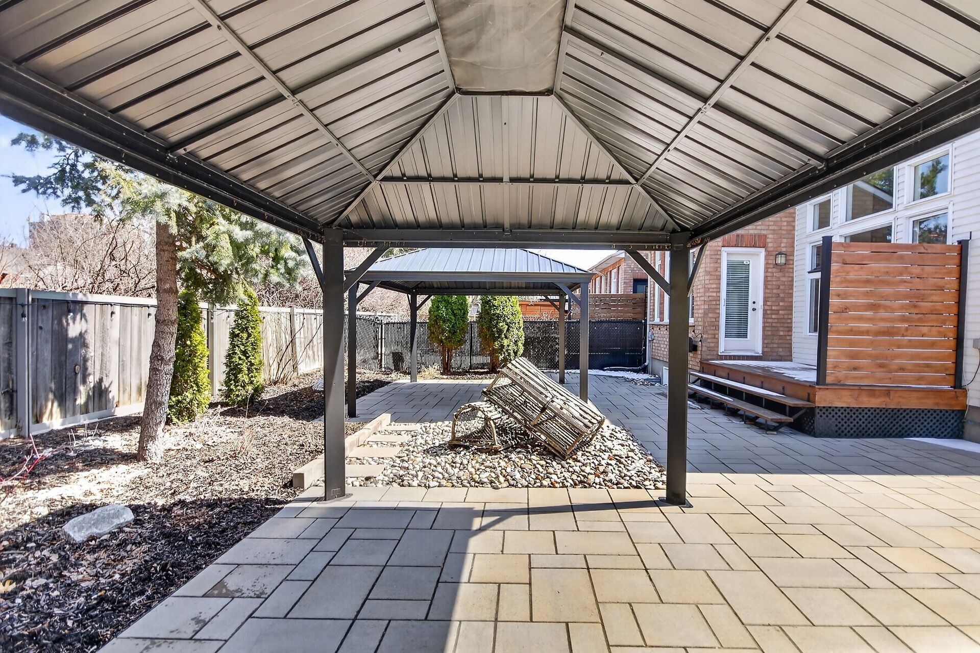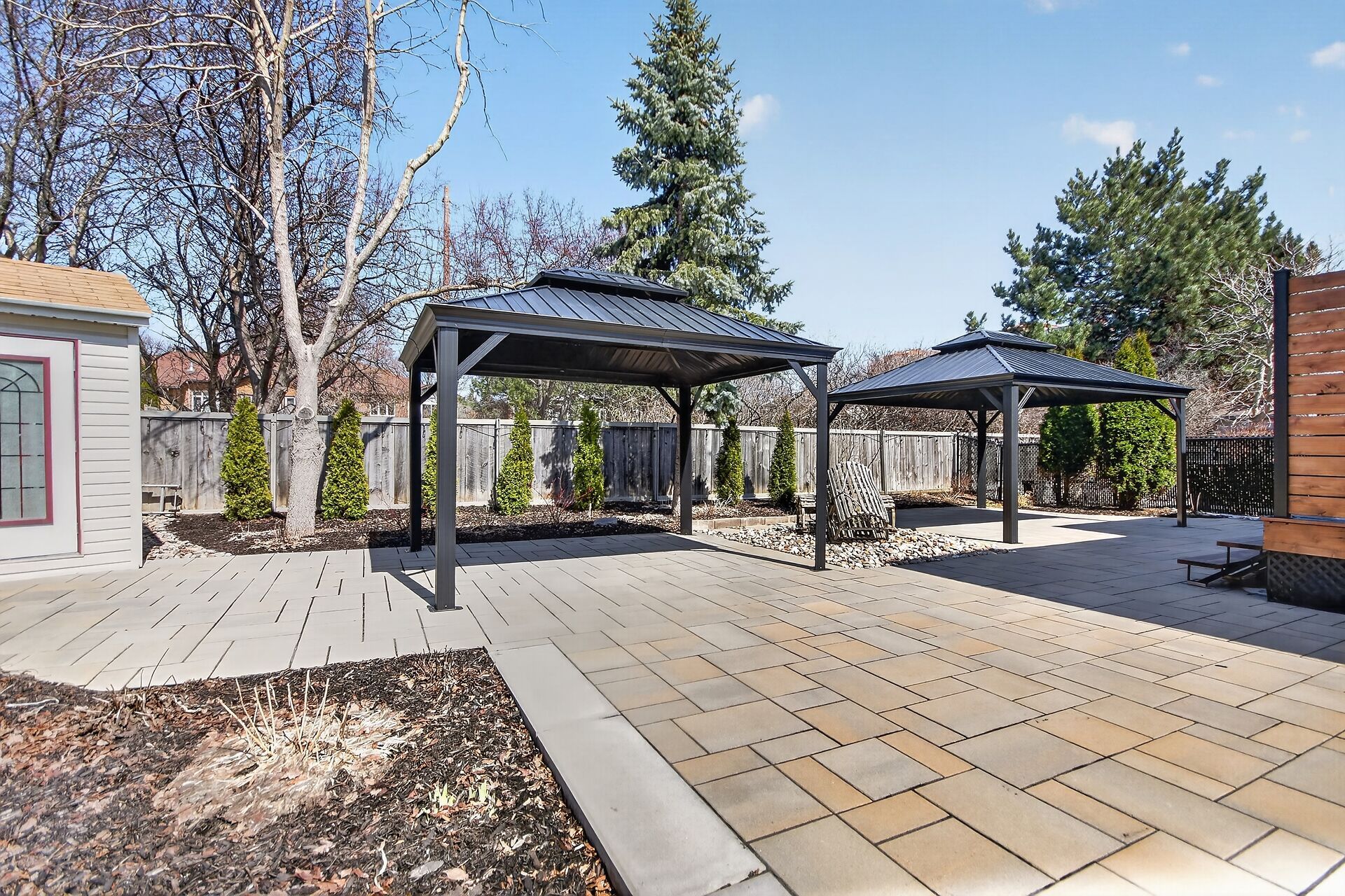 Set on an oversized, pie-shaped lot on one of the neighbourhood's most desirable streets, this executive end-unit townhouse offers a rare combination of space, design, and location. The exterior makes a strong first impression with extensive interlock and well-established perennial gardens. Inside, a completely carpet-free, split-level layout is filled with natural light and designed for effortless flow. The living and dining areas are anchored by a refined fireplace, while the main floor solarium provides a flexible space for a home office, lounge, or quiet retreat. The kitchen is both stylish and functional, featuring granite countertops, abundant cabinetry, a walk-in pantry, and stainless steel appliances, including an induction stove and french door refrigerator. Upstairs, a versatile loft complements the primary suite and an additional generously sized bedroom. The finished lower level adds valuable living space with a large recreation room and second fireplace, an extra bedroom, laundry, and storage. A double-car garage with inside entry adds everyday convenience. The backyard is a standout feature - private, beautifully landscaped, and thoughtfully designed with extensive stonework and two gazebos, creating distinct areas for dining and relaxation. Ideally located just steps to shops, dining, and entertainment, this home offers an exceptional balance of comfort, style, and walkability. Lot size: 27. 82 x 118. 05 x 68. 61 x 108. 06