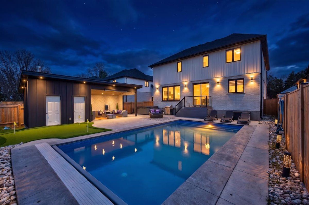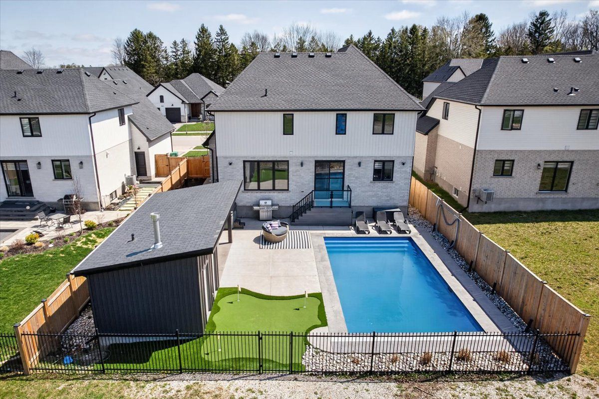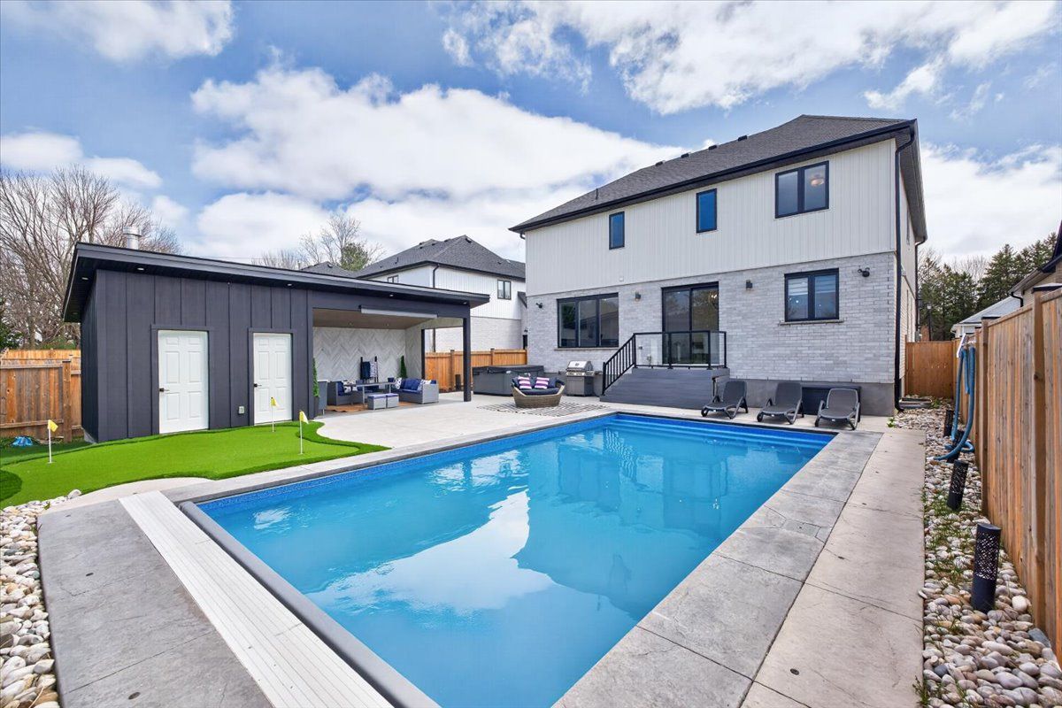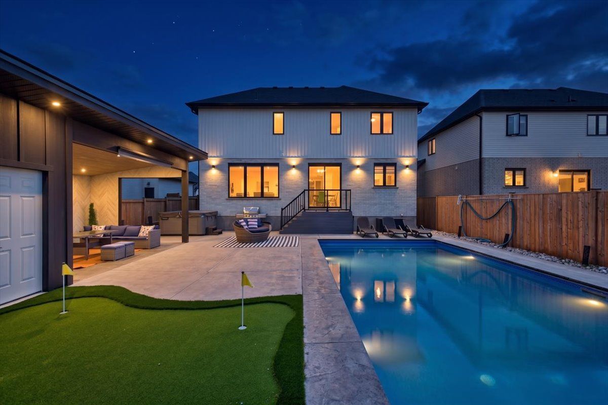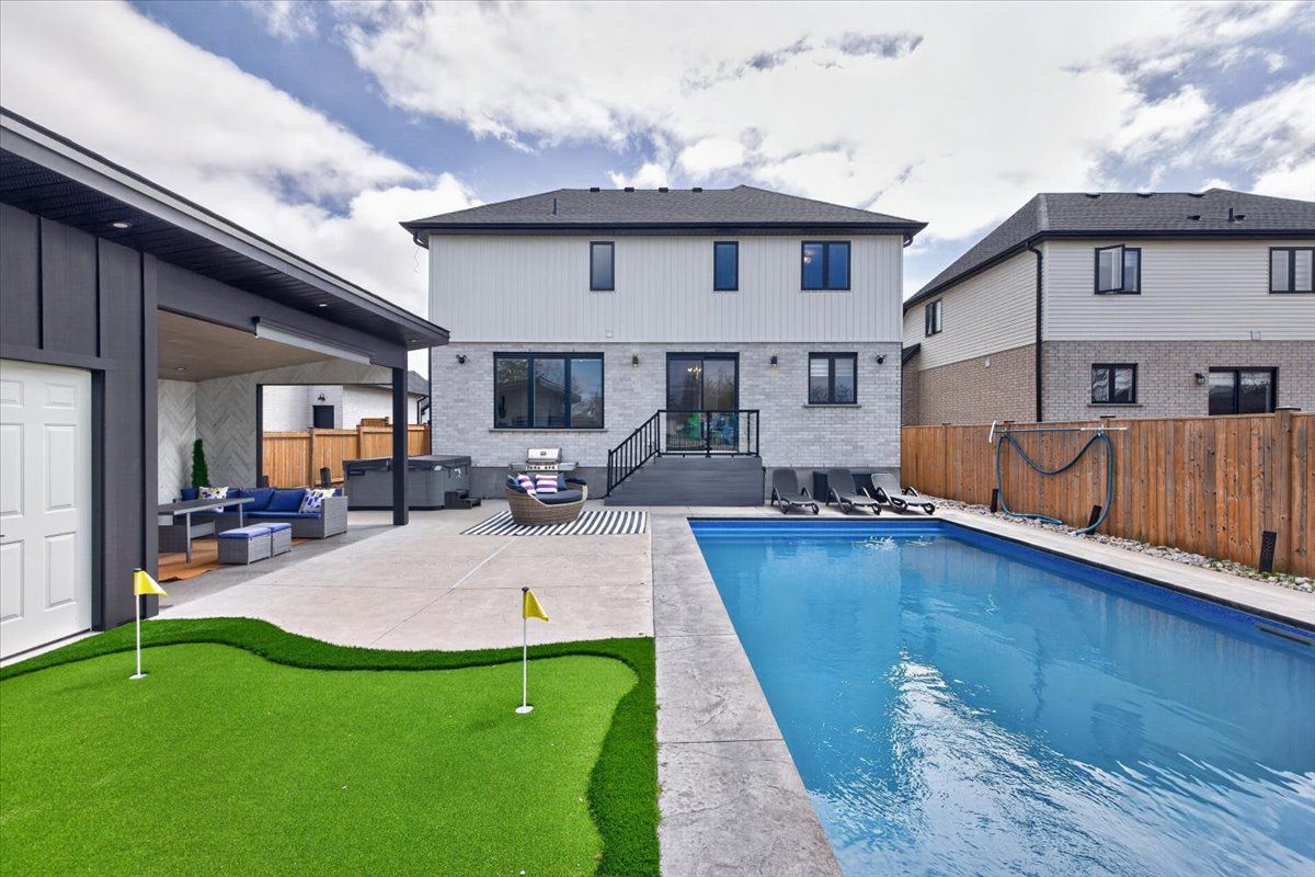 Located in talbotville meadows, this stunning 2 storey home offers 4+1 bedrooms, 4. 5 bathrooms, a double car garage, and a premium lot backing directly onto talbotville optimist heritage park. The property features an in-ground heated saltwater pool and a pool cabana, ideal for indoor and outdoor living. The main floor includes a bright front office, formal dining room, and a butler's pantry with wet bar, beverage fridge, and walk-in pantry connecting through to the kitchen. The kitchen features a large centre island, quartz countertops, tile backsplash, pot filler, and apron-front sink, along with a spacious eating area and walkout to the backyard. The open-concept living room features a fireplace and is designed for both everyday living and entertaining. A 2-piece powder room and a dedicated laundry room with storage and access to the garage complete the main level. Upstairs, the primary bedroom is set behind double doors and includes a 5-piece ensuite with double vanities, soaker tub, and walk-in shower, along with a large walk-in closet (10'9" x 10'). The second bedroom features its own private 3-piece ensuite, while two additional bedrooms share a 5-piece main bathroom. The fully finished lower level adds a fifth bedroom, 3-piece bathroom, and a large rec room offering flexible use. The backyard is designed for both relaxation and entertaining, with a heated saltwater pool, electronic safety cover, concrete patio, gas bbq hookup, and a private putting green. The pool cabana is fully serviced with plumbing and electricity and includes a covered seating area with wet bar, change room with bathroom, and a dedicated pump room. Talbotville meadows is a growing community offering a quieter setting just minutes from st. Thomas and a short drive to london, with convenient access to highway 401. The neighbourhood is known for its newer homes, access to green space, and proximity to parks like talbotville optimist heritage park.