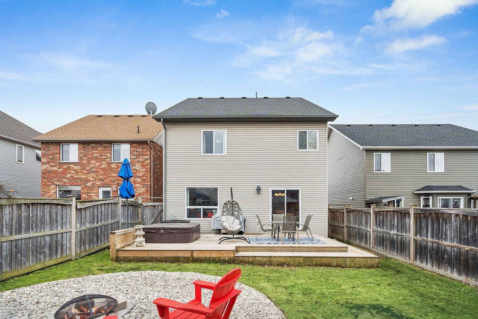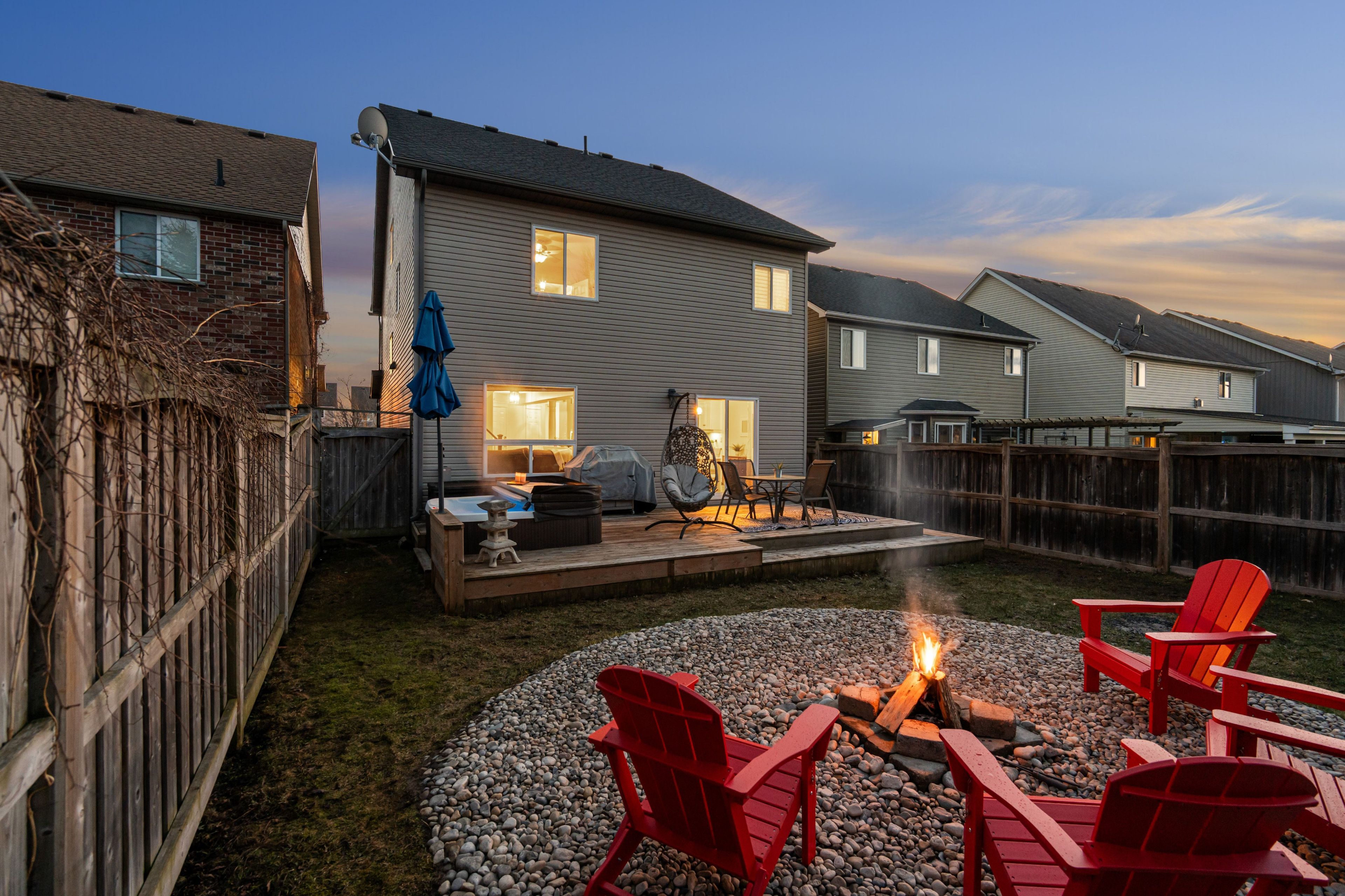 • Private backyard with deck and hot tub, great for gatherings and relaxation.