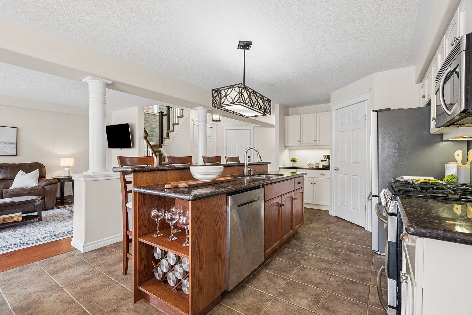 • Functional kitchen with island, pantry, and easy access to backyard deck.