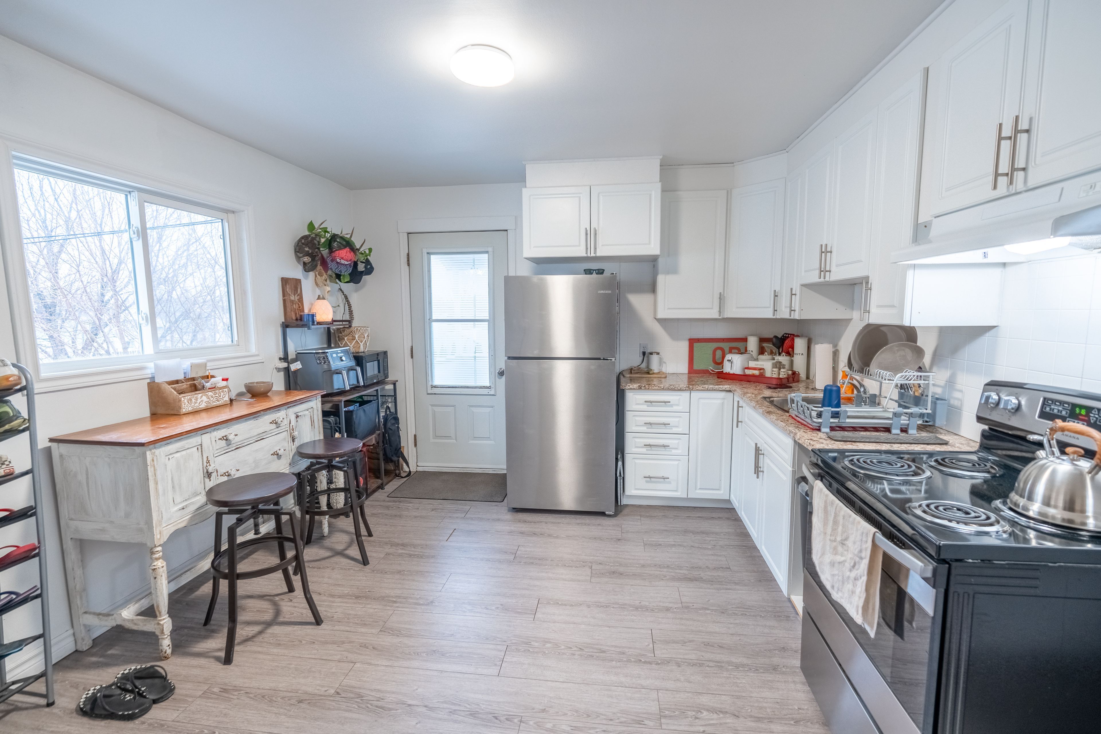 • Upper unit includes updated kitchen, bathroom, and laundry hookups for convenience.