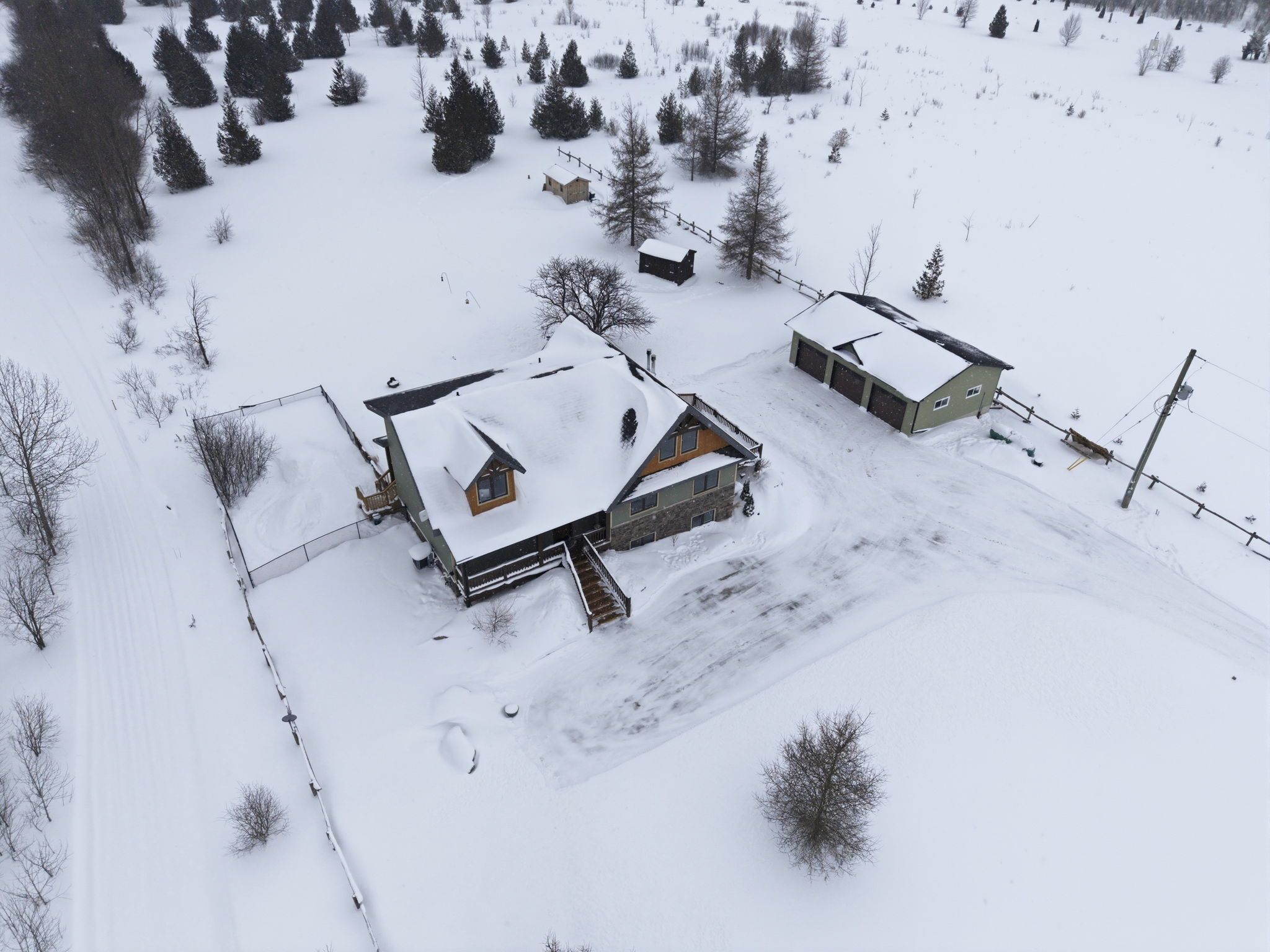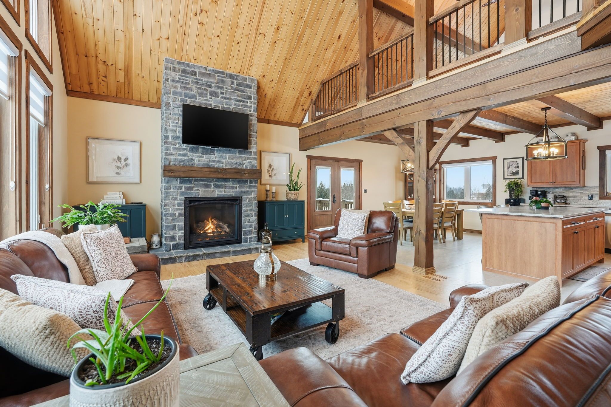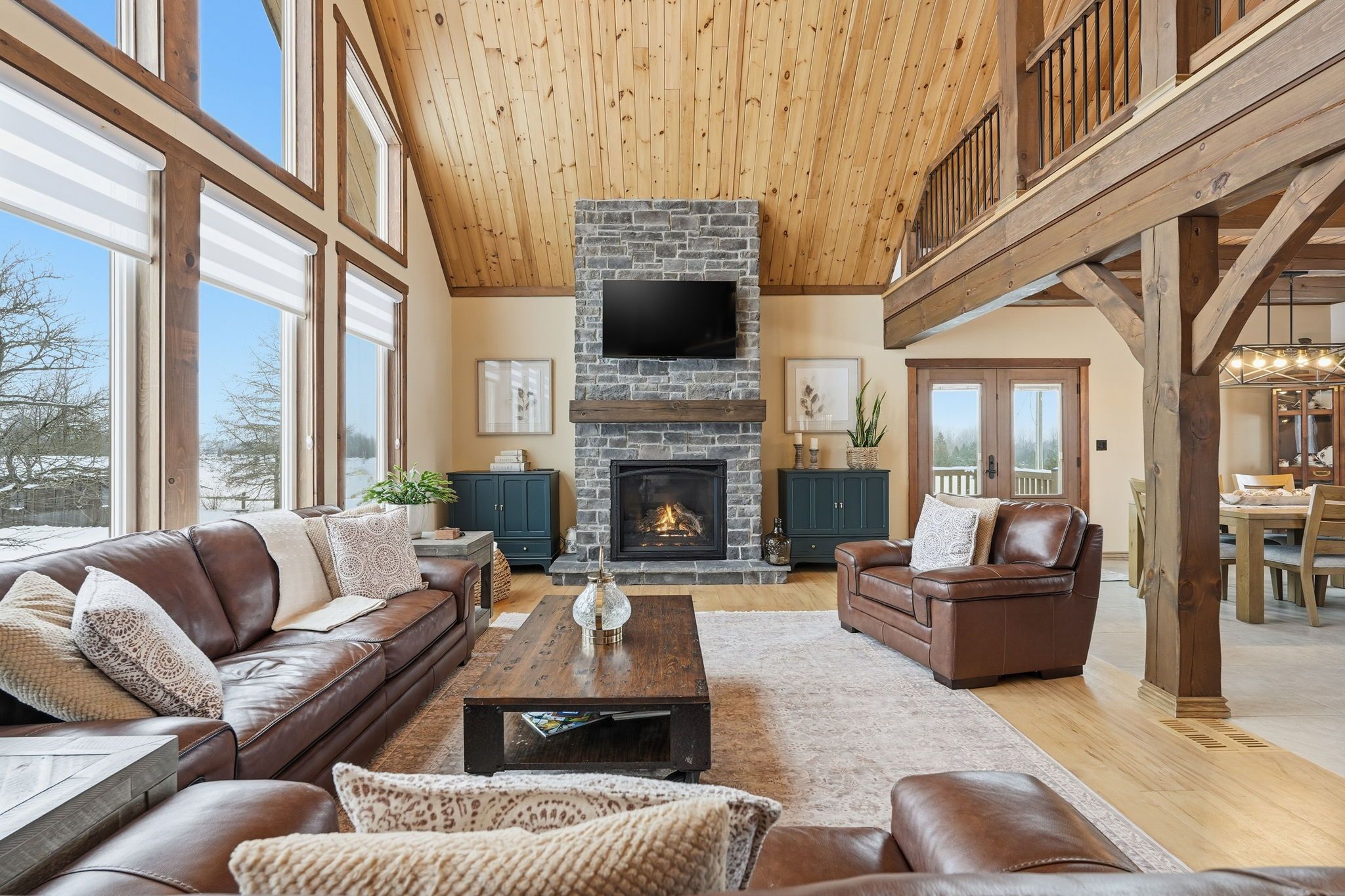 Welcome to this truly special 3-bedroom, 3-bathroom timber-framed home, perfectly set on a beautifully landscaped almost 5. 5-acre lot just a hop, skip, and a jump from mount forest. The heart of the home is the spectacular great room, featuring vaulted ceilings, a floor-to-ceiling stone fireplace, and a stunning wall of windows that frames peaceful views of the surrounding nature. A spacious loft overlooks the great room, offering flexible space for a home office, reading nook, or guest area. The large, open-concept kitchen flows seamlessly into the great room-ideal for entertaining or everyday living. The main-floor primary bedroom provides comfort and convenience, while the finished lower level impresses with high ceilings, large windows, heated floors, and an additional stone fireplace, creating a warm and inviting retreat. Outside, the property truly shines with a picturesque pond, mature landscaping, and endless room to enjoy the outdoors. Car enthusiasts, hobbyists, or tradespeople will love the massive 24' x 36' detached garage/workshop. This is country living at its best. Rsa.
