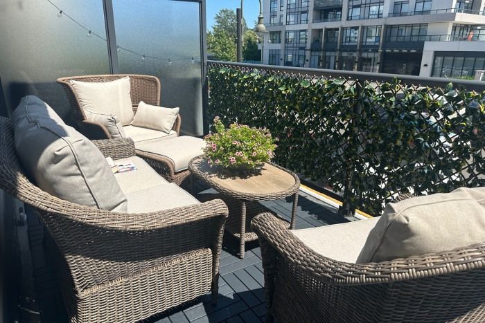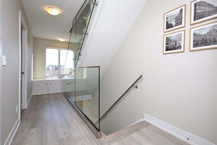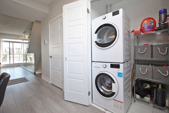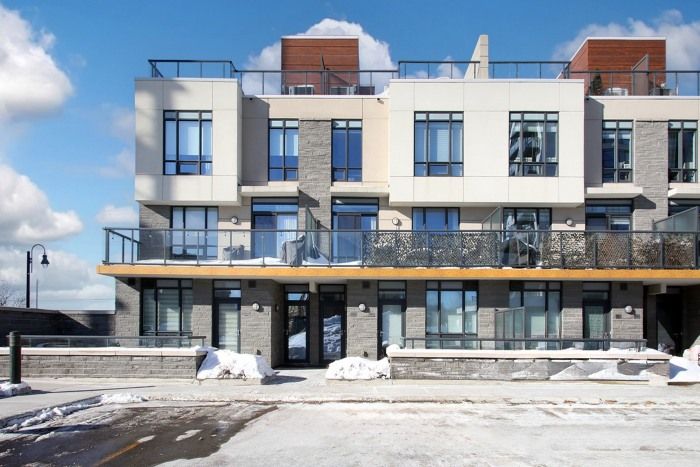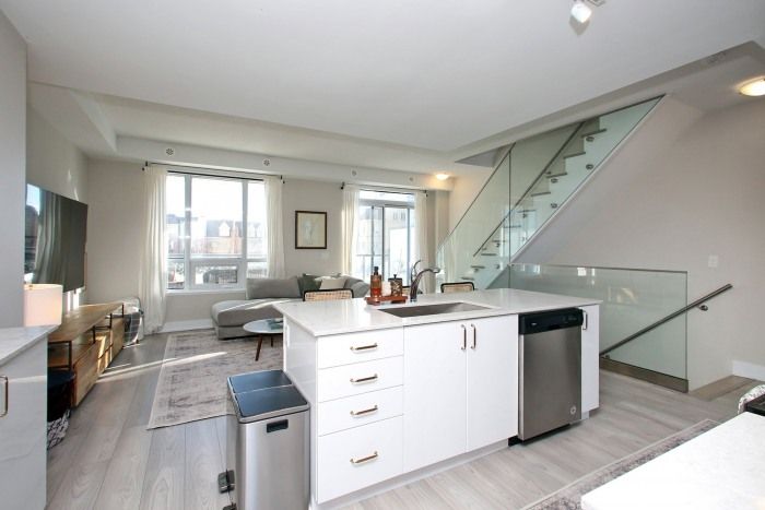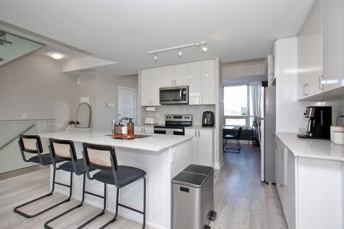 Welcome to this modern townhome, built in 2019 and part of the award-winning miami inspired sf3 collection, offering over 2,200 sq. Ft beautifully designed indoor and outdoor living space. This 3-bedroom, 3-bathroom home combines style, comfort, and functionality. Inside, you'll find a glass and oak staircase, laminate flooring, and smart-home motorized blinds, creating a bright, modern feel. The home also offers ample storage and two parking spaces for convenience. The open-concept second floor is perfect for everyday living and entertaining, with a flowing kitchen, dining, and living area. Large windows open onto a south-facing balcony, filling the space with natural light and providing a wonderful spot to relax. Step up to your private rooftop terrace, an ideal retreat for hosting or unwinding. It includes a gas connection for a barbecue, making indoor-outdoor living effortless. Residents enjoy exceptional community amenities, including an outdoor pool, hot tub, lounge area, bbq area, exercise room, and party/meeting room, guest suites, offering fun and convenience for all ages. With multiple outdoor spaces, modern finishes, and a versatile layout, this townhome is an excellent choice for anyone seeking comfortable, contemporary living in a vibrant, thoughtfully designed community. A fantastic bonus is that high-speed wifi is included in the maintenance fees, and the location truly stands out, just a short walk to the go station for effortless commuting and the waterfront for scenic strolls and year-round enjoyment.