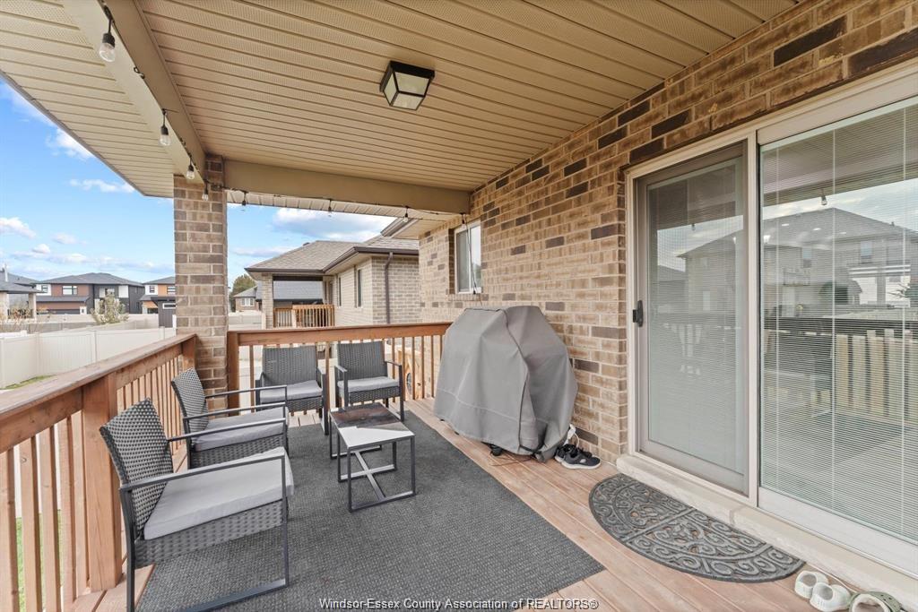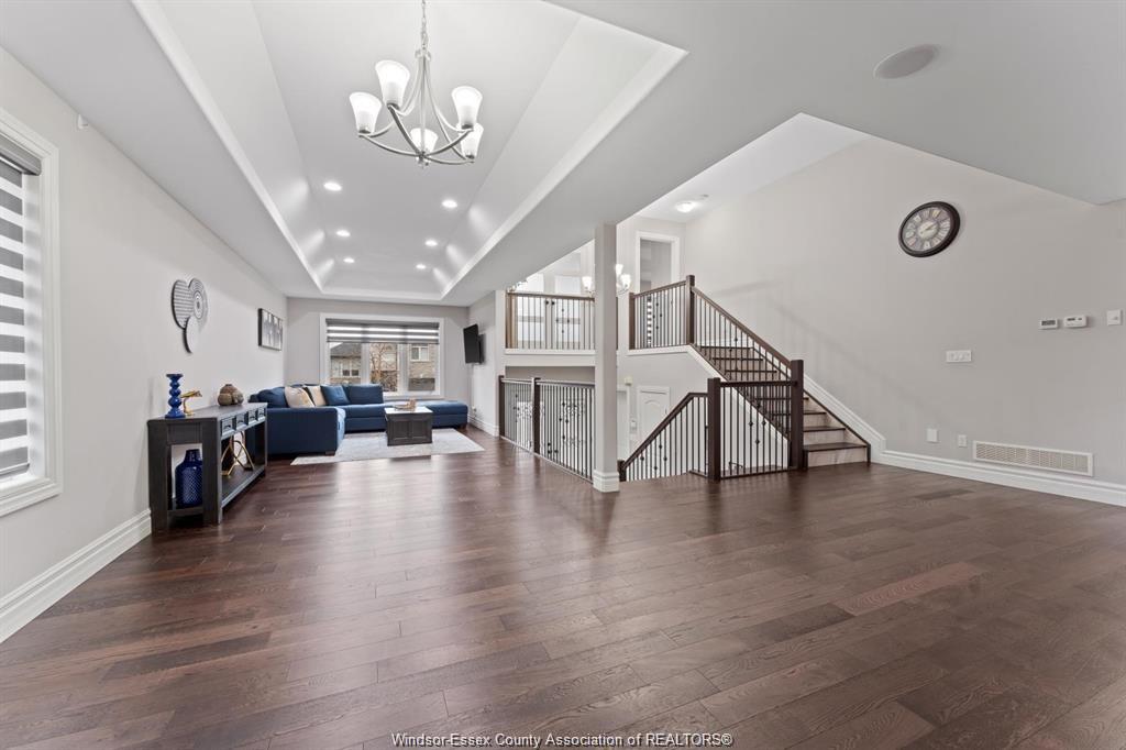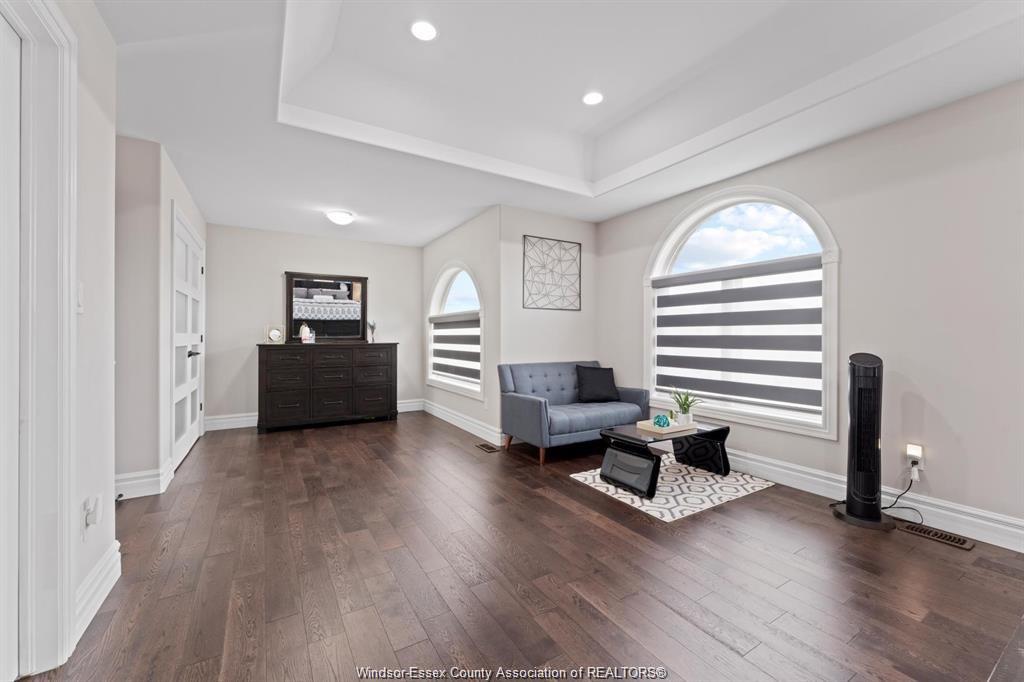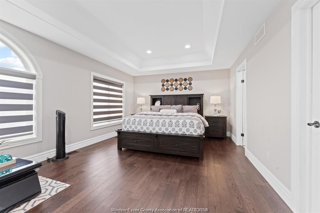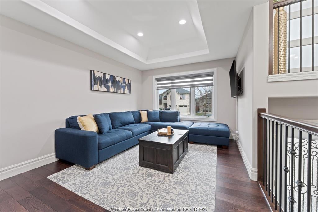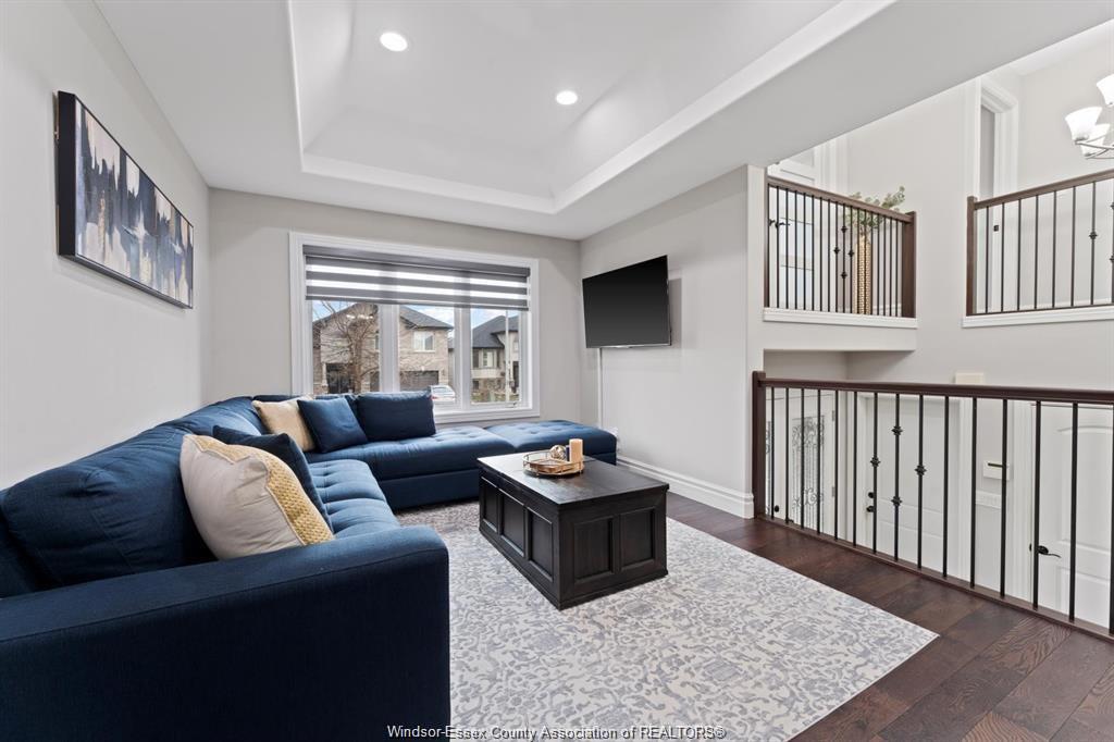 Stunning family home, boasts a large entrance with an open concept living space and features a well appointed kitchen with upgraded stainless appliances and granite tops, offering quality flooring throughout with custom trayed ceilings . Main floor offers two bedrooms plus an attractive super sized bonus room with a gorgeous ensuite, walk-in closet and double frosted doors that open to a balcony overlooking the main floor. Enjoy the fully finished basement having a large area with wet bar open to rec room with attractive stone fireplace for relaxing nights . Complete with large 3pc bath ,2 additional bedrooms ,great laundry area and grade entrance for your convenience. Enjoy the private fenced back yard with covered deck and patio areas. Large garage complete with electric car hook up. Fantastic location in south windsor.