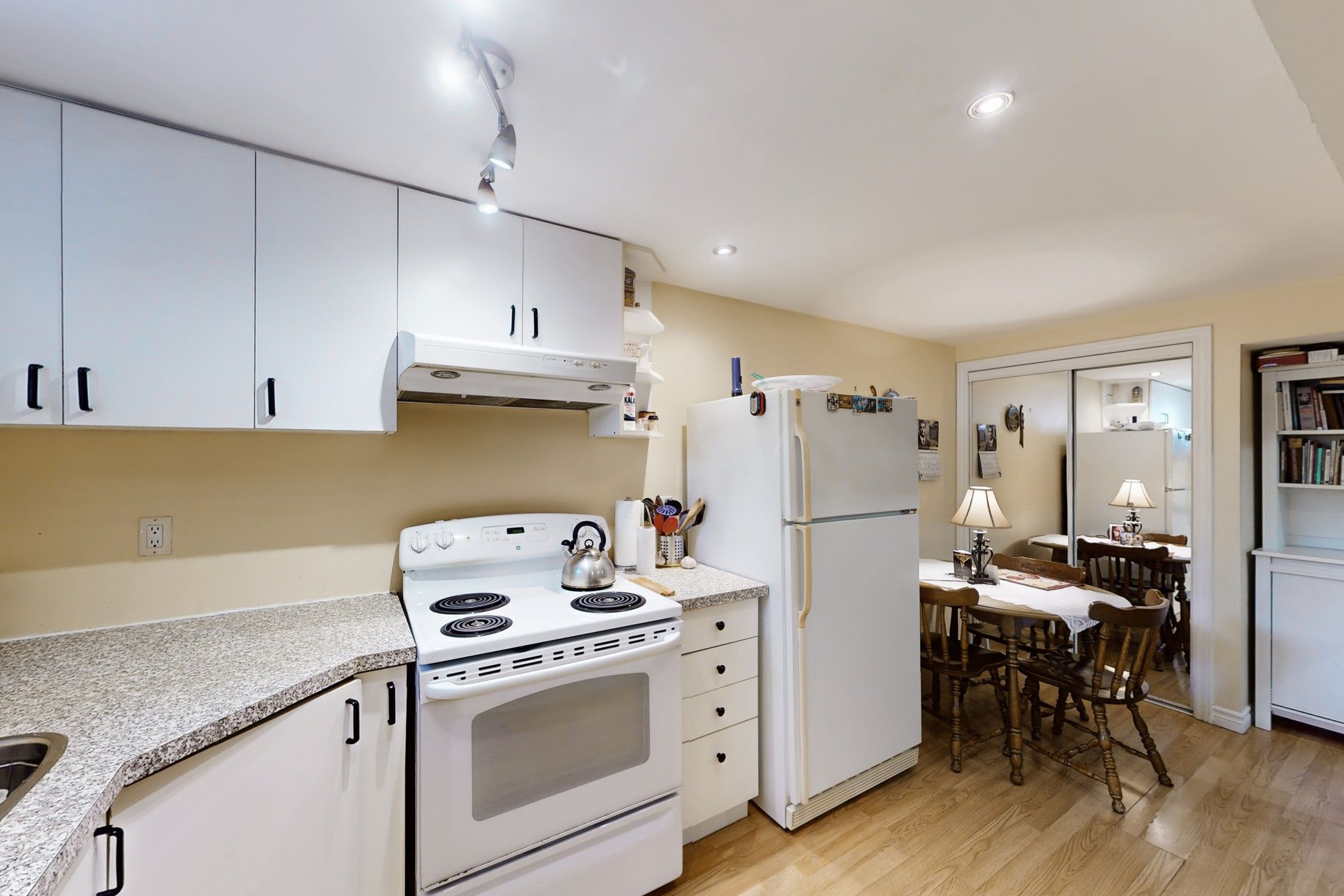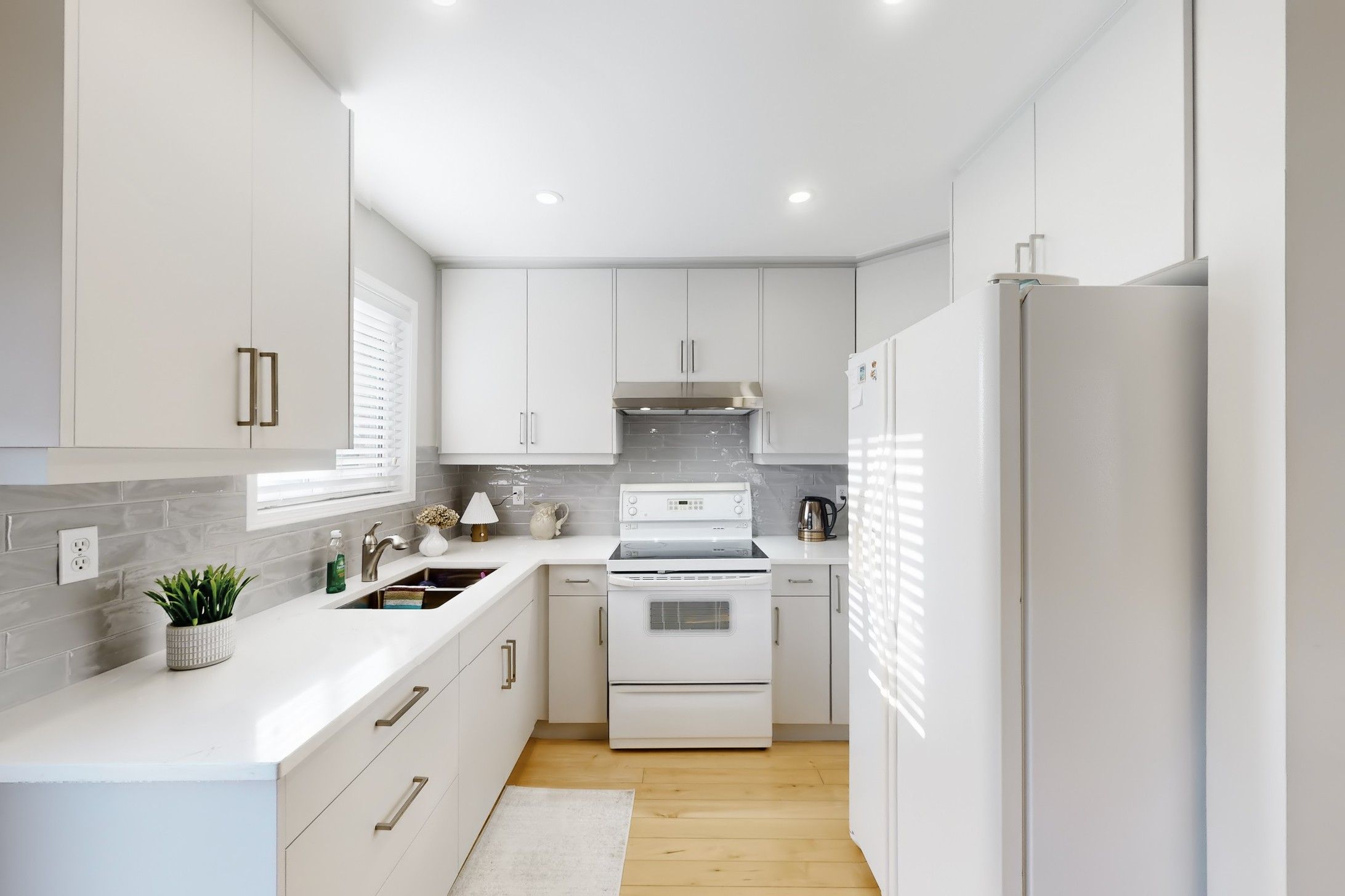 • Bright renovated kitchen with modern upgrades and ample space.