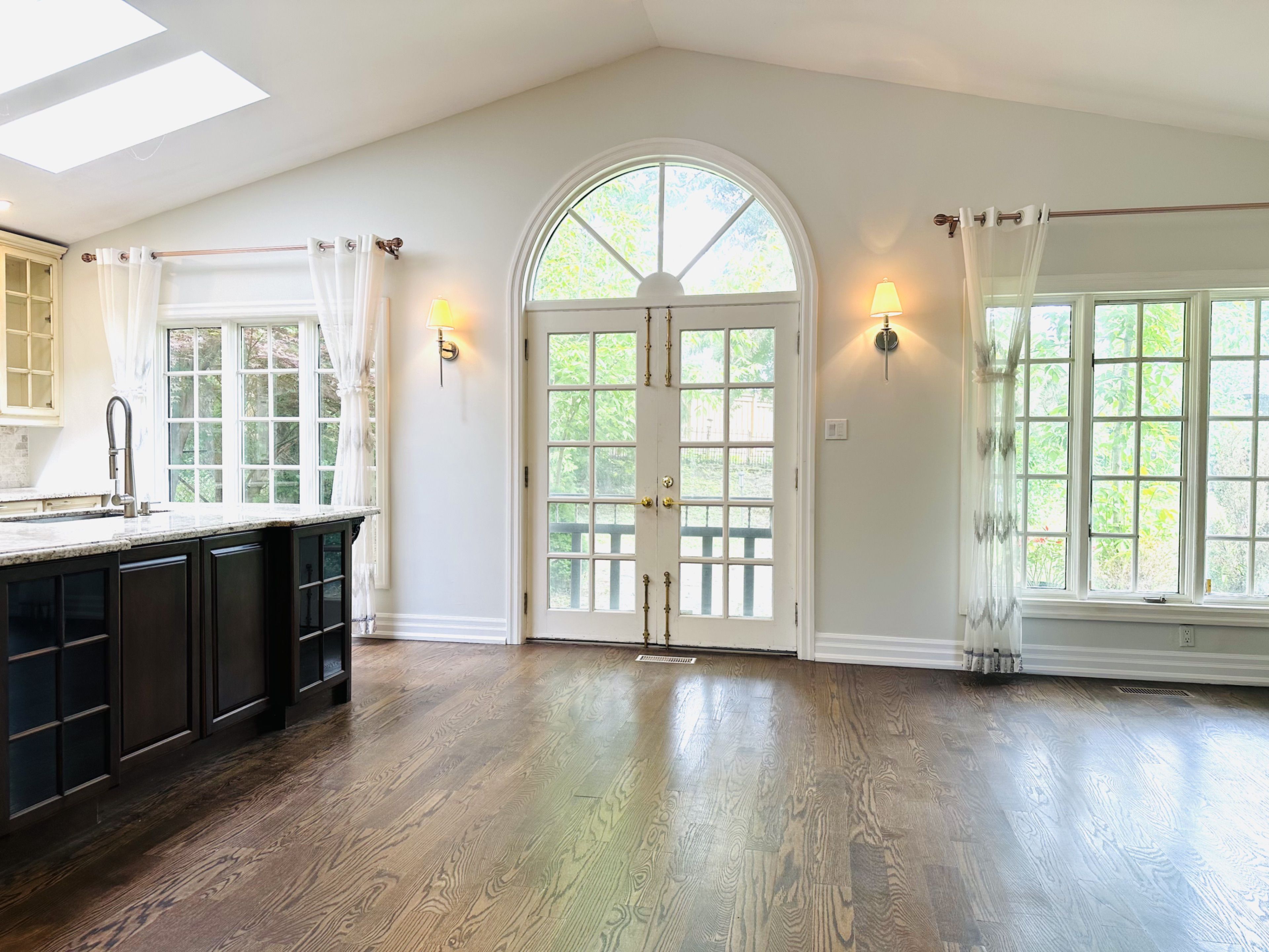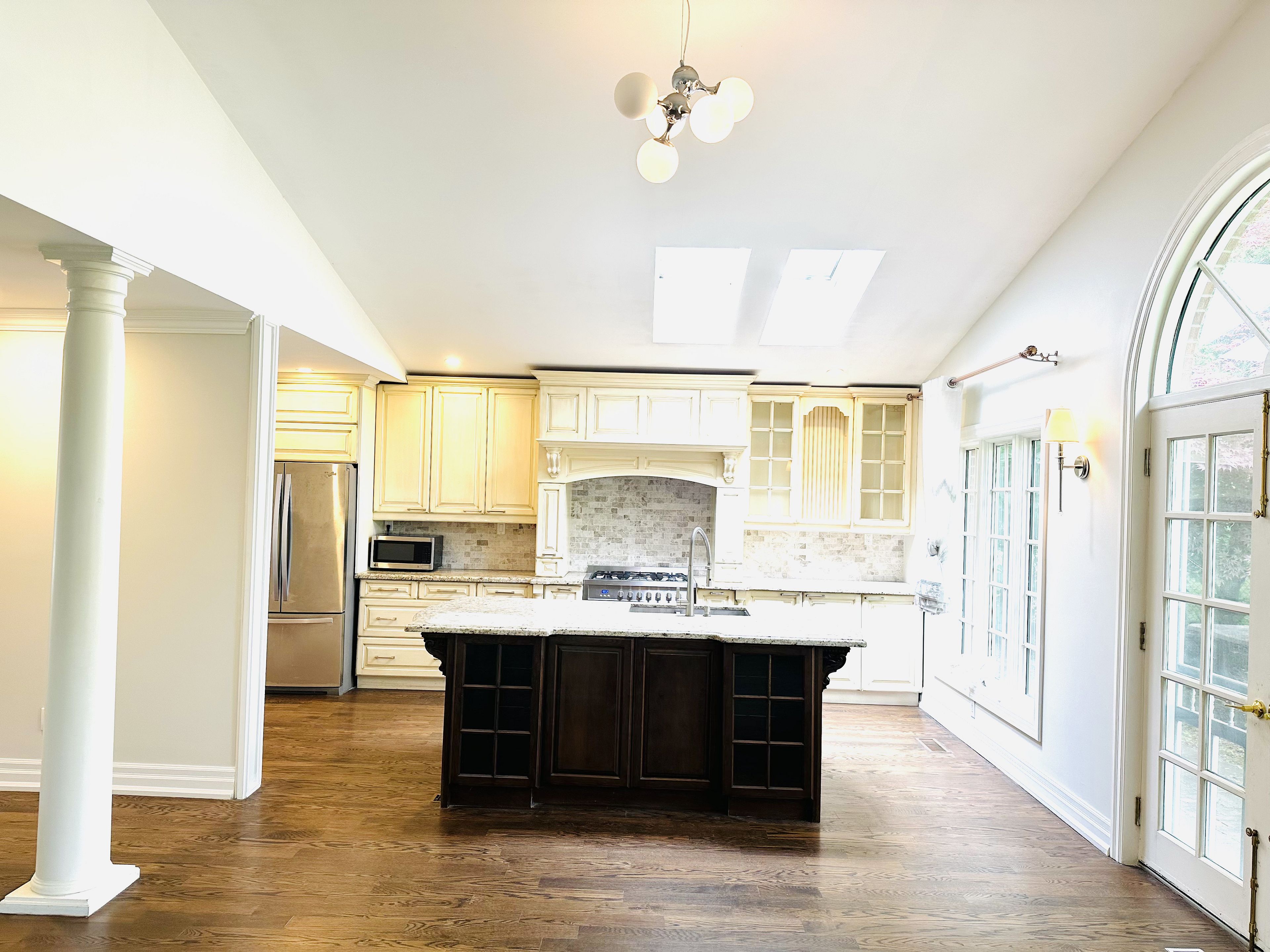 • Bright, open-concept kitchen and family room with cathedral ceiling and skylights.