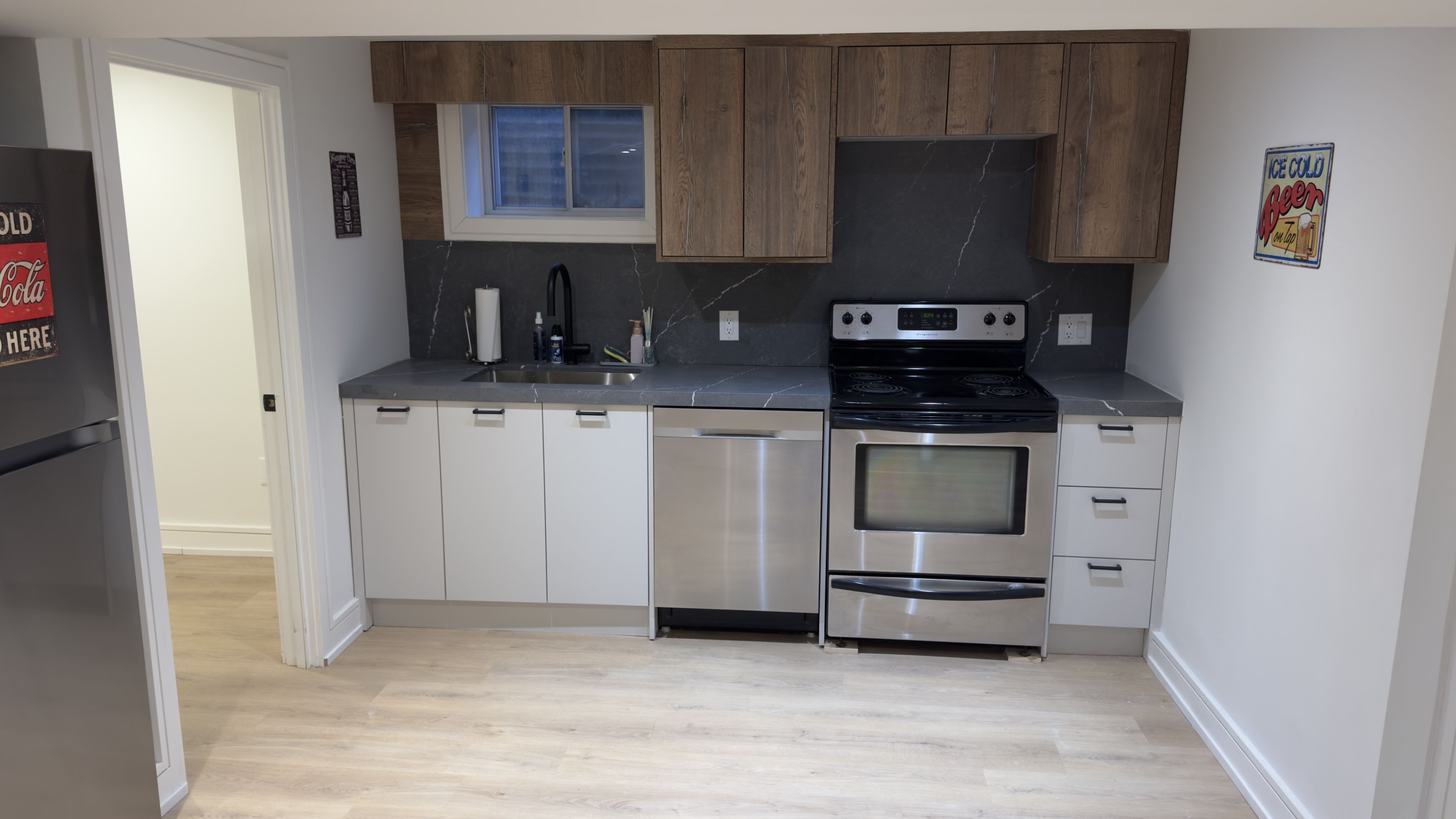 • Modern kitchen equipped with stove, dishwasher, fridge, and sink.