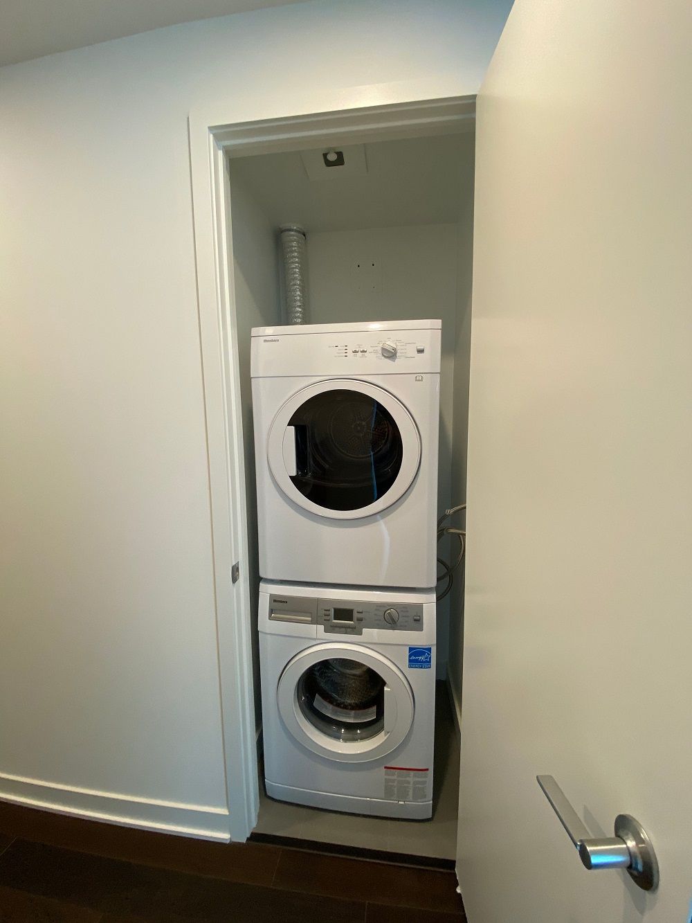 5 years new building. Lived in luxury king blue condo with 1 bedroom+den . Steps to ttc, underground path, restaurants, shopping, arts centres /theaters, hospitals & universities, financial district, grocery stores, and more! Extras: all elf's, fridge, stove, microwave, washer and dryer, light fixtures