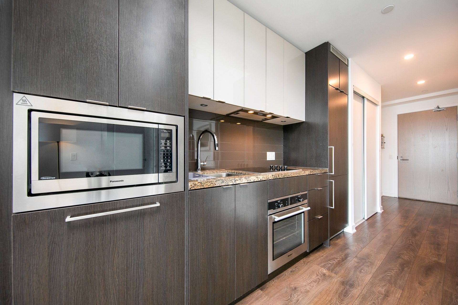 • Modern kitchen features built-in appliances and quartz countertops.