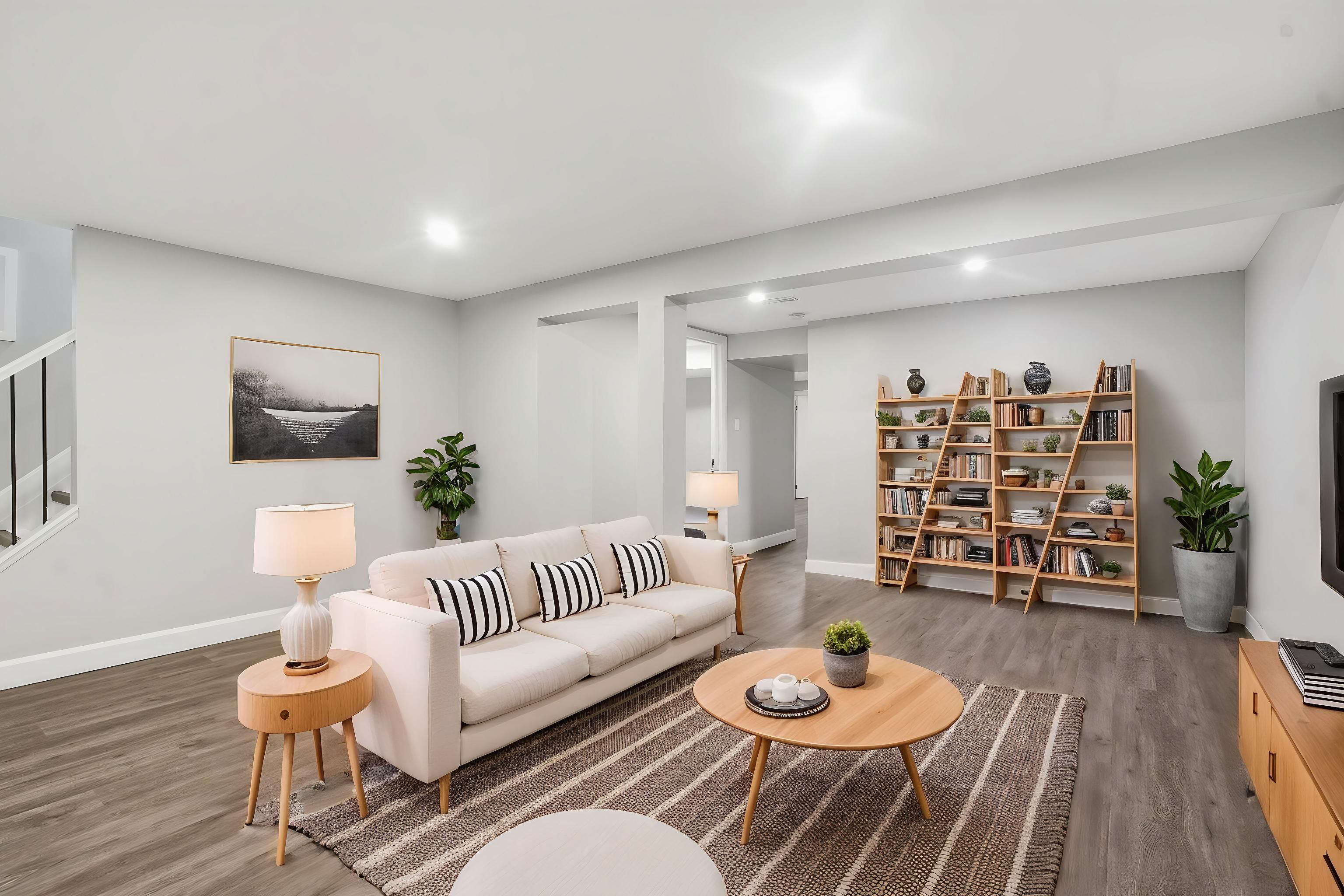 • Lower level features family room, bathroom, and versatile bonus room.