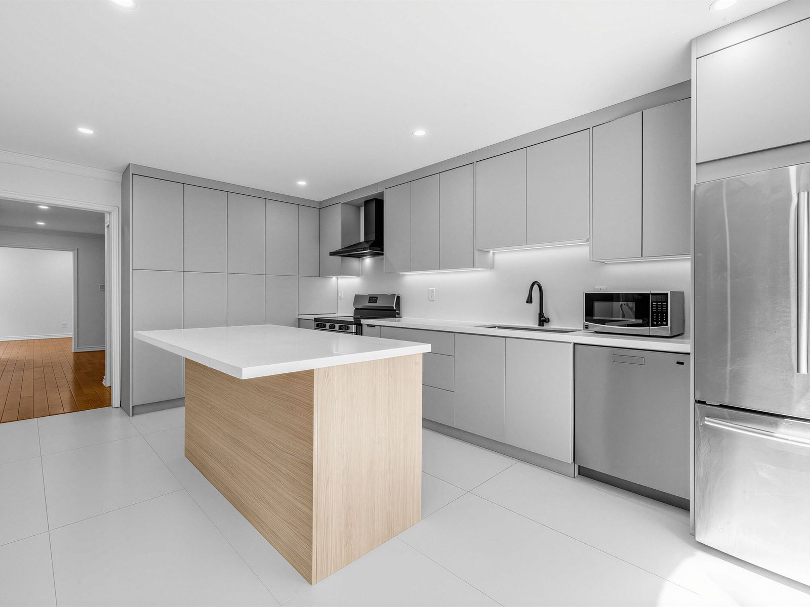 • Modern chef's kitchen featuring stainless steel appliances and an island.