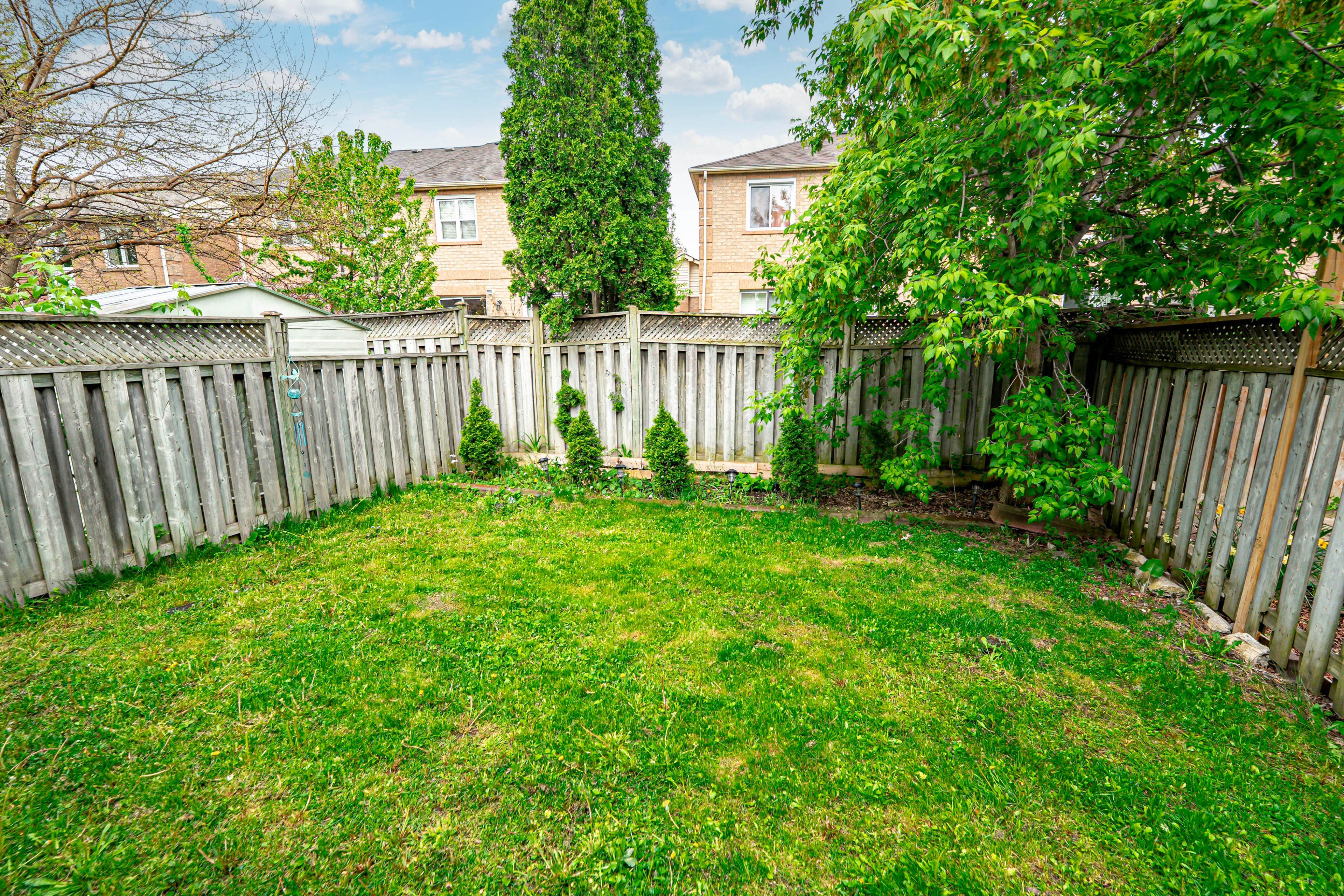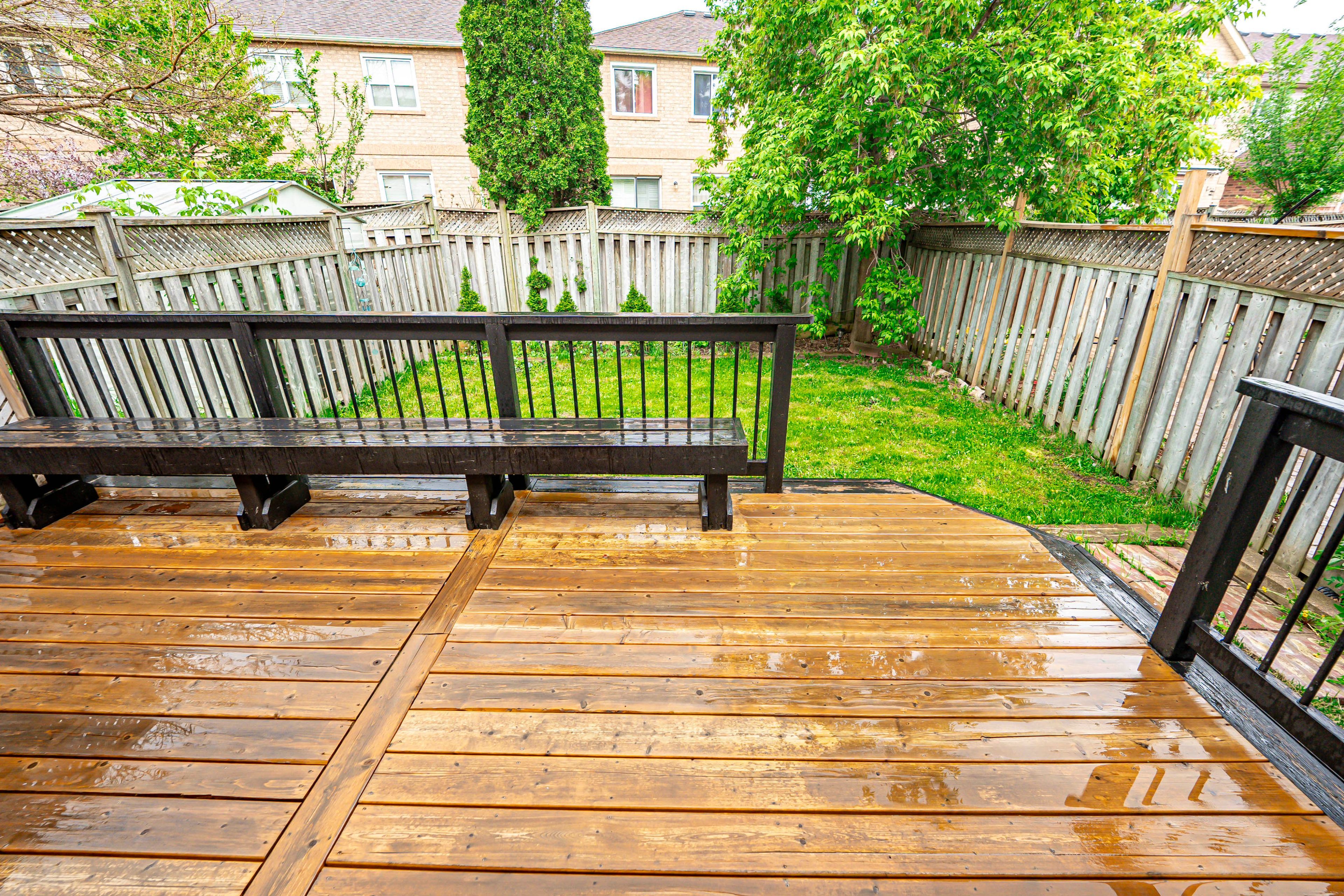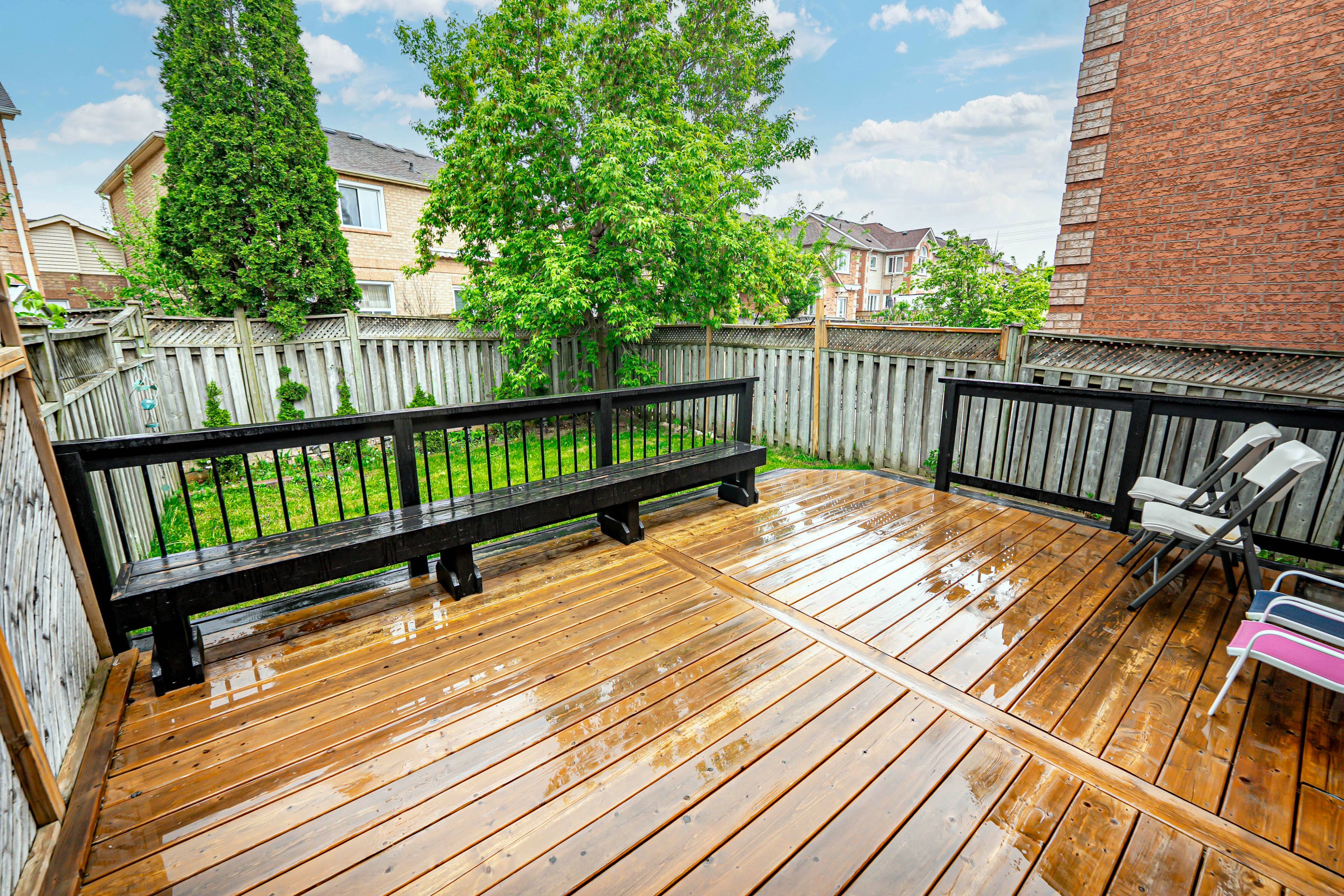 • Private backyard oasis with a large deck and mature trees.
